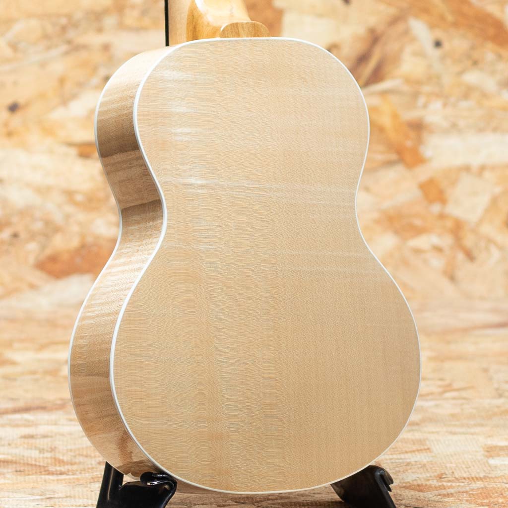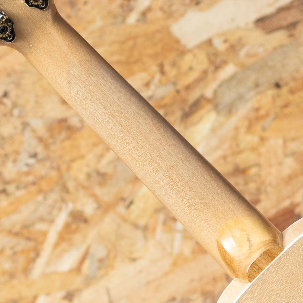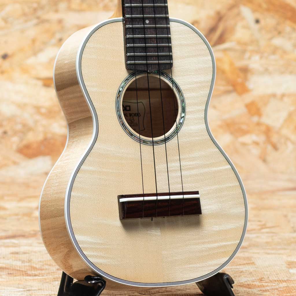 京都市の工房にて占部英明氏、息子の直宏氏によって製作されるハンドメイドウクレレ。本器はきれいな杢のシカモア材を使用したミディアムモデル。ホワイトシカモアボディ、リンデンネック、ウェンジ指板、ローズウッドブリッジ、ホワイトバインディング、アバロンロゼッタ、グローバー製ギヤペグ。表板には特にきれいなカーリー杢が使用されており、見た目も美しい1本です。占部ウクレレ特有のやや薄めで握り易いネックシェイプ、0フレット仕様でローポジションの弾き易さは格別。近頃人気の高いシカモアモデルです。
