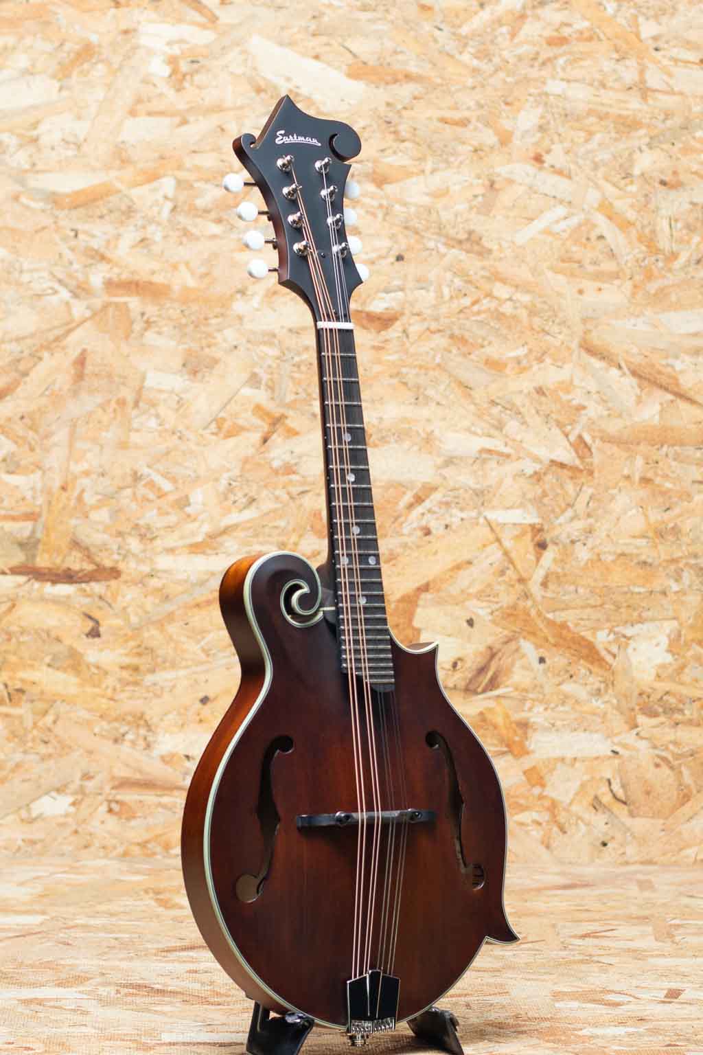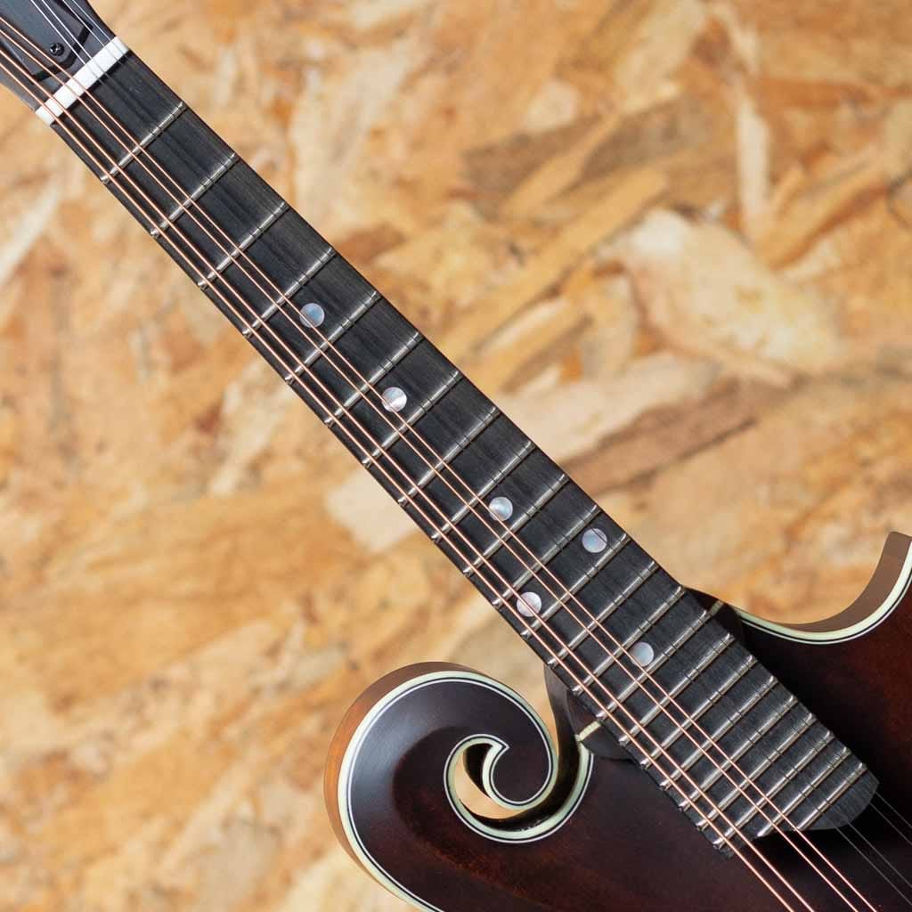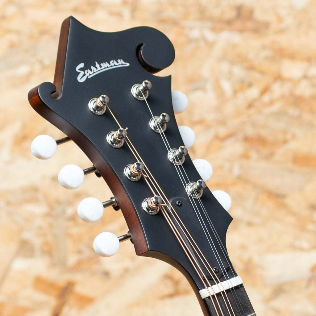 オール単板削り出しという音に拘るスペックをもちながらもリーズナブルな価格で人気のEastman Mandolin。見た目の装飾をシンプルに仕上げ、艶消しマットフィニッシュに仕上る事でコストダウンをはかり、音の要と言える単板スプルーストップ&メイプルバックのアーチを単板削り出し、サイドもメイプル単板のオール単板にて製作したコストパーフォーマンスに優れたモデルです。こちらは現在海外でも評価が高くマンドリンに取付の人気のP.U”K&K Duotone”を搭載しており、アコースティックなサウンドをライブで使用できるエレクトリックマンドリンになっています。メイプルネック、エボニー指板&ブリッジ、オリジナルアルミテールピースです。Style-Fのfホールフラットマンドリン。パンチのある力強い出音にキレの良さがあるまさにブルーグラス向けのモデルです。価格以上のスペック&鳴りをもち、初心者の方のファーストマンドリンはもちろん、エレクトリックなバンドでのライブ使用でのマンドリンとしてもおすすめです。オリジナルギグバッグ付属