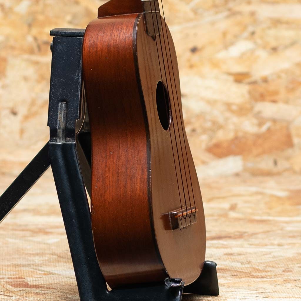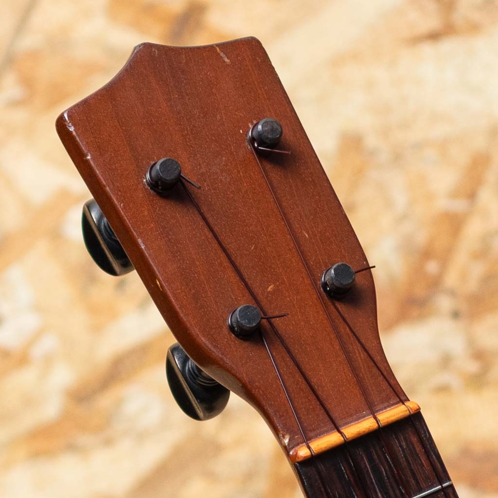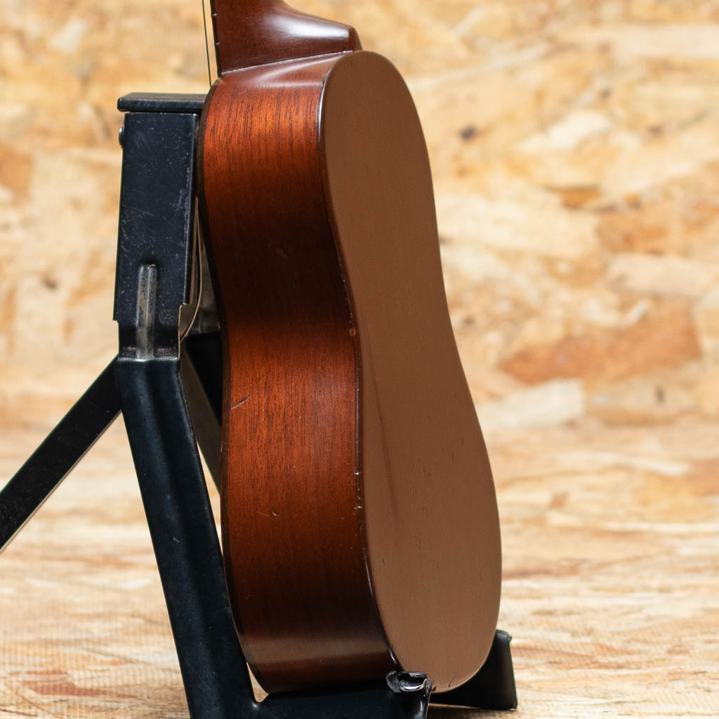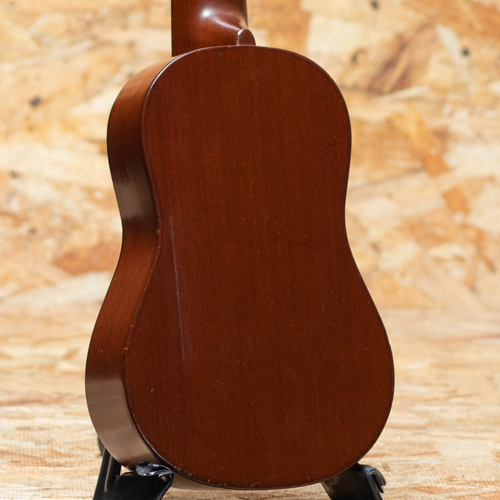 当時、ボストンのオリバー・ディットソンという出版会社の為にマーチン社が製作した"Style-1"。本器はニューヨーク支店でのみ取り扱われたドレッドノートシェイプの一本。1915年から1927年にかけて製作されたモデルですが、本個体はボディ内部にも刻印があることから、比較的初期の生産品と推測されます。マホガニーボディ、マホガニーネック、ハカランダ指板、マホガニーブリッジ。ドレッドノートシェイプのより広い音響空間から、美しく独特な音色を生み出します。糸巻きがバイオリン用に付け替えされているほか、トップ指板縁から3センチ、バックには7センチ強のクラック補修がございます。また、全体的にリフィニッシュがされていますが、既に経年を経たビンテージライクな雰囲気を漂わせています。ビンテージウクレレマニア向けコレクターズアイテム、ぜひご検討くださいませ。比較的新しいチップボードケースが付属いたします。