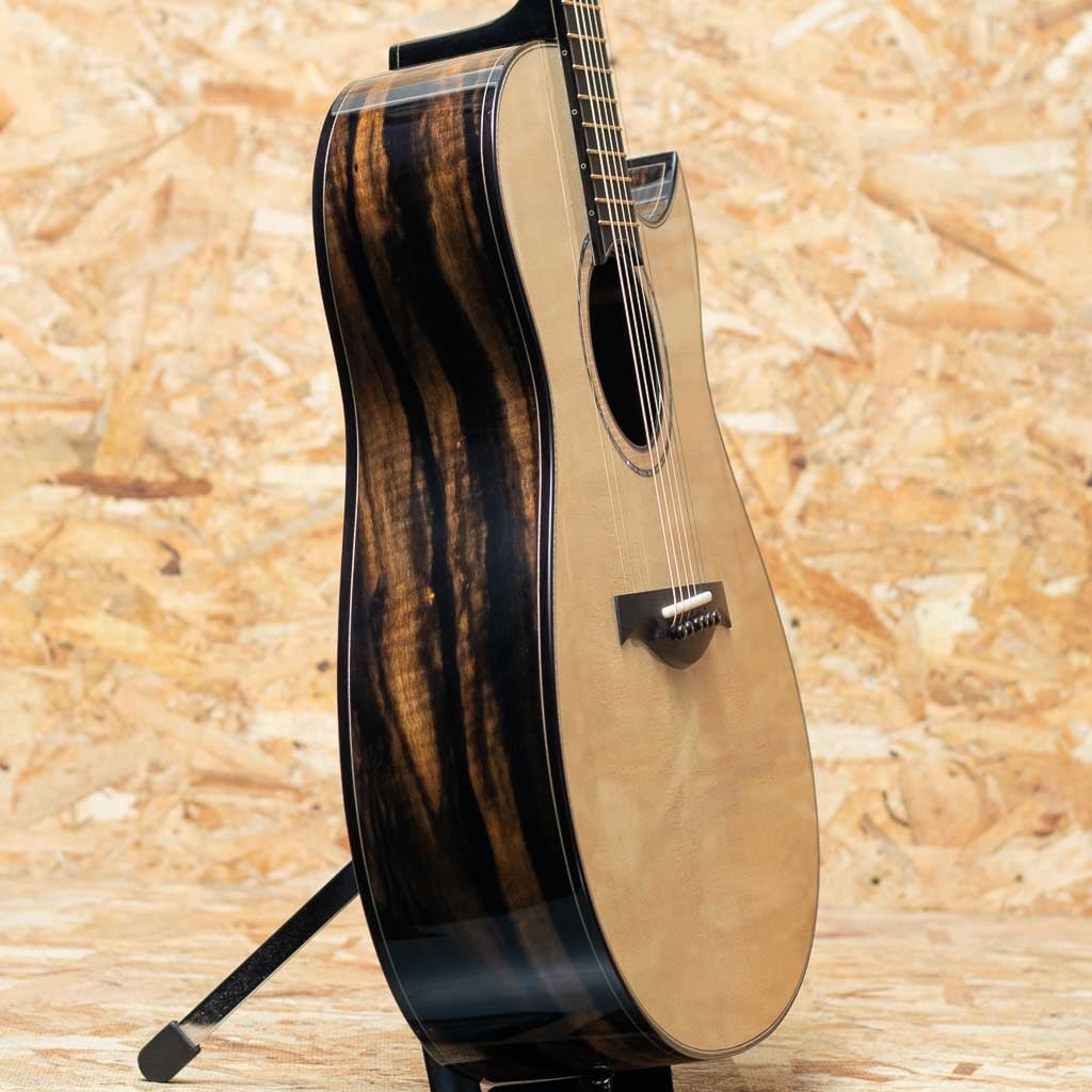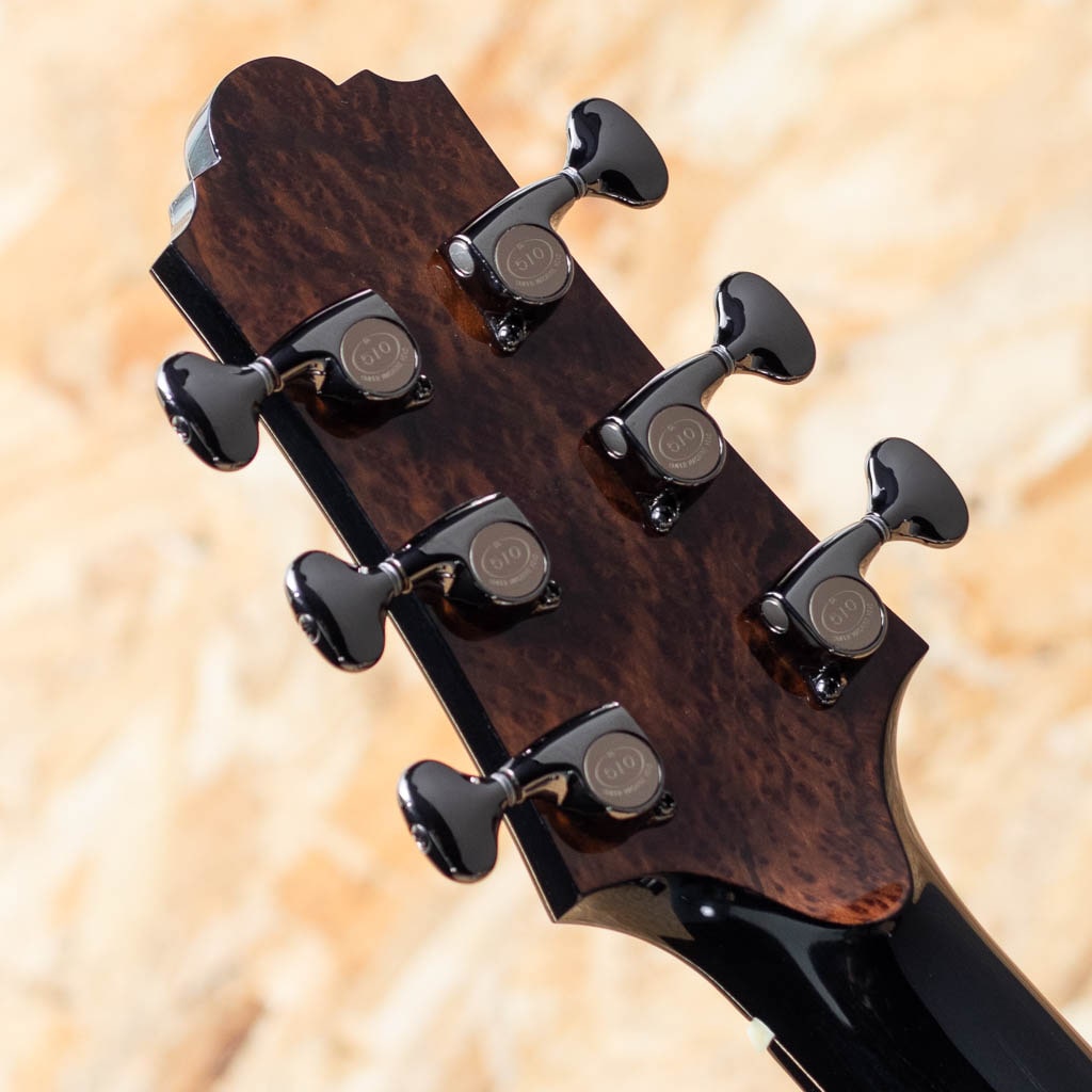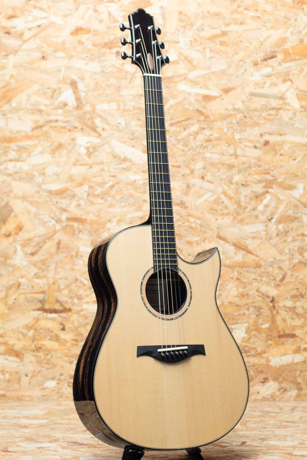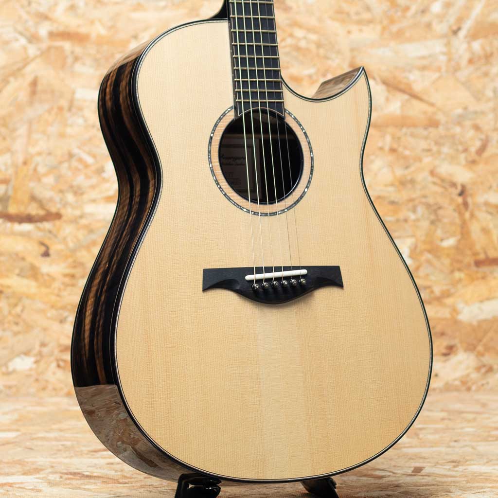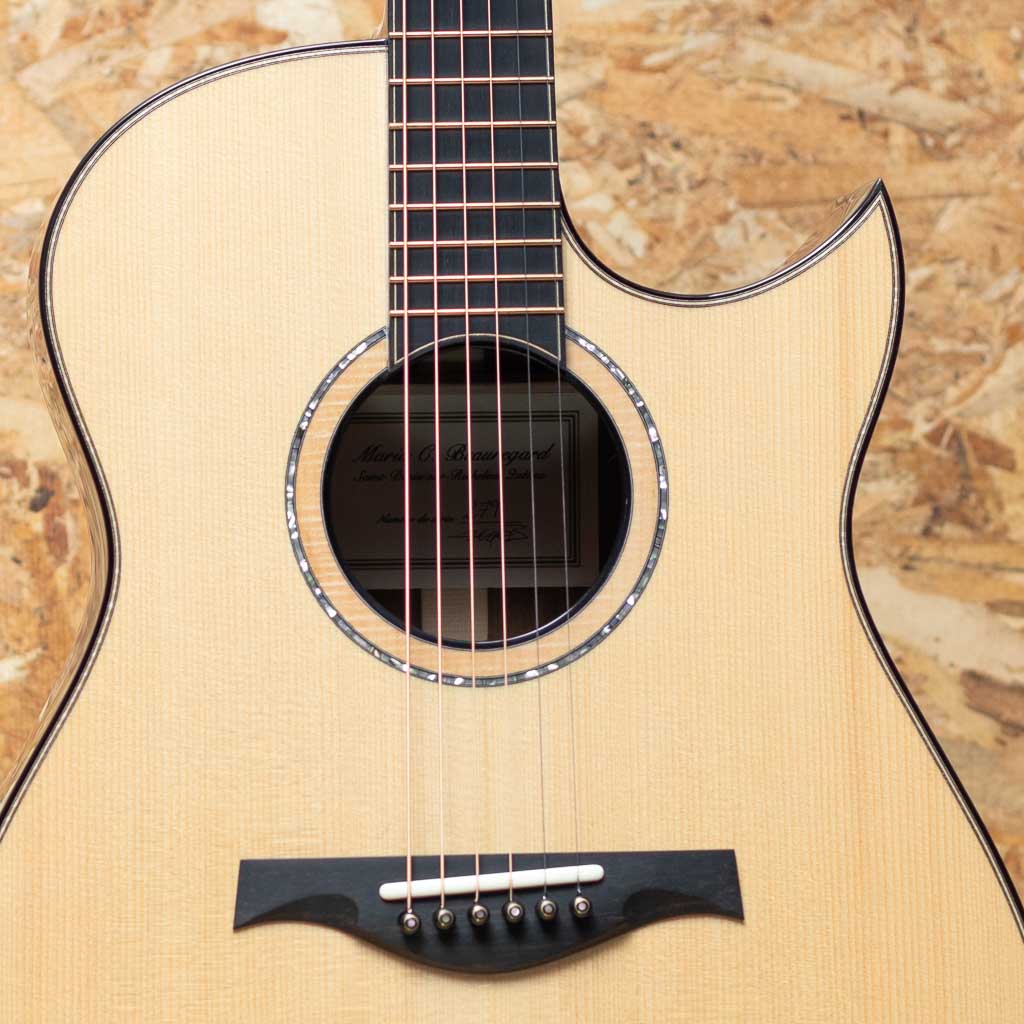 カナダ・ケベックのベテラン製作家"Mario Beauregard(マリオ・ボーラガー)。アコースティックギタールシアーの巨匠アーヴィン・ソモジ氏の一番弟子であり、アーチトップギターに関してはレジェンド Taku Sakashta(坂下拓氏)の元で製作技術を学ぶなど、豊富な経験と確かな技術で米国や欧州でも高い評価を得る個人製作家です。本器はオリジナルMODカッタウェイボディモデル。ヨーロピアンスプルーストップ、サイド&バックのクレリカムエボニー、スタイリッシュなヘッドシェイプにフローレンタインカッタウェイ、メイプル&アバロンロゼッタ、エボニー指板&ブリッジ、ホンジュラスマホガニー材のネック裏にはブラックカラーフィニッシュが施されており、バインディングもエボニーに統一。ダークで落ち着いたラグジュアリーなデザインです。ヘッド裏にはバールウッドの化粧板、着脱が容易で個性的なデザインのロッドカバー、EVO-Goldフレット、ゴトー製510コスモブラックチューナー、約5.3mm幅のイントネーションサドル、シンプルかつ洗練されたデザインでシルエットも美しく派手さを取り除いたスタイルは名工たる腕があってこそのものでしょう。Somogyi氏のブレイシング形状からのインスパイアを感じるオリジナルエックスブレイシング。軸ブレがなく、クリアでどこまでもディープな音像に非常にレンジの広いサウンド。細かなタッチに忠実に反応してくれ、奏者の表現力を最大限に引き出してくれるような快適な演奏性です。しっかりと持ち応えのあるネックですが、手の平に沿うようなカーブを持つシェイプで手に馴染み易く、各部のセットアップも巧みなため押弦時のストレスもございません。偉大なソモジ氏の1番弟子として高い技術とセンスを持って名を馳せたマリオ氏ですが、彼の門下から数多くの世界的ルシアーが輩出されており、その根幹である彼自身もすでにレジェンダリーな存在と言えます。年間製作本数も極めて少ない希少品。ぜひお手に取ってお試し下さい。
