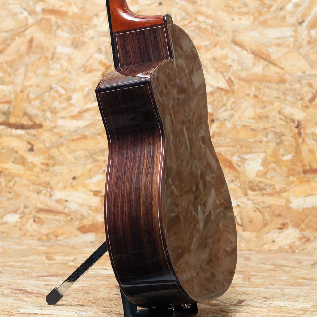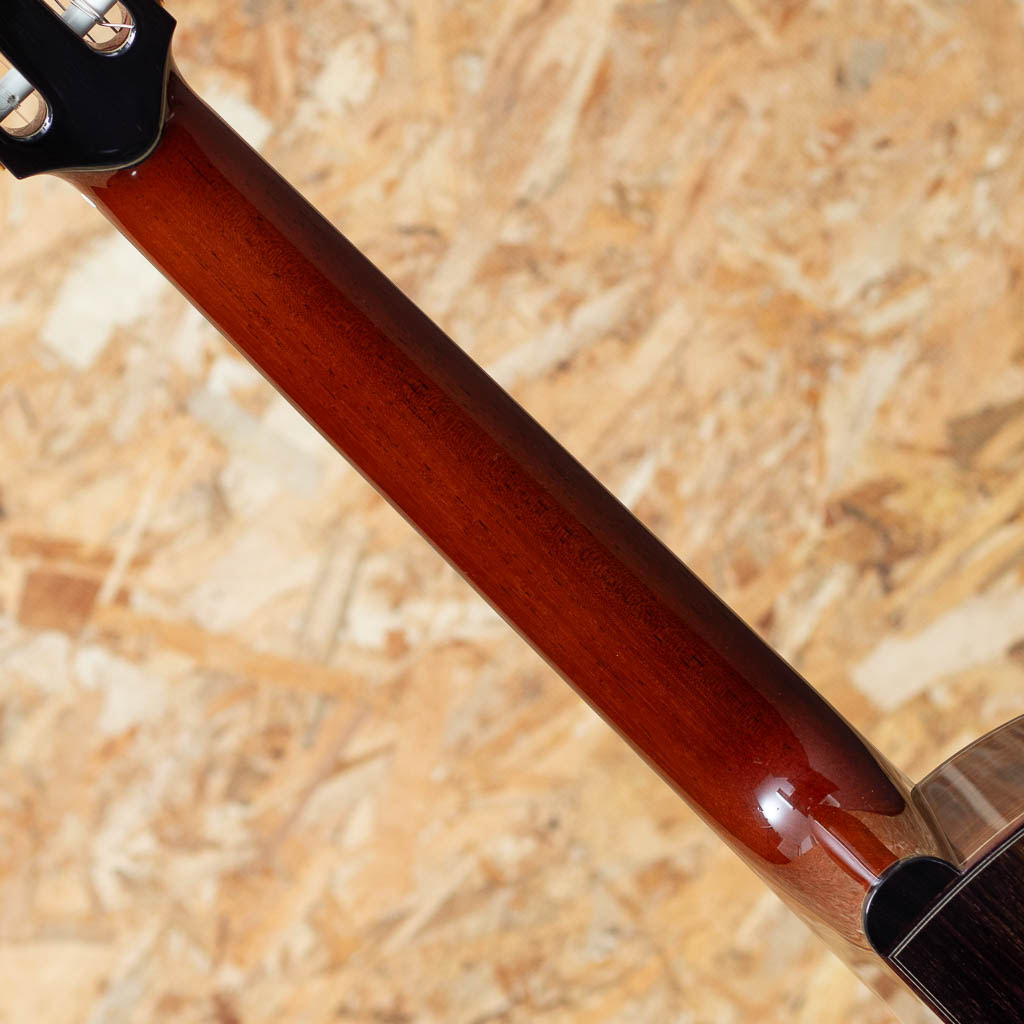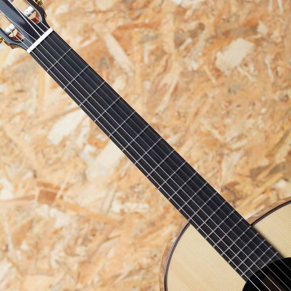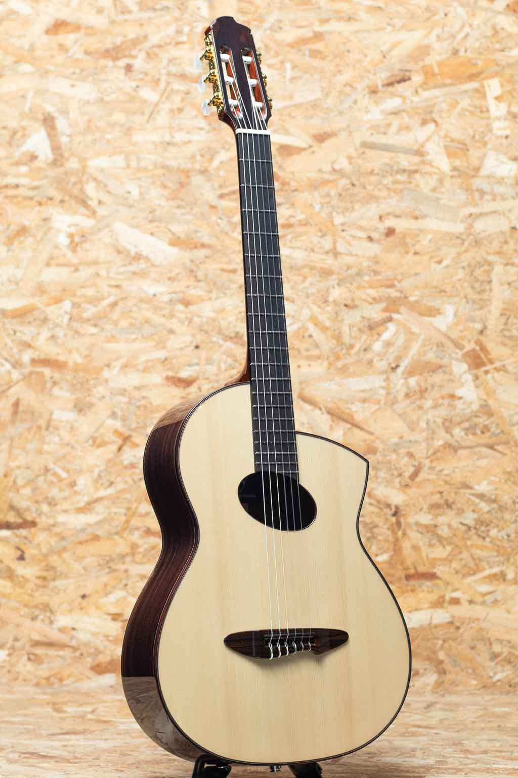 福島県、猪苗代にて工房を構える主催吉田俊之氏による手工ブランド"Yoshida弦楽器工房"。ウクレレやギターなど幅広く生弦楽器を製作するルシアーです。本器は非常に目を引くスタイリッシュなルックスと美しい音色を併せ持ったセンスが光るナイロン弦ギター。ジャーマンスプルーストップ、ローズウッドサイド&バック、エボニー指板、セドロネック、ジリコテブリッジ、ローズウッドバインディング、ハカランダヘッド化粧板、ゴトー製フステロ型糸巻き。フィニッシュはラッカー塗装で仕上げており、均一かつ極薄。タッチによって音色を変える反応の良さを持ちながら軽いタッチでもしっかりとした甘く太い基音が伸びやかに響く反応の良さ。48ミリのナット幅はアコースティックギターからも持ち替えも容易にしつつ、しっかりとした弦間を確保しています。また、ギター用からバイオリン用まで高い評判を得るブリッジサドル一体型ピエゾピックアップのBarbera Pickupを搭載しており、生音・ライン問わず使える本格的なクロスオーバータイプのエレガットをお探しの方に、自信を持ってオススメしたい1本です。セミハードケースが付属します。