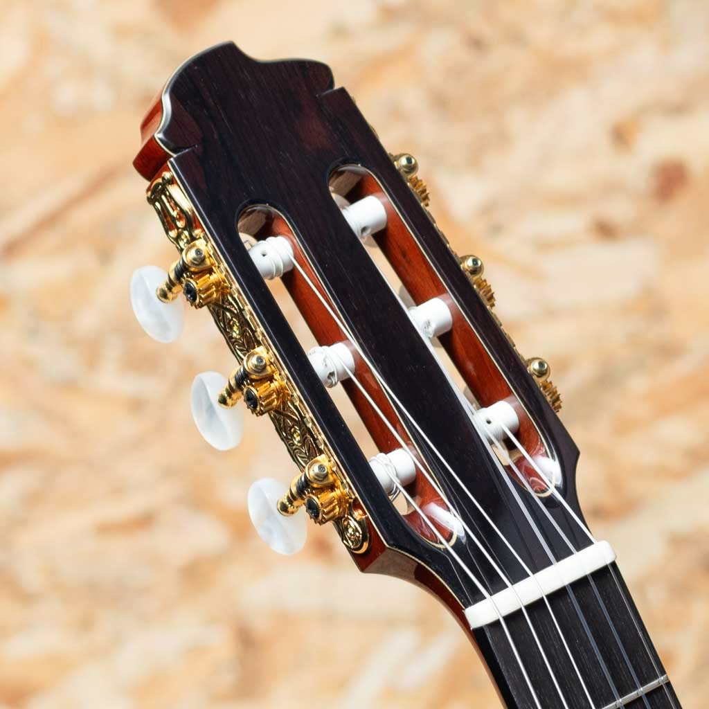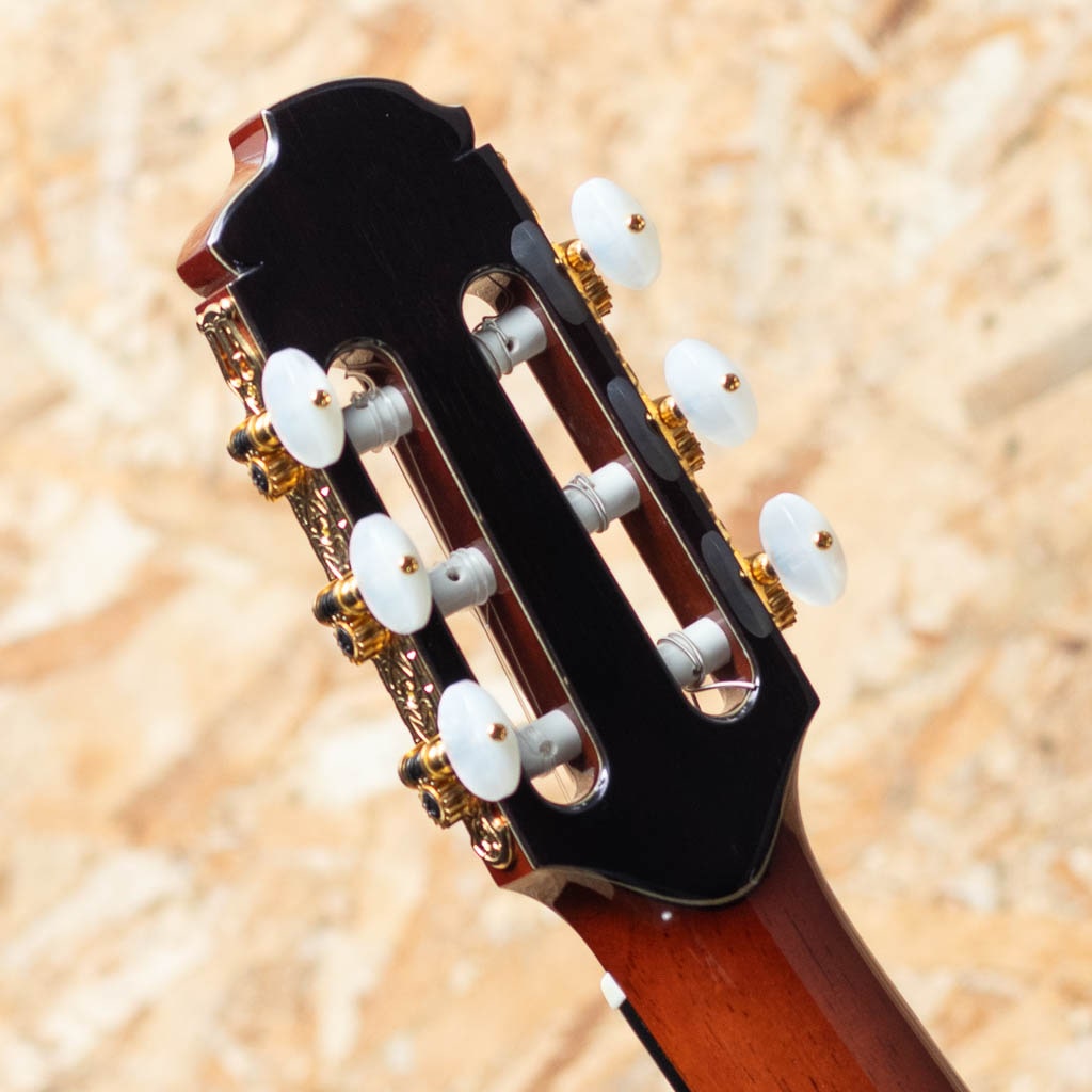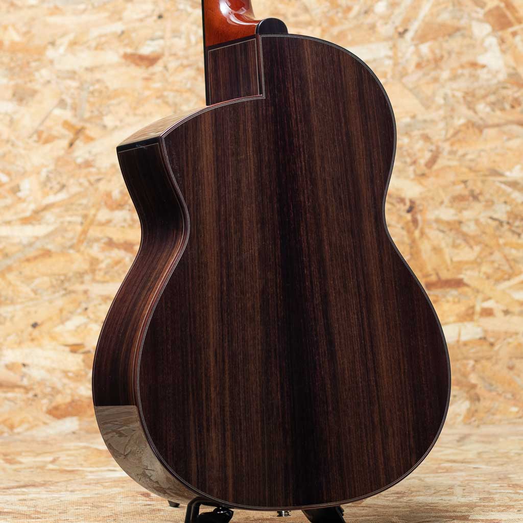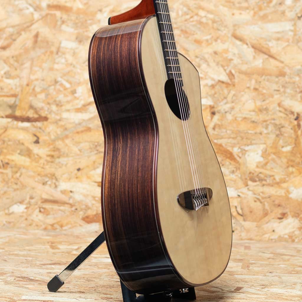 福島県、猪苗代にて工房を構える主催吉田俊之氏による手工ブランド"Yoshida弦楽器工房"。ウクレレやギターなど幅広く生弦楽器を製作するルシアーです。本器は非常に目を引くスタイリッシュなルックスと美しい音色を併せ持ったセンスが光るナイロン弦ギター。ジャーマンスプルーストップ、ローズウッドサイド&バック、エボニー指板、セドロネック、ジリコテブリッジ、ローズウッドバインディング、ハカランダヘッド化粧板、ゴトー製フステロ型糸巻き。フィニッシュはラッカー塗装で仕上げており、均一かつ極薄。タッチによって音色を変える反応の良さを持ちながら軽いタッチでもしっかりとした甘く太い基音が伸びやかに響く反応の良さ。48ミリのナット幅はアコースティックギターからも持ち替えも容易にしつつ、しっかりとした弦間を確保しています。また、ギター用からバイオリン用まで高い評判を得るブリッジサドル一体型ピエゾピックアップのBarbera Pickupを搭載しており、生音・ライン問わず使える本格的なクロスオーバータイプのエレガットをお探しの方に、自信を持ってオススメしたい1本です。セミハードケースが付属します。