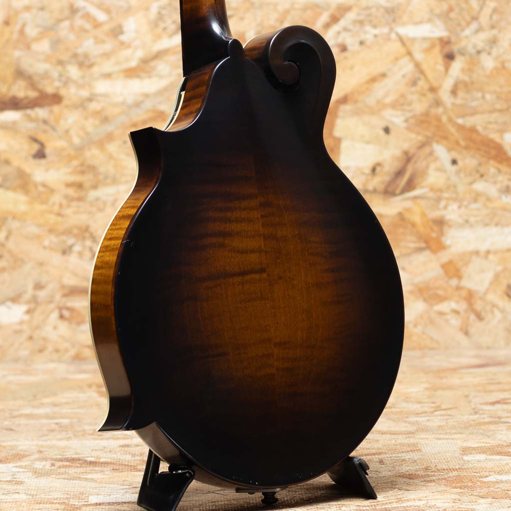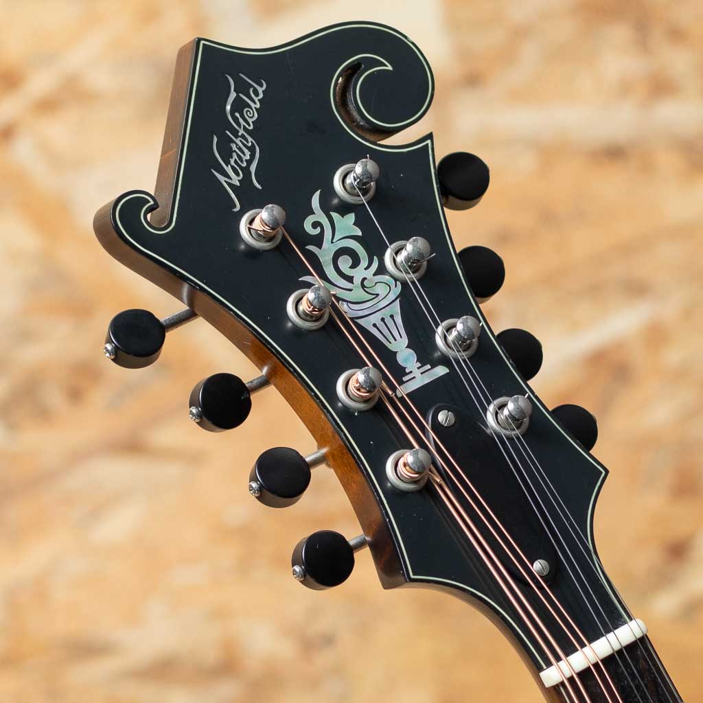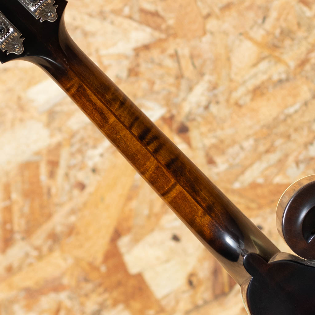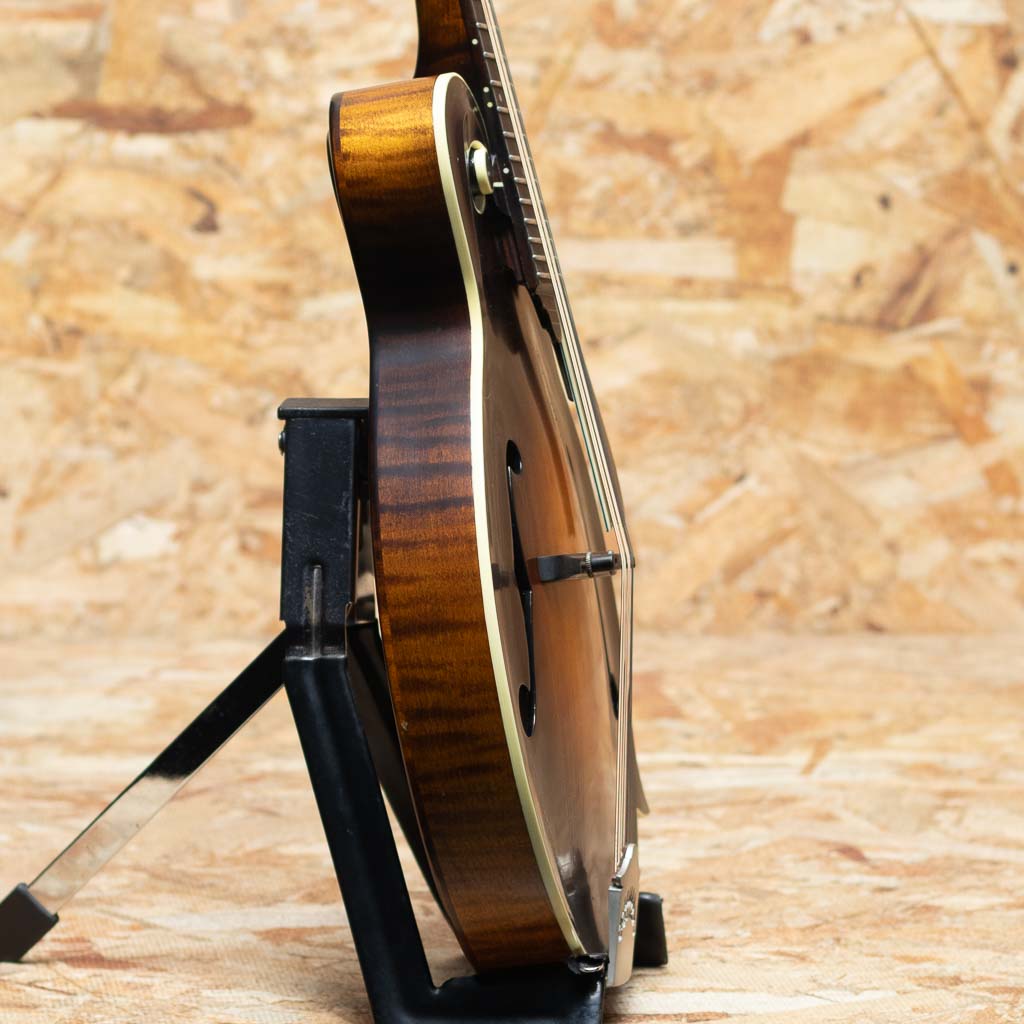Northfield Mandolinsはアメリカ・ミシガン州マーシャルを拠点にしながら、中国、青島の工房と連携して製作される、現在海外で最も人気のある現代的なマンドリンブランドです。当器は"NF-F5S" 2018年製USED品。SシリーズとなるF5Sは厳選された材を使用しながらシンプルな装飾を施し、よりスタンダードで入手しやすいモデルです。アディロンダックスプルーストップ、フィギャードメイプルサイド&バック、フィギャードメイプルネック、エボニー指板、エボニーアジャスタブルブリッジ、エボニーピックガード、つや消しニトロセルロースラッカーフィニッシュ。指板はゆるやかなラディアスをつけておりコードワークを押さえやすくなっています。指板エンドはスクープ加工を施されており、ピッキングの邪魔にならず演奏も快適。全体に細かなキズなど使用感が見られますが大きなダメージはなくネックコンディションも良好、フレットの減りもほとんどなく今後の使用も安心です。ヘッドにはフラワーポットのインレイシールが貼られています。アメリカでは約$4000となるマンドリンです。アディロントップならではのパワフルな響きと快活なレスポンスの良さが光るおすすめのマンドリンです。グラスファイバーハードケース付属(使用感あり)