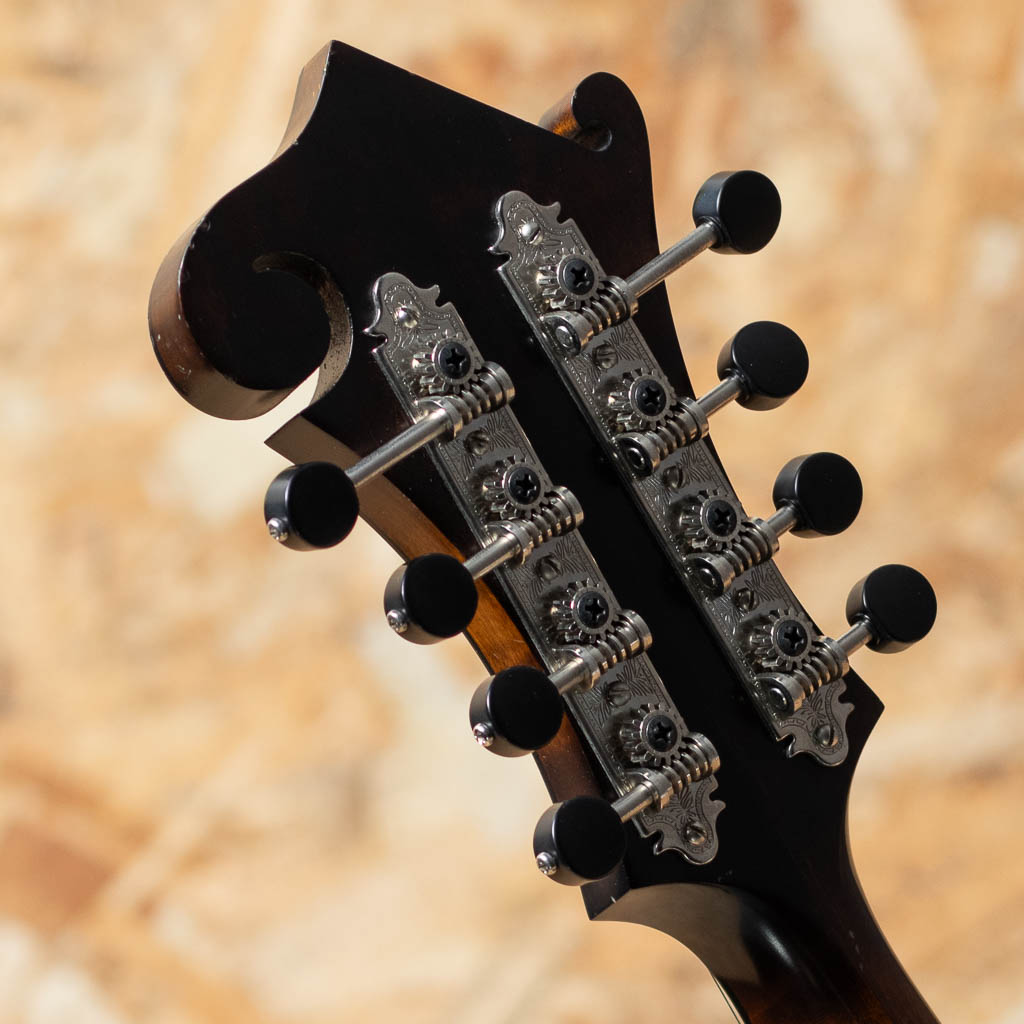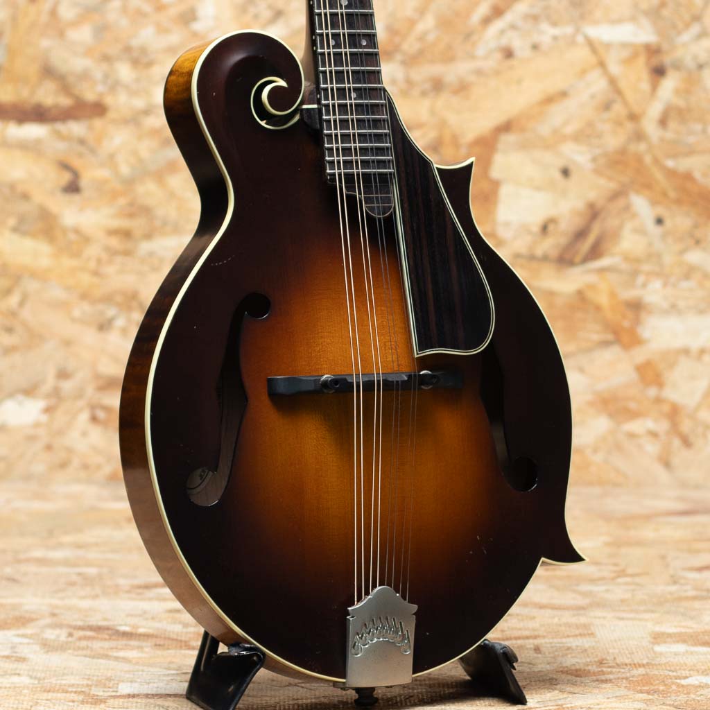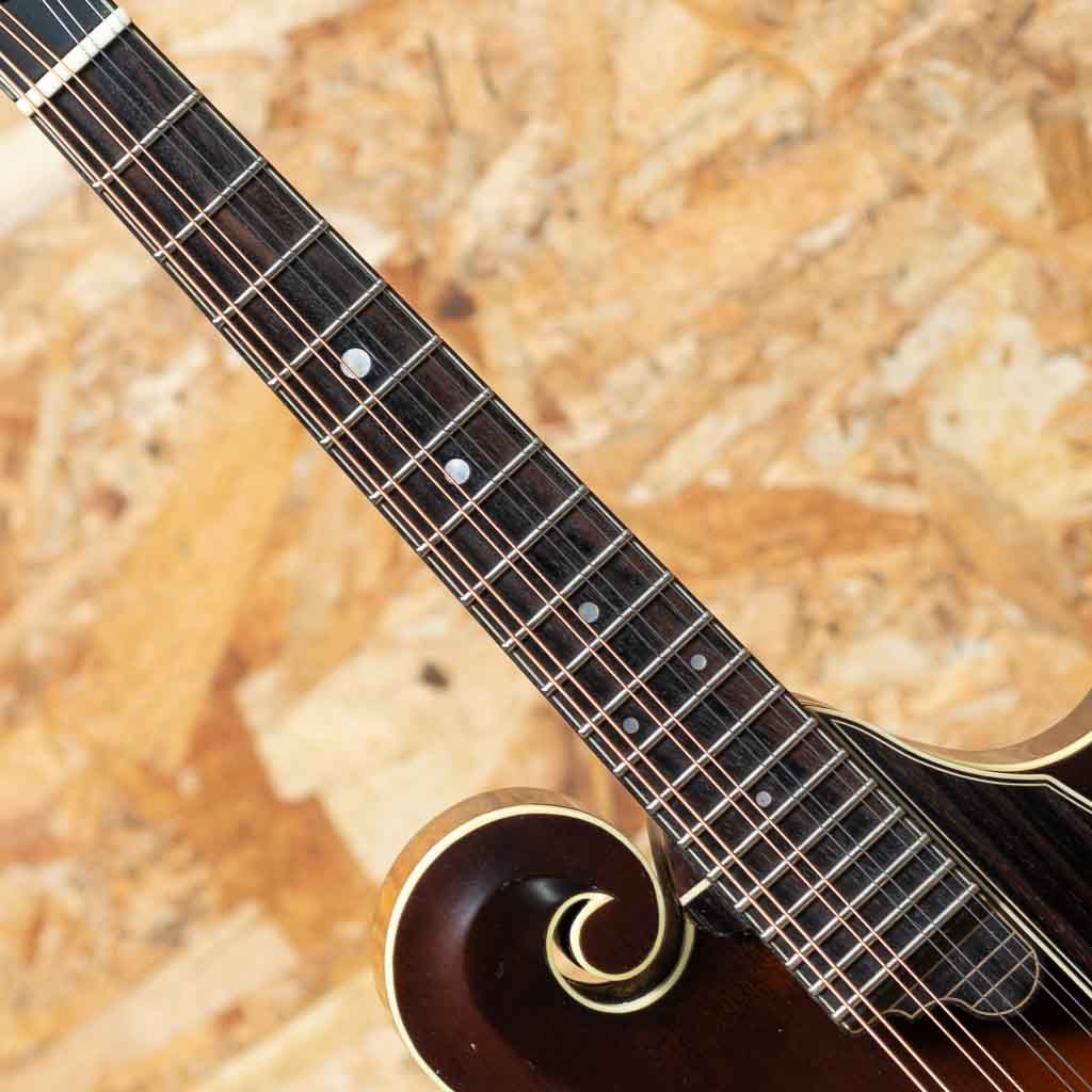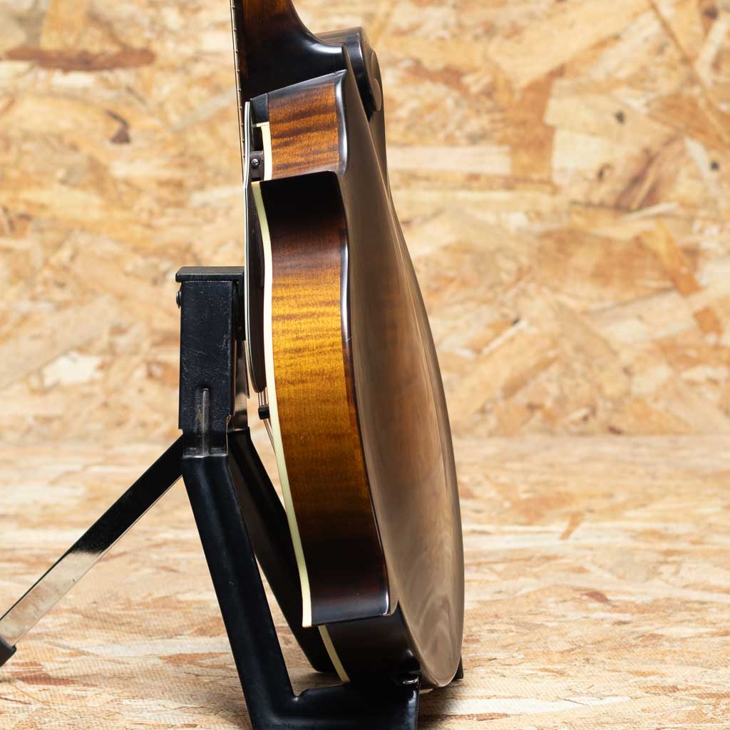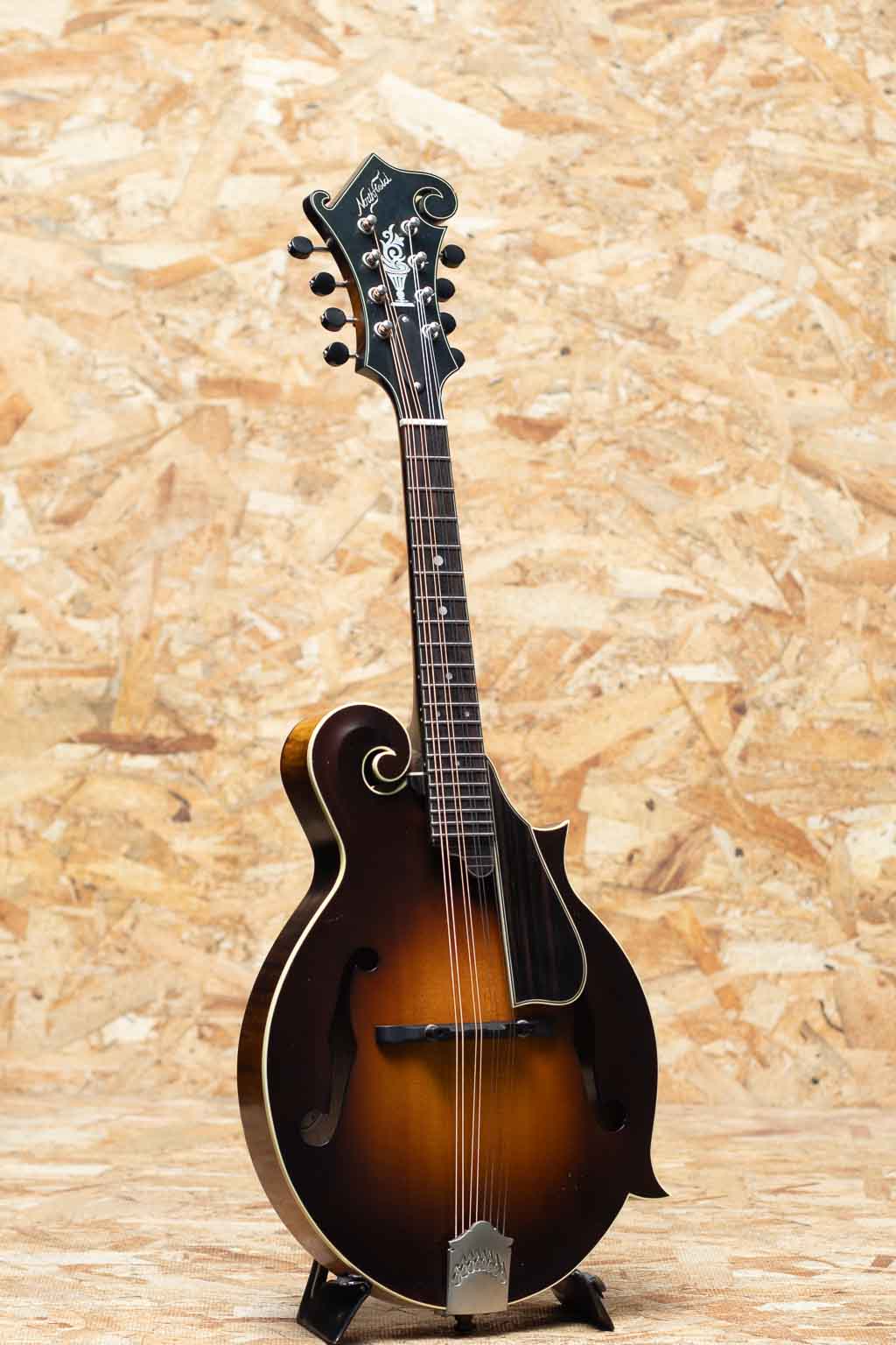 Northfield Mandolinsはアメリカ・ミシガン州マーシャルを拠点にしながら、中国、青島の工房と連携して製作される、現在海外で最も人気のある現代的なマンドリンブランドです。当器は"NF-F5S" 2018年製USED品。SシリーズとなるF5Sは厳選された材を使用しながらシンプルな装飾を施し、よりスタンダードで入手しやすいモデルです。アディロンダックスプルーストップ、フィギャードメイプルサイド&バック、フィギャードメイプルネック、エボニー指板、エボニーアジャスタブルブリッジ、エボニーピックガード、つや消しニトロセルロースラッカーフィニッシュ。指板はゆるやかなラディアスをつけておりコードワークを押さえやすくなっています。指板エンドはスクープ加工を施されており、ピッキングの邪魔にならず演奏も快適。全体に細かなキズなど使用感が見られますが大きなダメージはなくネックコンディションも良好、フレットの減りもほとんどなく今後の使用も安心です。ヘッドにはフラワーポットのインレイシールが貼られています。アメリカでは約$4000となるマンドリンです。アディロントップならではのパワフルな響きと快活なレスポンスの良さが光るおすすめのマンドリンです。グラスファイバーハードケース付属(使用感あり)