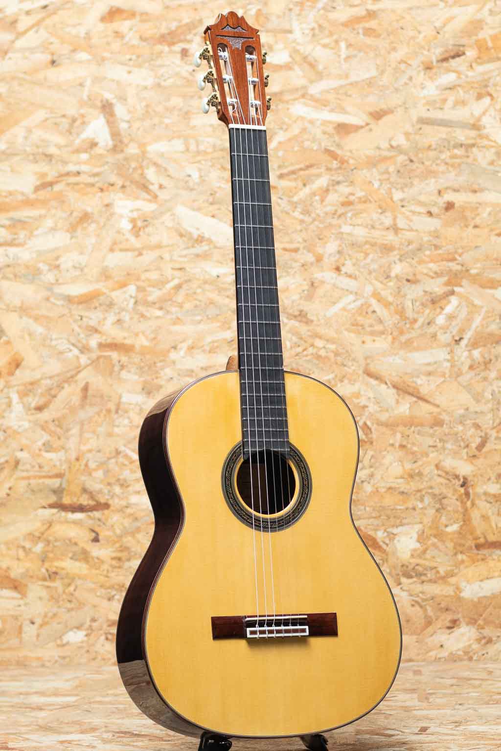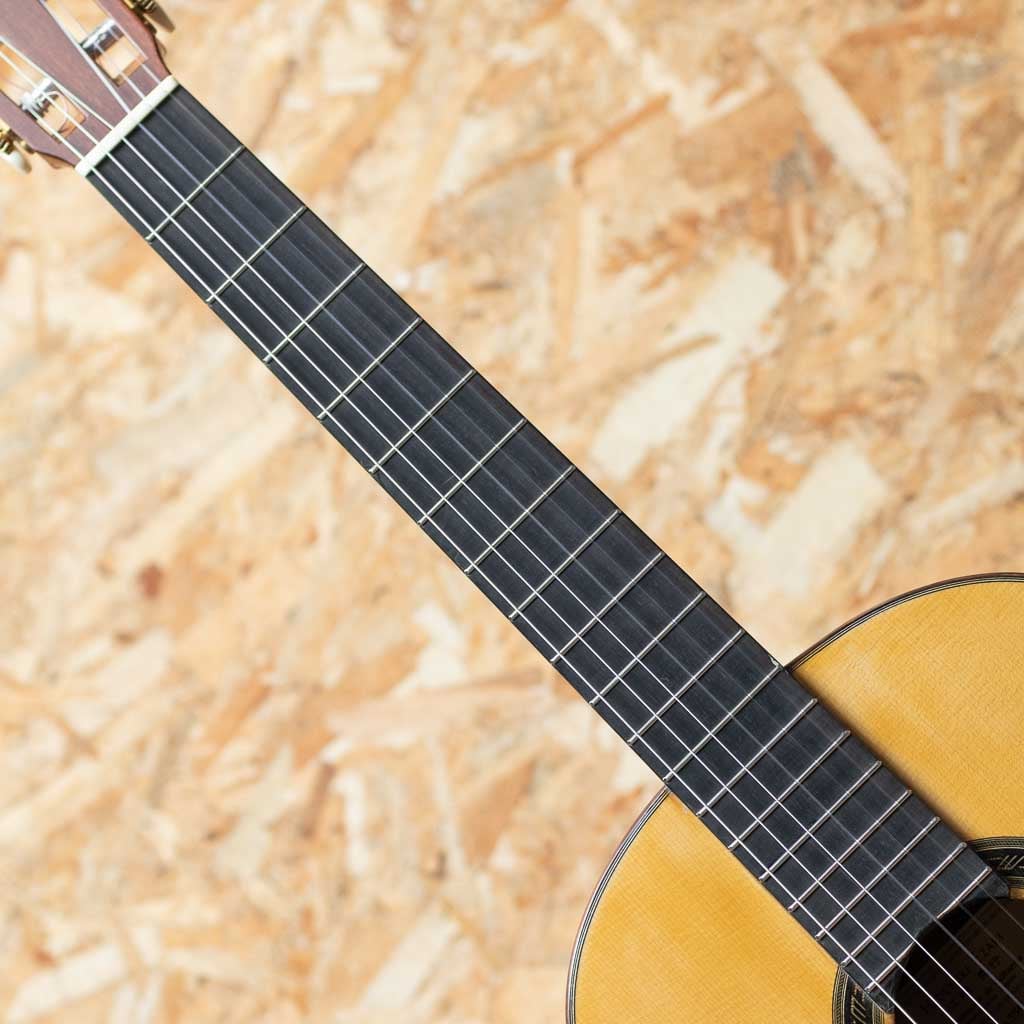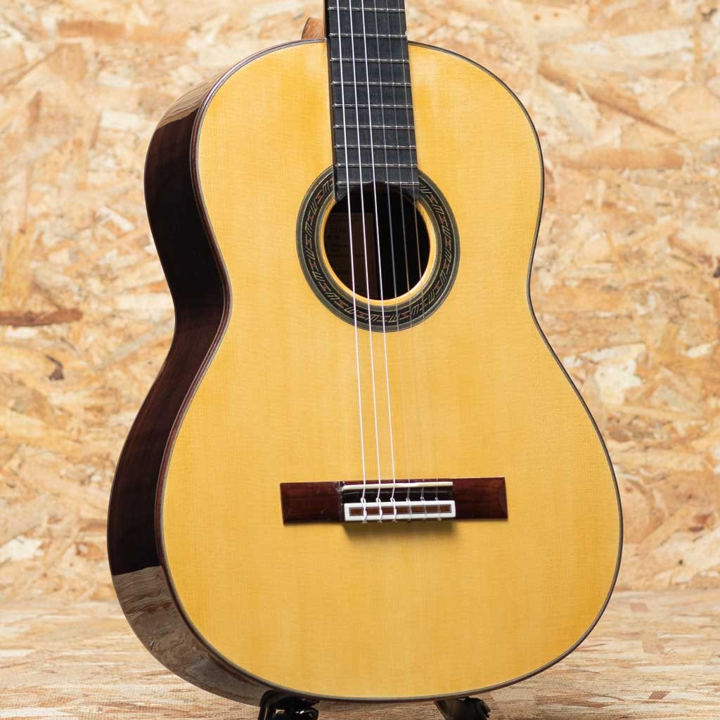 YAMAHAのギター研究課に所属していた江崎氏。 修行のため、3年間スペインへ渡りEduardo Ferrer (エドアルド・フェレール)と Manuel Hernandes (マヌエル・エルナンデス)に師事。グラナダと、マドリッドの 両派で製作技術を身に付けた製作家です。 1970年代当時、YAMAHAの最高級モデルだったGC-30Bも江崎氏によって 手がけられ、ギター愛好家だけでなくNarciso Yepes (ナルシソ・イエペス)やOscar Ghiglia (オスカー・ギリア)等といった名手達からも高い評価を得ており、 師であるHernandes y Aguado (ヘルナンデス・イ・アグアド)直系の名器として “江崎サウンド“を確立。広く知られる製作家となりました。YAMAHA退職後は 自身のラベルで製作活動を展開。大手ギターメーカーでの輝かしい実績と、 40年以上もの長いキャリアを持つ日本の名工の1人です。本器は、単板スプルーストップ・単板マダガスカルローズウッドサイド&バックを用いたモデル、No.55。トップはセラック塗装(サイド&バックはラッカー塗装)で、塗装の質の良さも素晴らしく、材の良さ、そして木工技術の高さが掛け合わされ、下位モデルのNo35とは別格のサウンド。低域の重厚な響き、高域の煌びやかで甘いトーンはまさにこだわりのエザキ・サウンド。