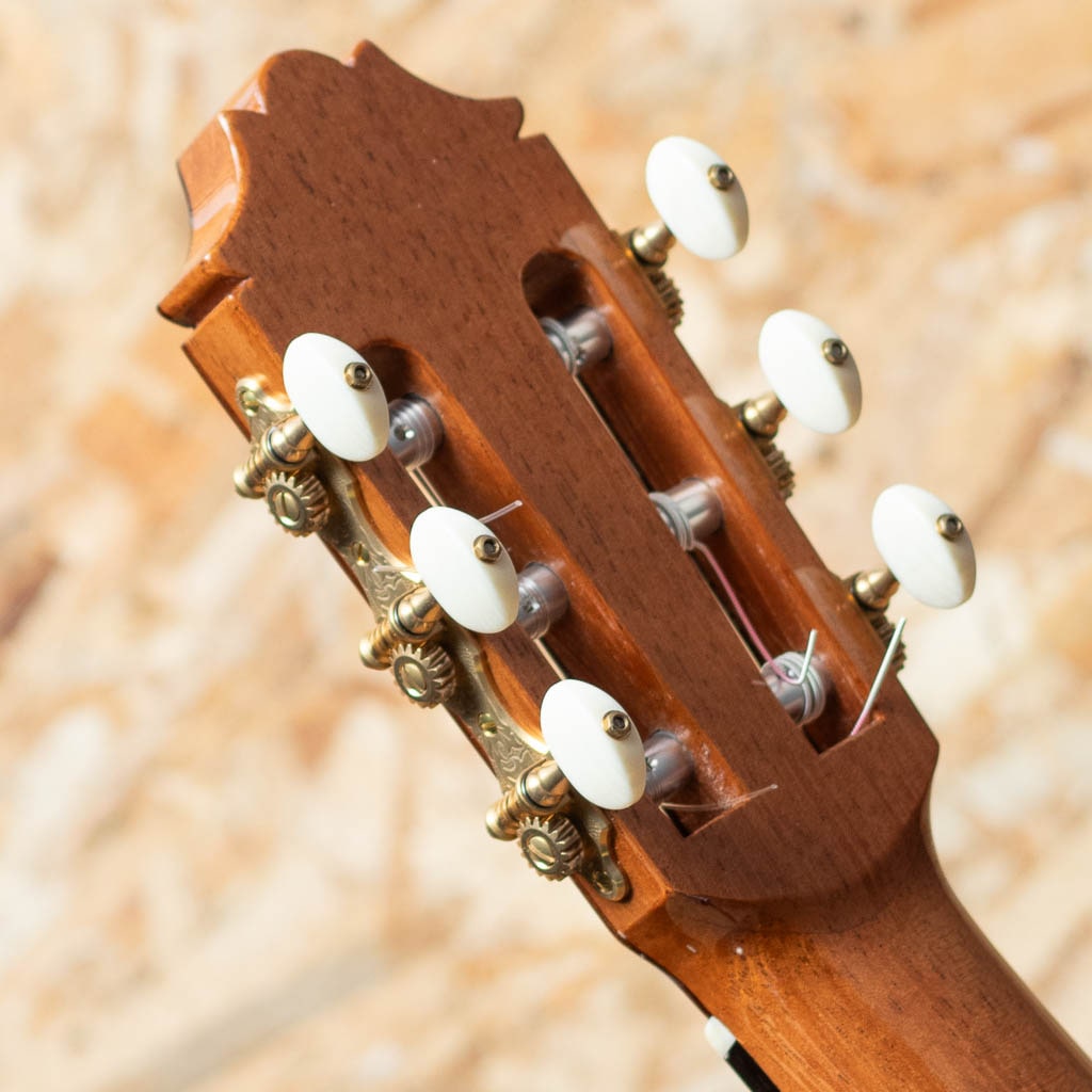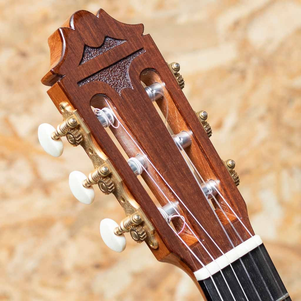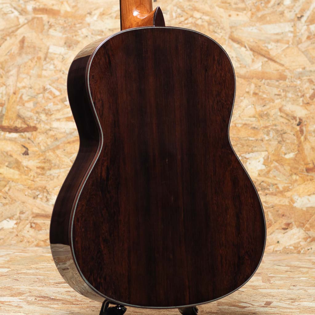 YAMAHAのギター研究課に所属していた江崎氏。 修行のため、3年間スペインへ渡りEduardo Ferrer (エドアルド・フェレール)と Manuel Hernandes (マヌエル・エルナンデス)に師事。グラナダと、マドリッドの 両派で製作技術を身に付けた製作家です。 1970年代当時、YAMAHAの最高級モデルだったGC-30Bも江崎氏によって 手がけられ、ギター愛好家だけでなくNarciso Yepes (ナルシソ・イエペス)やOscar Ghiglia (オスカー・ギリア)等といった名手達からも高い評価を得ており、 師であるHernandes y Aguado (ヘルナンデス・イ・アグアド)直系の名器として “江崎サウンド“を確立。広く知られる製作家となりました。YAMAHA退職後は 自身のラベルで製作活動を展開。大手ギターメーカーでの輝かしい実績と、 40年以上もの長いキャリアを持つ日本の名工の1人です。本器は、単板スプルーストップ・単板マダガスカルローズウッドサイド&バックを用いたモデル、No.55。トップはセラック塗装(サイド&バックはラッカー塗装)で、塗装の質の良さも素晴らしく、材の良さ、そして木工技術の高さが掛け合わされ、下位モデルのNo35とは別格のサウンド。低域の重厚な響き、高域の煌びやかで甘いトーンはまさにこだわりのエザキ・サウンド。