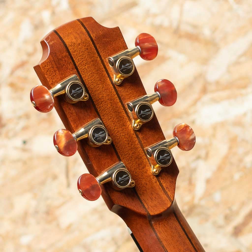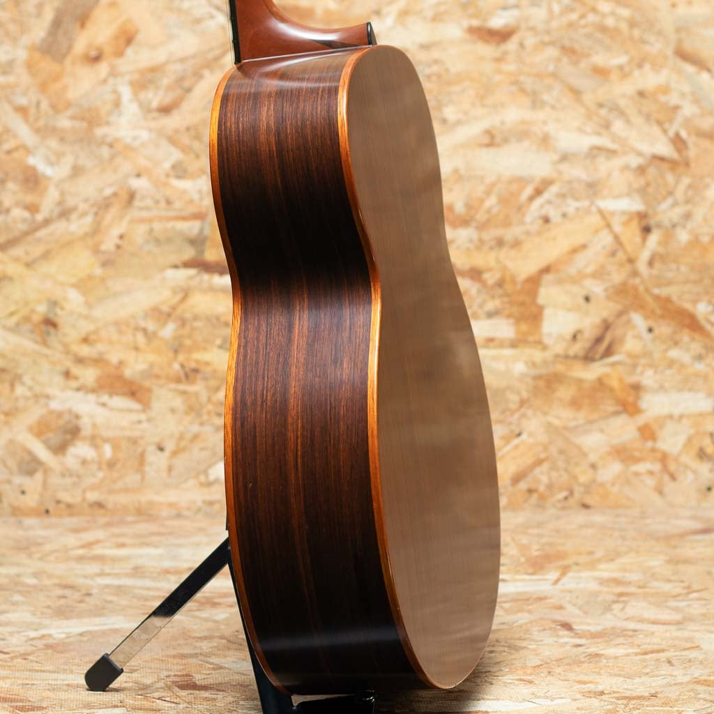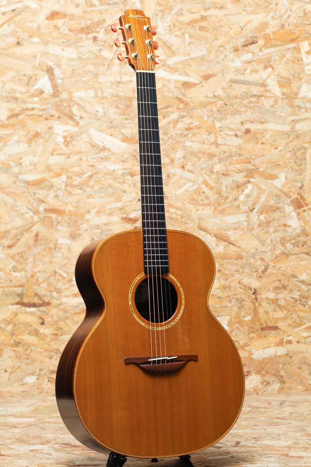 ヨーロッパのフィンガースタイルアーティストをはじめ、多くの著名なミュージシャンが使用しているアイルランド製ギター"ローデン"。本器は16.5インチのボトム幅を持つジャンボシェイプ”O-25”1998年製USED品。レッドシダートップ、インディアンローズウッドサイド&バック、マホガニー積層ネック、エボニー指板、ローズウッドスルーブリッジ、ロゴ入りゴトーゴールドペグ、複合アバロン/ウッドロゼッタ、マホガニーバインディング、オリジナルエックスブレイシング。ボディサイズとは裏腹な軽快な音の立ち上がり。各弦からなる明瞭なサウンドバランスは、ローデンならではの響きを味わえます。際立つ中高音や、ジャンボサイズならではの分厚い音像が特長。ボディエンドにはジャックサイズのエンドピンが装着されています。ボディエンド箇所にオーバースプレーが確認できますが、恐らく製作時に施されておりさほど大きくは目立たず雰囲気は損なわれておりません。ボディくびれ箇所にトップ材とバインディングの継ぎ目に沿って塗装引けが見られます。ボディ全体的に打痕がみられる他、ネック裏側には爪痕がございますが、演奏性には問題ございません。汎用ソフトケース付属。