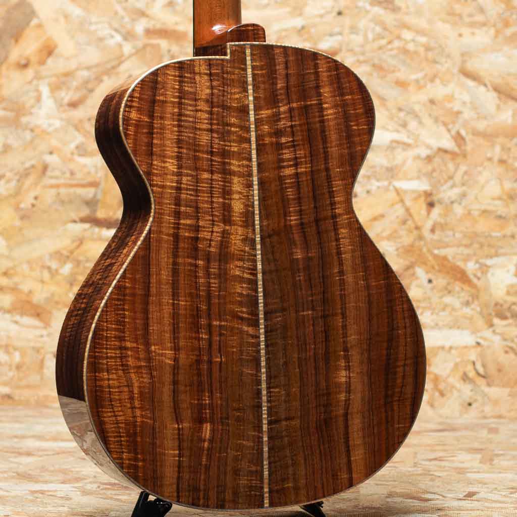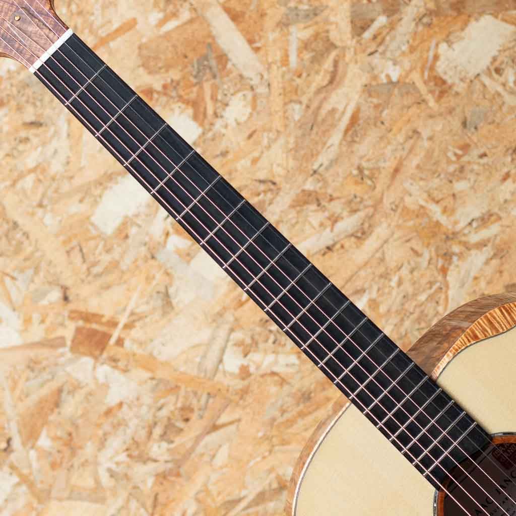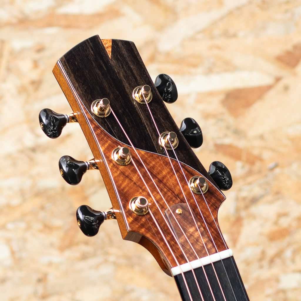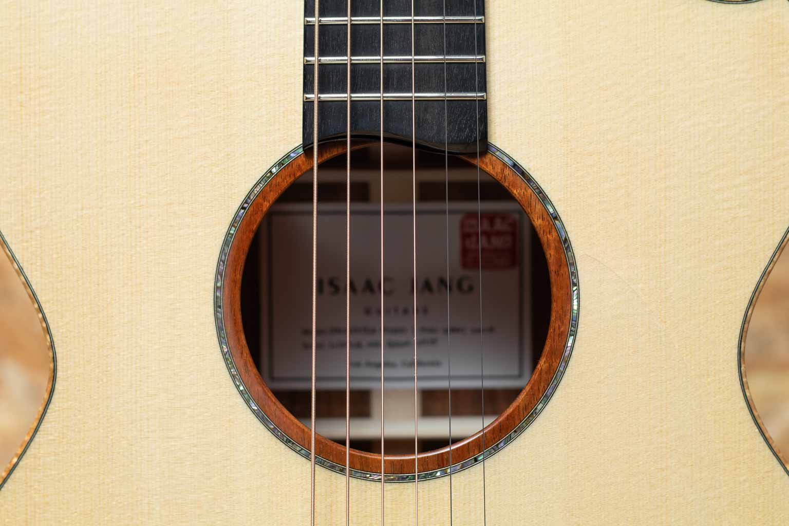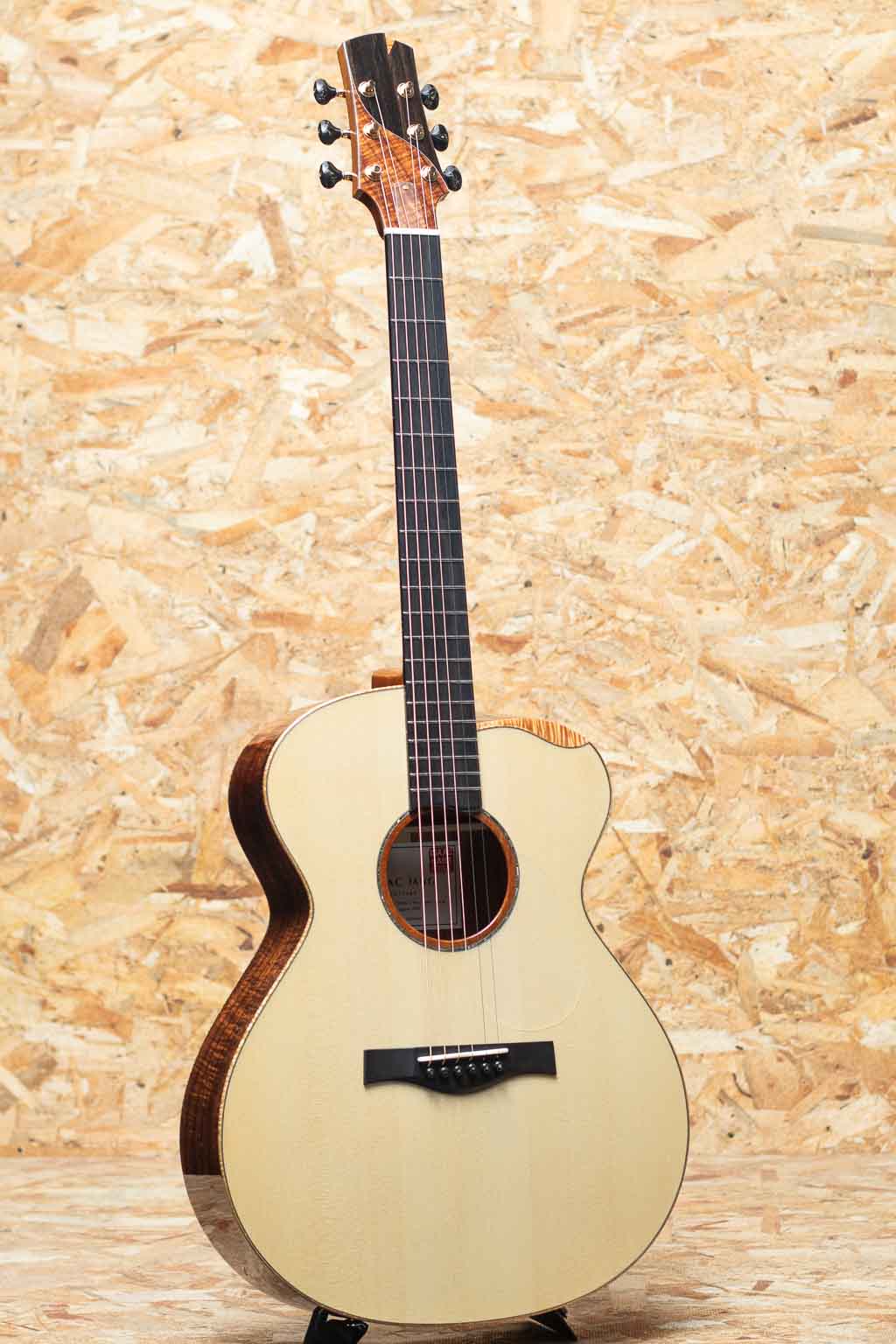 ロサンゼルスのルシアー"Isaac Jang(アイザック・ジャン)"。2007年より"Galloup School of Luthier"でギター製作を学びながら、同時にマスタールシアー"Kathy Wingert(キャシー・ウィンガート)"の元でアシスタントとしてもギター製作に従事。卒業後もキャシーの元でアシスタントを続けながら、楽器店にてマーチンやテイラー、サンタクルーズ、コリングスなどのオーソライズド・リペアマンとしても活躍しました。2010-2012年にはカリフォルニアにてトミー・エマニュエルのコンサートギターテックとしても活躍。超多忙にストイックにその実力を磨き、2014年より満を持して自身のブランドギターを製作開始。世界的な評価を伸ばしている超実力派ルシアーです。本器は弊社スタッフがハンドセレクトしたハイリーフレイムコア材を用いて製作された三木楽器200周年記念モデル。ボディ1弦側のロウワーバウトが最も幅広で、6弦側のアッパーバウトに向けて薄くなるようにテーパーをかけたマンザー・ウェッジ、そしてカッタウェイ部にはトップ側に少し前傾させたウチダ・スタイル・ベンダウェイ。どちらもプレイヤーの演奏をアシストしてくれる実用的なボディ構造のデザインです。フィンガータッチはもちろん、あらゆるギタープレイを受け入れてくれる、高次元なギター。TKL製のカーボンファイバーケースが付属します。