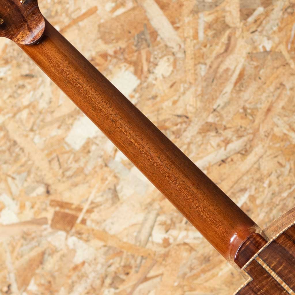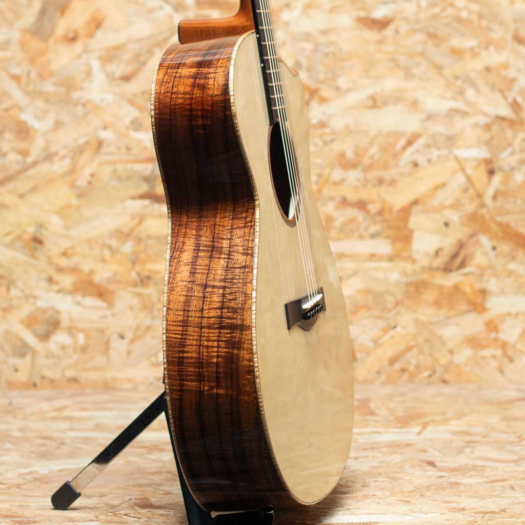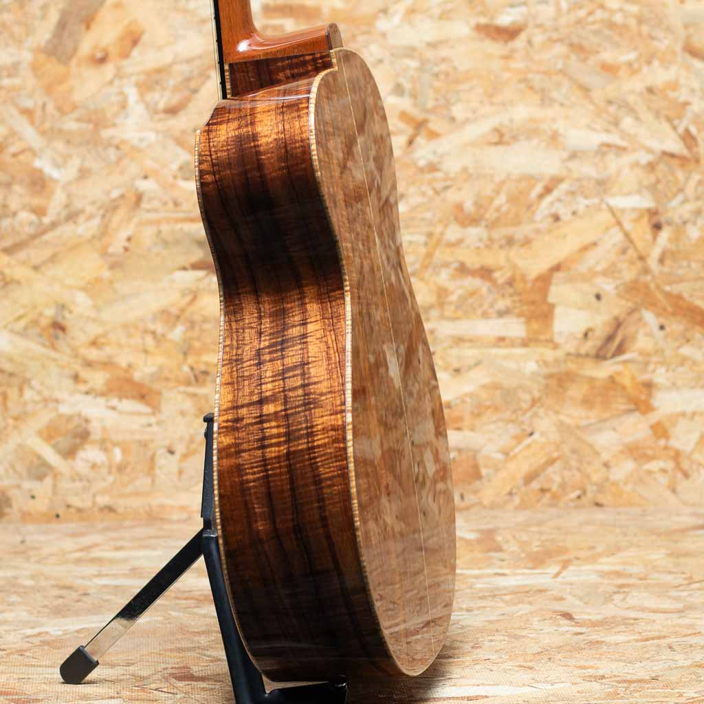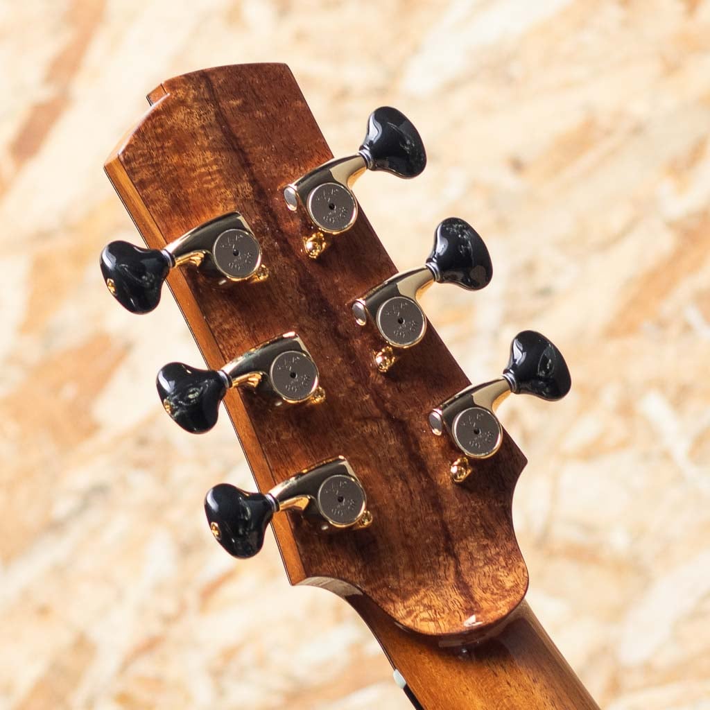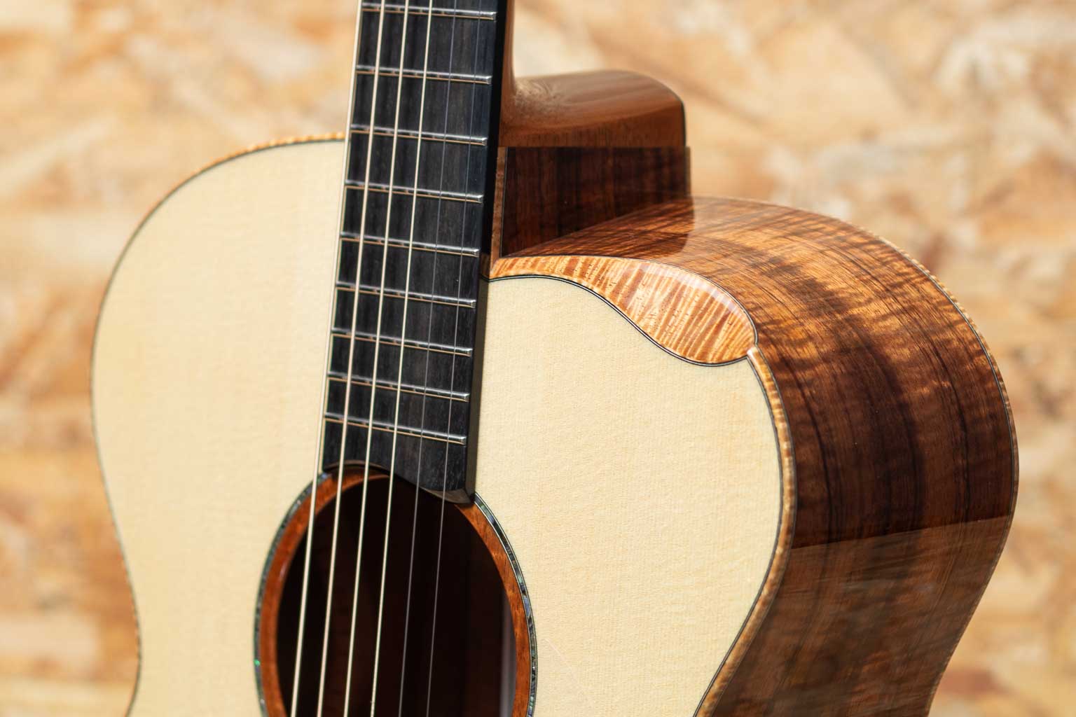 ロサンゼルスのルシアー"Isaac Jang(アイザック・ジャン)"。2007年より"Galloup School of Luthier"でギター製作を学びながら、同時にマスタールシアー"Kathy Wingert(キャシー・ウィンガート)"の元でアシスタントとしてもギター製作に従事。卒業後もキャシーの元でアシスタントを続けながら、楽器店にてマーチンやテイラー、サンタクルーズ、コリングスなどのオーソライズド・リペアマンとしても活躍しました。2010-2012年にはカリフォルニアにてトミー・エマニュエルのコンサートギターテックとしても活躍。超多忙にストイックにその実力を磨き、2014年より満を持して自身のブランドギターを製作開始。世界的な評価を伸ばしている超実力派ルシアーです。本器は弊社スタッフがハンドセレクトしたハイリーフレイムコア材を用いて製作された三木楽器200周年記念モデル。ボディ1弦側のロウワーバウトが最も幅広で、6弦側のアッパーバウトに向けて薄くなるようにテーパーをかけたマンザー・ウェッジ、そしてカッタウェイ部にはトップ側に少し前傾させたウチダ・スタイル・ベンダウェイ。どちらもプレイヤーの演奏をアシストしてくれる実用的なボディ構造のデザインです。フィンガータッチはもちろん、あらゆるギタープレイを受け入れてくれる、高次元なギター。TKL製のカーボンファイバーケースが付属します。