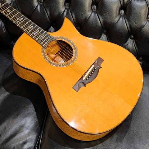 アコースティックルシアー最高峰のひとり、アーヴィン・ソモジ氏2005年の作品、”OM CW Maple”。トップには美しく柔らかな杢のスプルース、サイド&バックには美事なバーズアイの杢のメイプルを使用。マホガニーネック、エボニー指板、ハカランダブリッジ、オリジナルシャーラーペグ(エボニーノブ)、スネイクスキンロゼッタ、ファンシースノウフレークス指板ポジション、フローレンタインカッタウェイ、オリジナルブレイシング、ダブルレイヤーサイド。ソモジ氏らしい、奥深く重厚に響き渡るボトムエンドと、きらびやかでありながら野太く、しっかりと粘りを感じさせるハイエンド。フィンガータッチでも圧倒的な迫力で轟くそのサウンドは、まさに唯一無二。珍しい極上のバーズアイ・メイプルを使用した本器は、適度なコシを感じさせる立ち上がりから、音が空間そのものに溶け込み、立体的に広がっていく響きが実に心地よい一本。ネックヒールにストラップピンが取り付けされている他、トップを中心に打痕やスクラッチ傷などが散見されます。ネックヒールやヘッド裏など、全体的にも使用に伴う小傷が見受けられますが、割れなどの大きなダメージはございません。ネックまわりのコンディションは良好ですが、弦高調整のため、ブリッジは薄くする加工が施されておりサドルも限界まで削られています。そのため、弦の巻き返し部分がサドルに乗らないよう配慮し、ボールエンド上にスペーサーとして別のボールを重ねた状態で弦を張っています。使用感こそあるものの、生ける伝説として世界中に名を轟かせるソモジ氏のクオリティを、余すところなく体現した個体です。憧れの最高峰、崇高の1本。ますます入手が難しくなってきている憧れのルシアー、是非チェックしてください。オリジナルハードケース付属