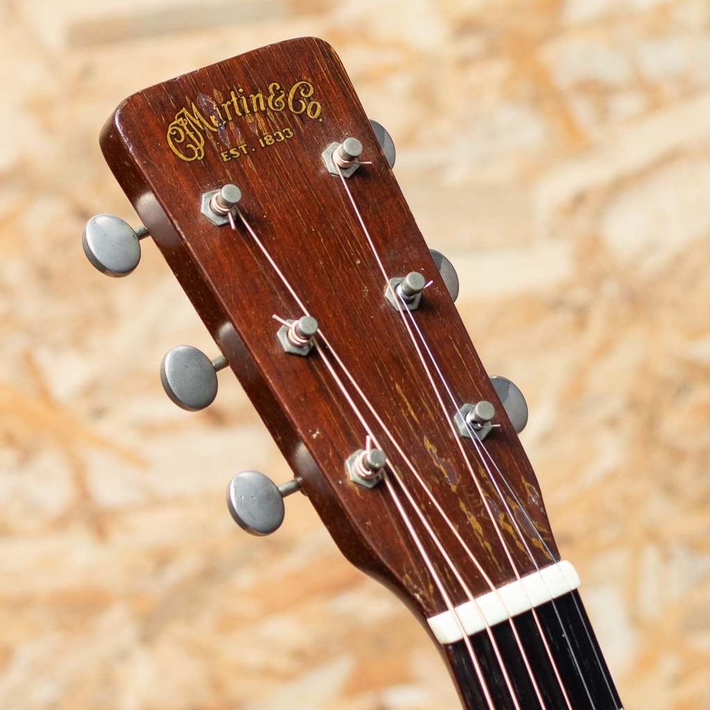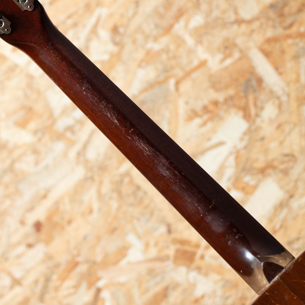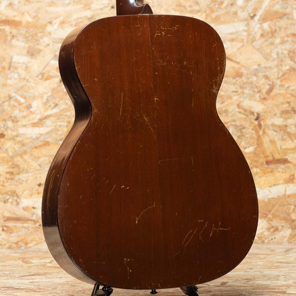 50sマーチン、”OOO-18”。小ぶりで抱えやすく、実用性の高いアイテムとして人気の高いモデルで、ビンテージマーチンでも”D”モデルと並び同社を代表するモデルとして長きにわたり製造され続けています。本器はビンテージマーチンでも”D”モデルと並び同社を代表するモデル1954年のVintage品。スプルーストップ、マホガニーサイド&バック、マホガニーネック、スチールTバーネックロッド、ハカランダ天神板、ハカランダ指板、ローズウッドブリッジ、オリジナル塗り込みベッコウ柄セルピックガード、オリジナルウェイバリーラウンドエンドオープンバックペグ、べっ甲柄セルロイドバインディング、ノンスキャロップドXブレイシング。エンドピンは交換されており、ブリッジはショートサドルタイプのものにリプレイス。トップブリッジ下に2個所、指板6弦側下サウンドホール脇に2個所のクラック補修ある他、全体的に傷やウェザーチェックが多く見受けられるものの、フレット交換・指板修正が行われており、演奏性ば抜群のプレイヤーコンディションです。小ぶりなボディならではの程よくロウが抑えられたミッドハイのレンジが主役のバランス。ドレッドノートとはまた異なる秀逸なヴィンテージトーンをお楽しみいただける一本。汎用ハードケースが付属いたします。