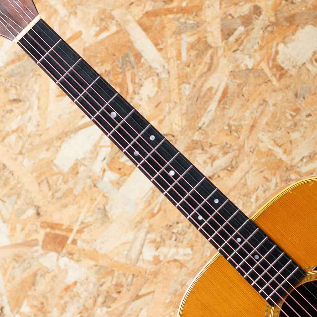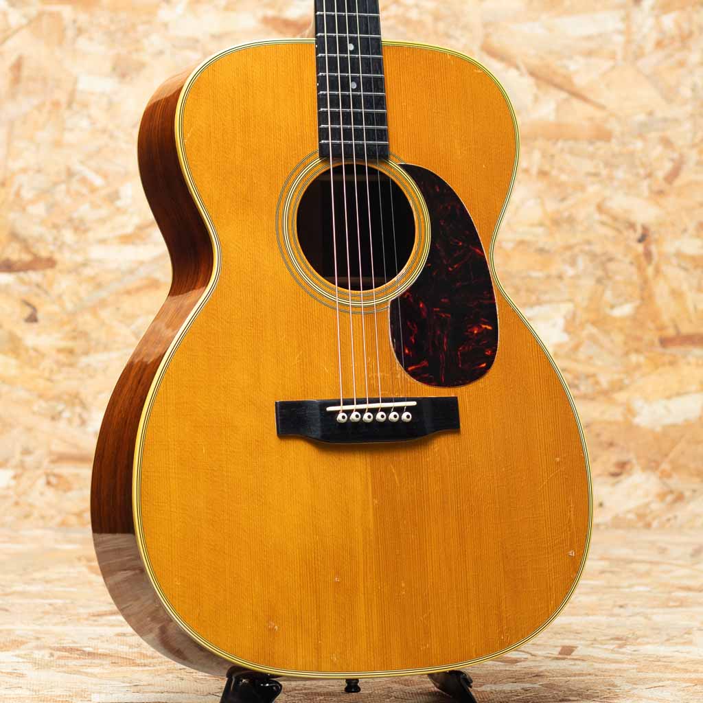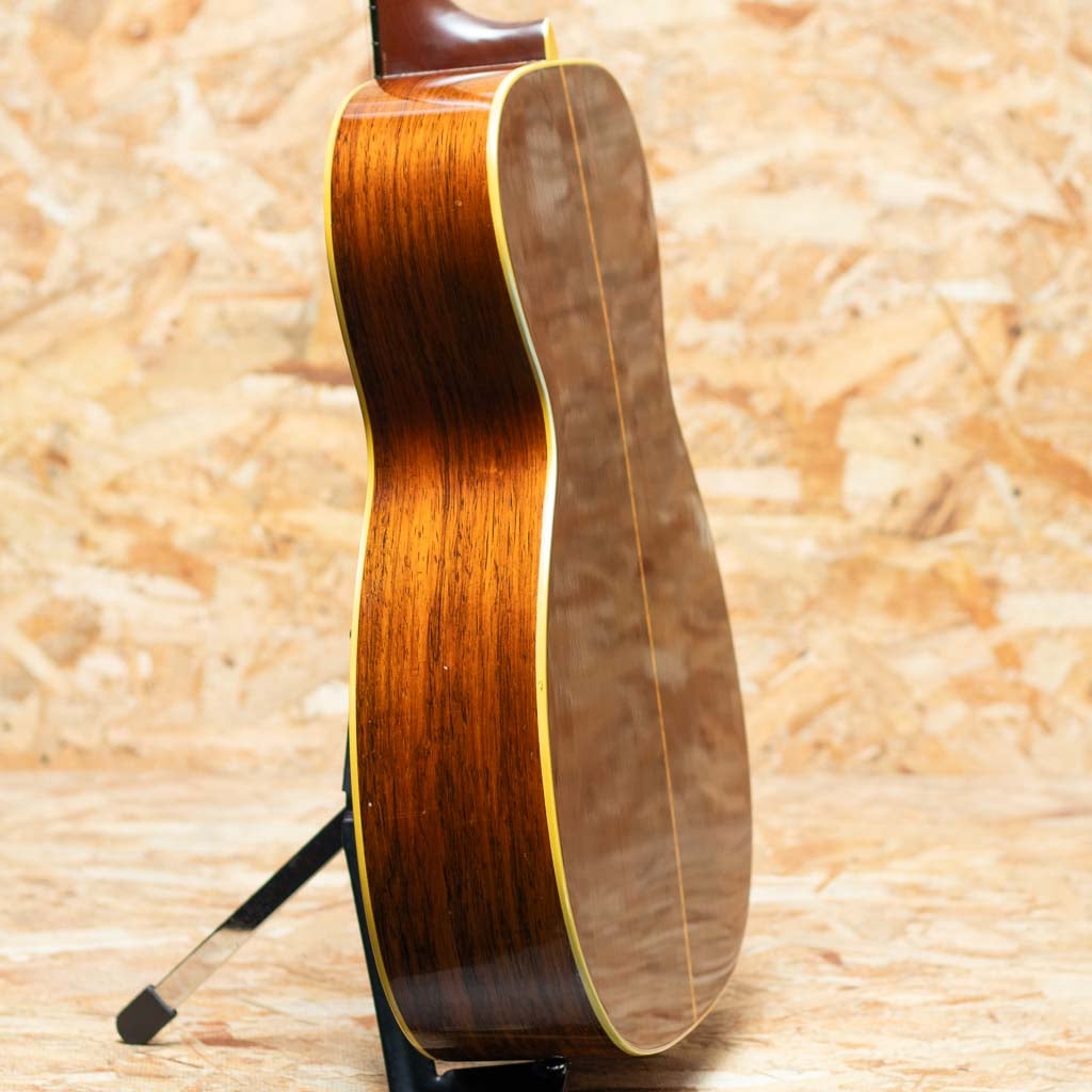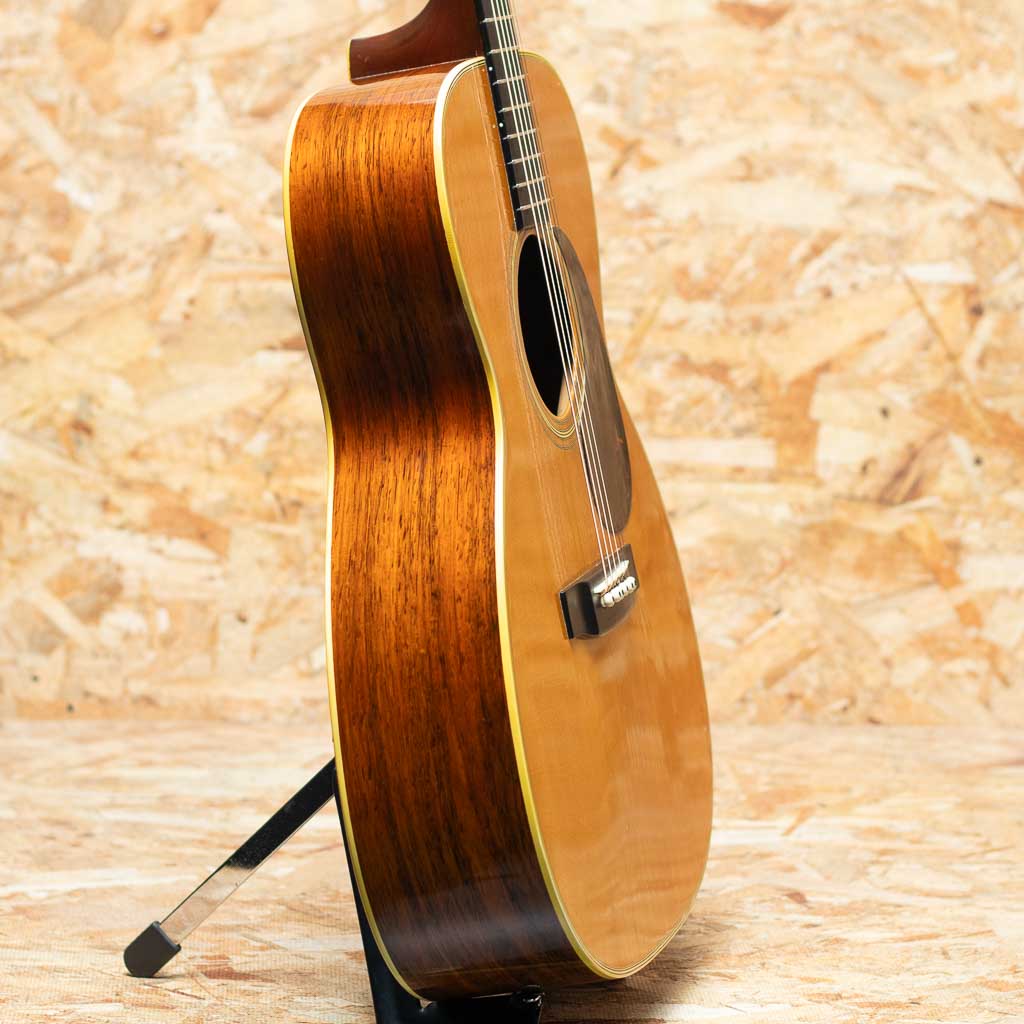 言わずと知れた"D-28"と並ぶトリプルオーサイズのロングセラーモデル"OOO-28"。小ぶりで抱えやすくトーンバランスに優れたオールマイティなモデル。本器はレギュラーでハカランダサイドバックのスペックを持つ晩年期の1966年製Vintage品。スプルーストップ、ハカランダサイド&バック、マホガニーネック、エボニー指板&ブリッジ、ハカランダ化粧板、パール指板ドット、ベッコウセルピックガード、チェッカーバックストリップ、スチールTバーロッド。ペグはゴトー製のものに交換されております。同時期のドレッドノートと比べておよそ五分の一とわずかな生産数であるため、この時代の000-28の流通は頻繁にありません。ショートスケールだからこそのファットなトーンで同年代のハカランダD-28とはひと味もふた味も違う魅力的なサウンド。ネック折れ修正がボリュート付近に確認でき、また、スキャロップドブレーシングライクなサウンドを得る為か、トップブレーシングが後から削られております。その他ピックガード下にマーチンクラックが見られますが、裏からパッチを当てた修理がされております。ボディ裏1弦側下部にクラック修正痕、その他年代相応の打痕が見られ、ボディーにはウェザーチェックがでております。また、フレット交換によりプレイコンディションは整えられており弾きやすいセットアップです。ドライでパンチの効いた立ち上がり、素早いバウンドと重厚で密度感のあるハカランダの響き。しっかりとコシがあり、T-Bar期特有のすっきりとしたもたつかない倍音バランスは、和音、単音共にオールマイティで良き相棒になりうるサウンドです。プレイヤーコンディションのヴィンテージ、ぜひご検討ください。汎用ハードケース付属。