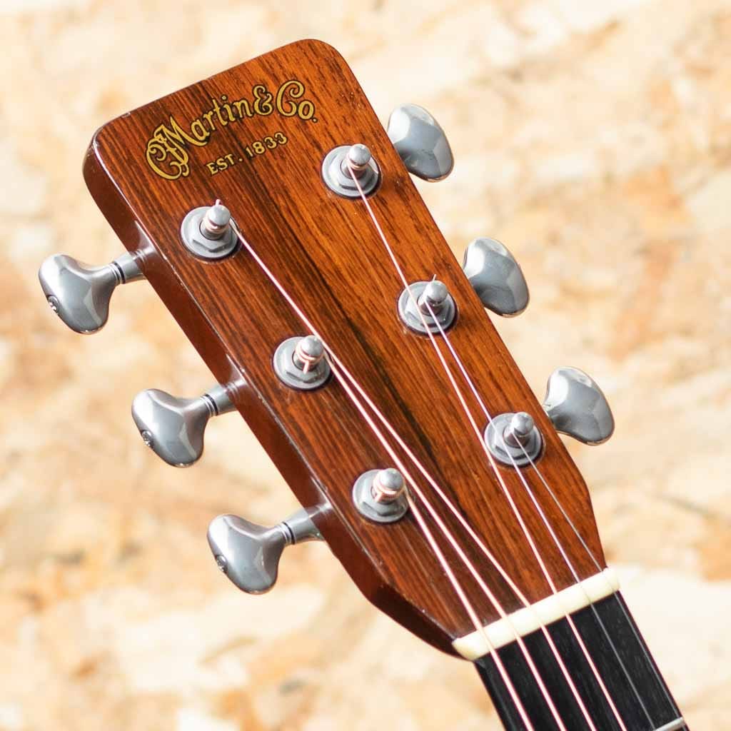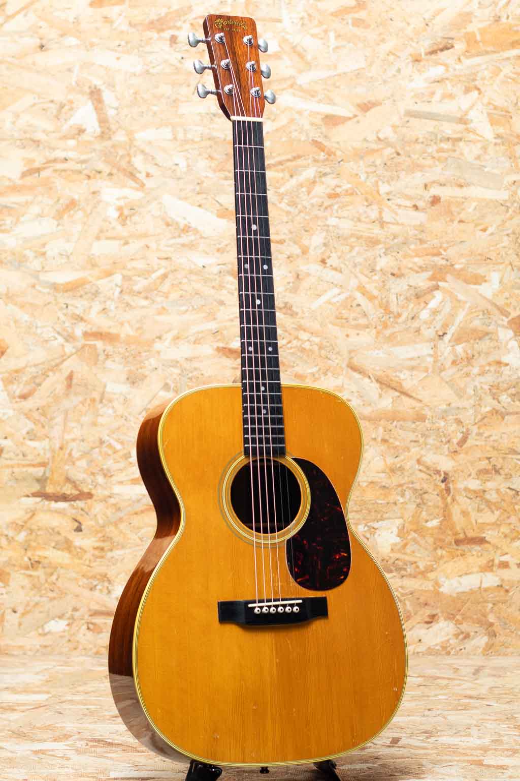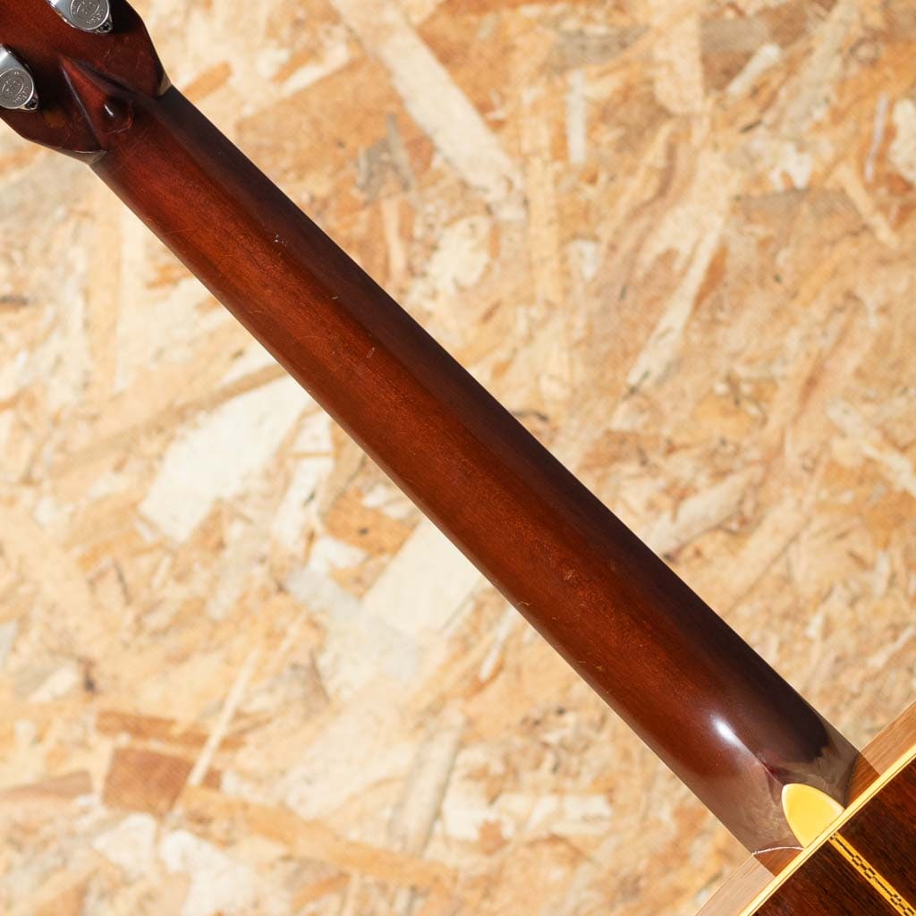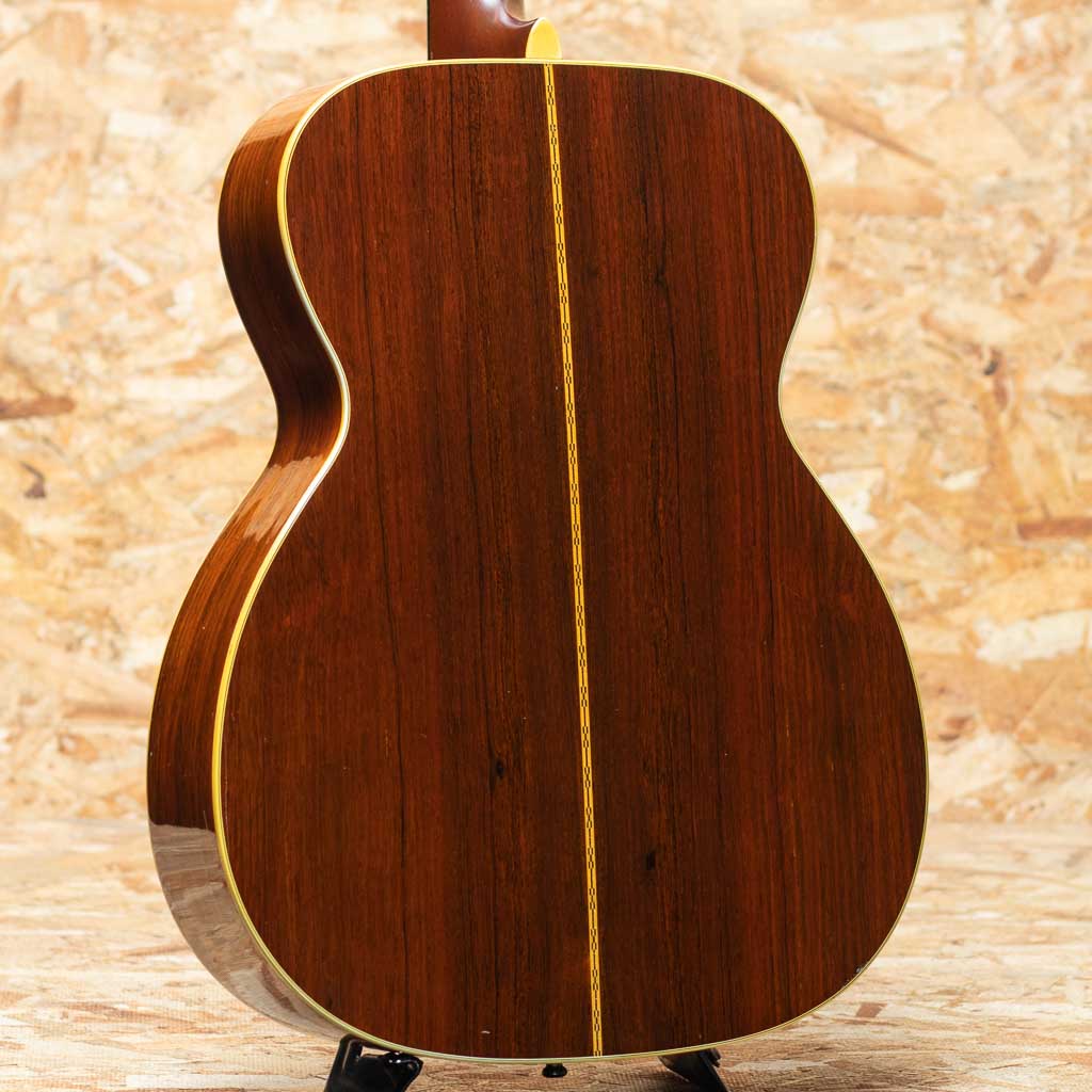 言わずと知れた"D-28"と並ぶトリプルオーサイズのロングセラーモデル"OOO-28"。小ぶりで抱えやすくトーンバランスに優れたオールマイティなモデル。本器はレギュラーでハカランダサイドバックのスペックを持つ晩年期の1966年製Vintage品。スプルーストップ、ハカランダサイド&バック、マホガニーネック、エボニー指板&ブリッジ、ハカランダ化粧板、パール指板ドット、ベッコウセルピックガード、チェッカーバックストリップ、スチールTバーロッド。ペグはゴトー製のものに交換されております。同時期のドレッドノートと比べておよそ五分の一とわずかな生産数であるため、この時代の000-28の流通は頻繁にありません。ショートスケールだからこそのファットなトーンで同年代のハカランダD-28とはひと味もふた味も違う魅力的なサウンド。ネック折れ修正がボリュート付近に確認でき、また、スキャロップドブレーシングライクなサウンドを得る為か、トップブレーシングが後から削られております。その他ピックガード下にマーチンクラックが見られますが、裏からパッチを当てた修理がされております。ボディ裏1弦側下部にクラック修正痕、その他年代相応の打痕が見られ、ボディーにはウェザーチェックがでております。また、フレット交換によりプレイコンディションは整えられており弾きやすいセットアップです。ドライでパンチの効いた立ち上がり、素早いバウンドと重厚で密度感のあるハカランダの響き。しっかりとコシがあり、T-Bar期特有のすっきりとしたもたつかない倍音バランスは、和音、単音共にオールマイティで良き相棒になりうるサウンドです。プレイヤーコンディションのヴィンテージ、ぜひご検討ください。汎用ハードケース付属。