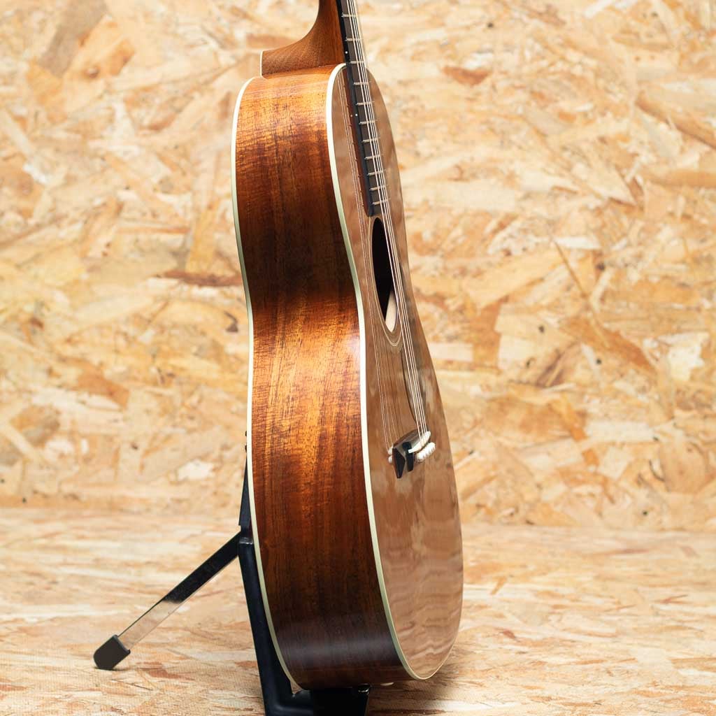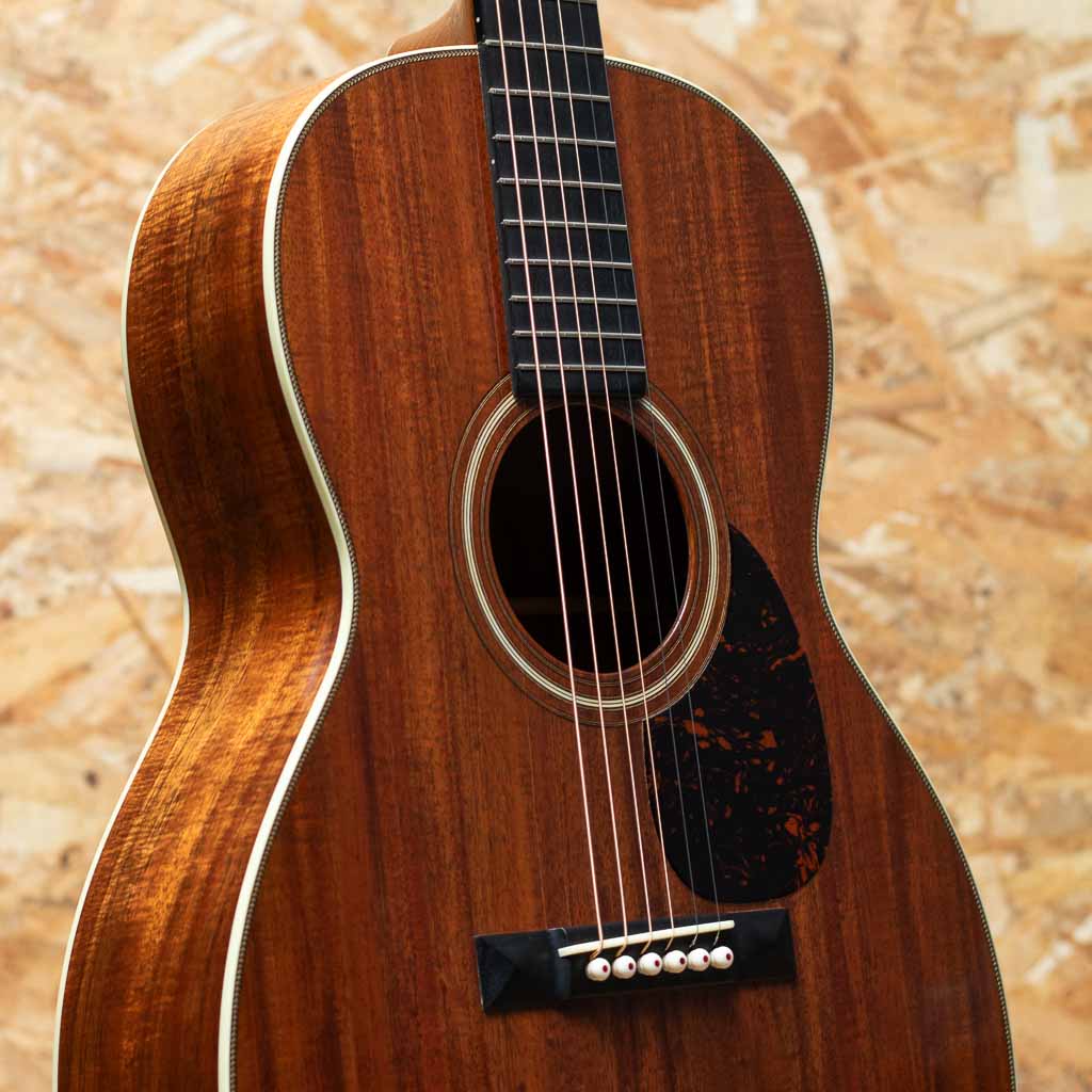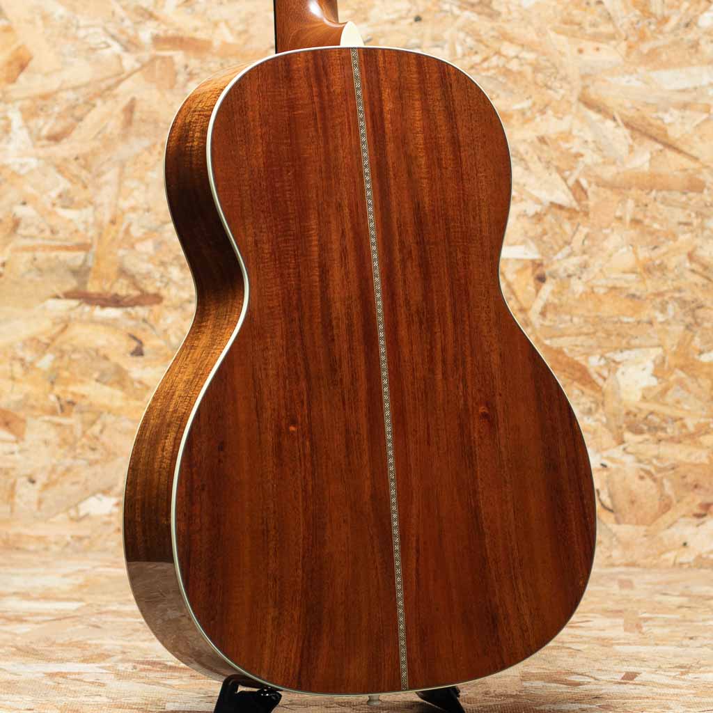 今までマーチンは数々の過去に存在した品番の復刻モデルを世に生み出してきました。中でもその完成度の高さから人気を博している『Authentic Series』。本器はハイグレードのコア材をボディの全面に使用した”000-28K Authentic 1921”2015極上USED品。マーティン本社に併設したギターミュージアムにある1921年製000-28Kに基づいて製作され、忠実に再現されたスロテッドヘッドは、マダガスカルローズウッドのヘッドプレートにロゴ無し、ヘッド角やボリュートのダイヤモンド等、拘りが詰まっております。接着にハイド・グルー(ニカワ)を用いて組み上げられ、ブレイシングにはアディロンダックスプルース材を使用(1921年頃風オリジナルスタンダードスキャロップドXブレイス)。弾けば振動の伝達の良さ、パワフルさが体感できます。12フレットジョイント、47.6ミリのワイドネック、補強芯にスティールTバーロッドの使用、サイドの割れ止めテープ、アンダーフィニッシュ仕上げのデルマー社製面取りべっ甲柄ピックガード、パターンの細かいファインヘリンボーンの縁取り、ピラミッドブリッジにロングサドル、経年変化したような色合いを出すエイジングトナーのフィニッシュ等、再現度のレベルも高いモデルです。バインディングハガレの修理跡がわずかに見られる程度で、その他光にかざしてかすかに見える程度の薄いキズが確認できる程度でほとんど使用感を感じない大変きれいなこの上ない状態。この小さなボディからは想像もできないほど奥行きのある響きを持ちコア材特有のブライトさやキレのよさを併せ持ちます。圧倒的に生産本数の少ない希少モデルとなっておりますのでお早めの検討をおすすめします。オリジナルハードケース付属
