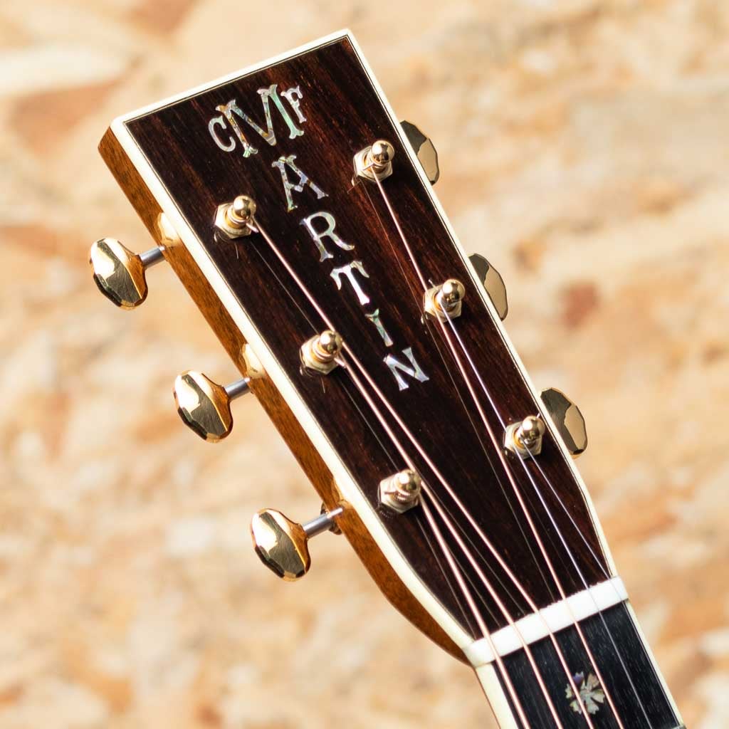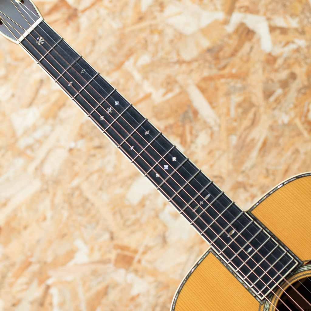 現マーチン工場の中でも、卓越した技術と豊富な経験から至極のギターを造り出す"Martin Custom Shop"。レギュラーラインとは全く異なった環境、工程にて製作。工場の一角に専用の区画があり、昔ながらの工法を継承しながらより精度の高い製作を行っています。ラインナップ上最高峰と言えるオーセンティックシリーズの製作をはじめ、高い完成度を誇るカスタムモデルを製造するトップクラスの部門です。本器はカスタムショップ製”CTM OOO-45 Adirondack Spruce Cocobolo”。2018年製のUSED品です。アディロンダックスプルーストップ、ココボロサイド&バック、44.5mmナット幅、ロープロファイルネックシェイプ、ブラックエボニー指板&ブリッジ、ロングサドル、Style45スノウフレイク指板ポジション、アバロンロゼッタ、Schaller GrandTuneゴールドペグ、ベッコウ柄ピックガード、オールドスタイルヘッドロゴ、2wayアジャスタブルロッド、アディロンダックスプルース材によるGolden EraスキャロップドXブレイシング。アディロンダックスプルース×ココボロの組み合わせによってパンチのあるトーンに幅広いレンジ、深い奥行きのある濃密なサウンド。45ならではのきらびやかな倍音感も十二分にお楽しみいただけます。バック・ストリップ脇にクラックがございますが、目を凝らさなければわからないほどきれいに補修がされています。その他、薄いスクラッチ傷やわずかな使用感はございますが、ネックのコンディションは非常に良好。現行Martinの最高峰チームが作り上げる、至極のサウンドを体感できる1本。是非お試し下さいませ。オリジナルハードケースが付属します。