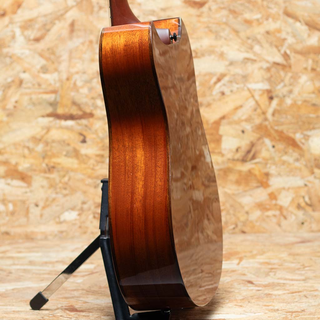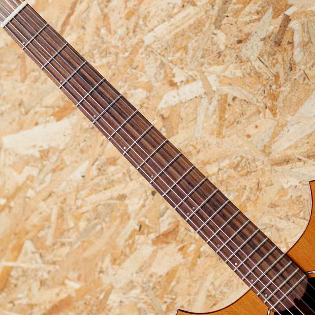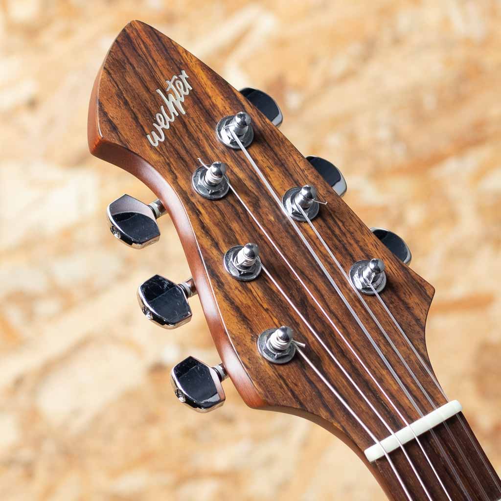 アメリカの弦楽器製作家"Abraham Wechter"が手掛ける"Wechter Guitars"。過去にはリチャード・シュナイダーと共にGibson "MARKシリーズ"の製作にも参加。彼の製作したカスタムギターはジョン・マクラフリン、アル・ディメオラ、ジョン・デンバー、吉田拓郎など著名アーティストが使用されていました。トラディショナルに固執せず常に革新的な可能性を求めるブランドとして広く認知されております。本器はWchterギターの最も特徴的なダブルカッタウェイがインパクト大の"Pathmaker"の珍しいナイロンモデルのUSED品。シダートップ、マホガニーサイド&バック、マホガニーネック、ローズウッド指板&ブリッジ、Fishman Prefix Onboard Blender搭載。ナイロンモデルですがアコースティックと同様のナット幅にハイポジションも演奏製抜群の19フレットジョイントでエレキなどからの持ち替えにもおすすめです。マイクのブレンドも出来るFishmanPU搭載でステージ等でもご活用いただけます。ネックヒール裏にストラップピンの増設、その他傷・打痕等の使用感は見られます。一目で目を引くルックスで、まさにステージ向けなモデルです。近頃ではなかなか見かけなくなったWechter・パスメイカー。オリジナルハードケース付属です。