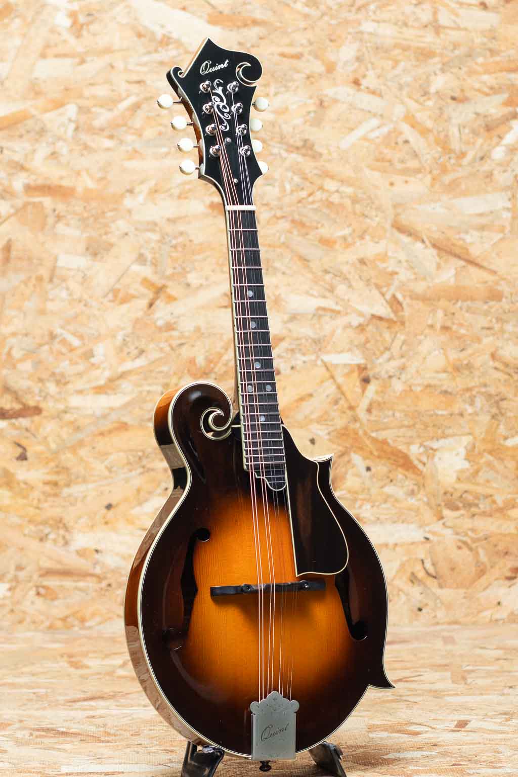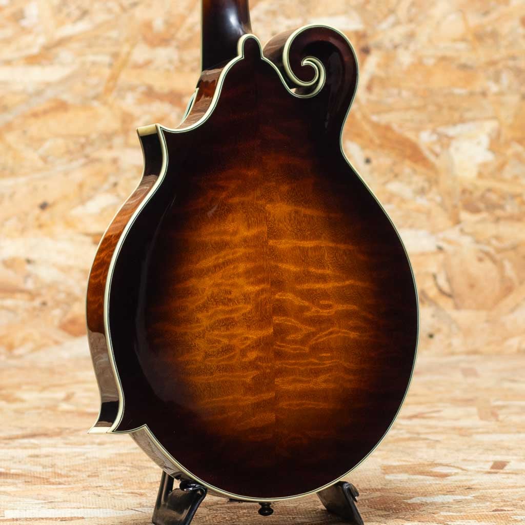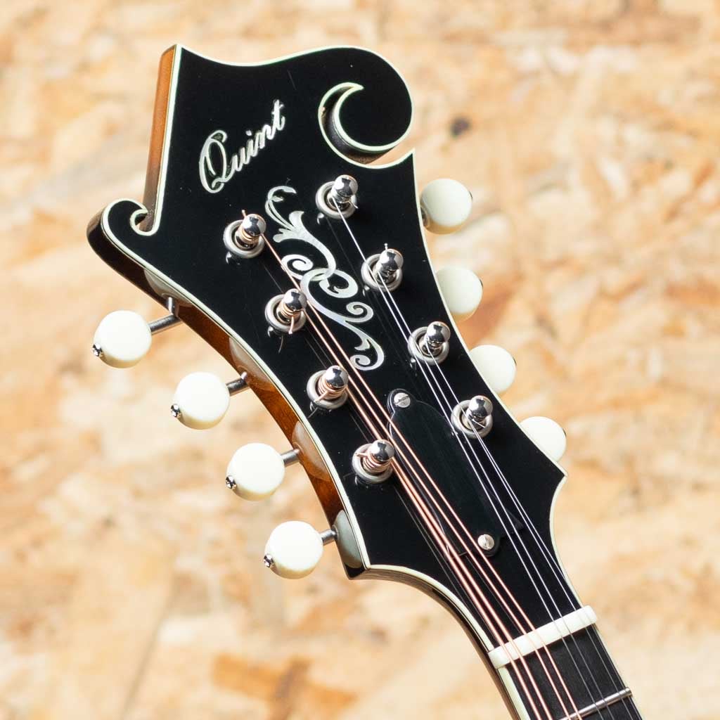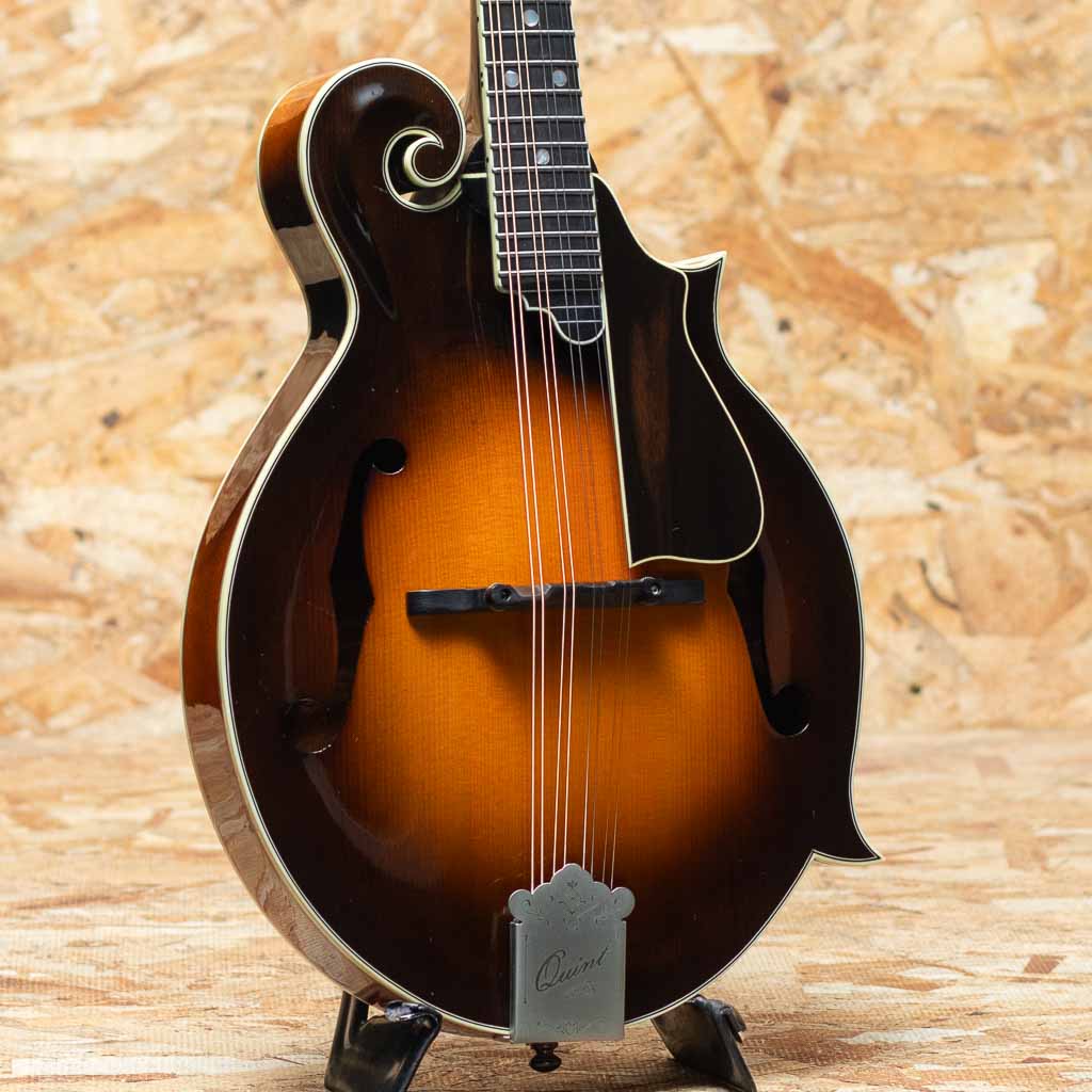 中国のトップルシアーMr.Qin Ji Duoによりハンドメイド製作されるQuint Mandolin。当器はQT-F5 2023年製USED品。プレミアムイタリアンスプルーストップ、プレミアムスイスタイガーメイプルバック、エボニー指板&ブリッジ、後藤ペグ、アイボロイドバインディング、塗装は現在ニトロセルロースラッカーフィニッシュに変更されていますが当個体は変更以前のフレンチポリッシュ仕上げです。手作業による削りだしの美しいアーチドトップ、Radius指板、ミディアムサイズのフレット、オリジナルのフローティングピックガードなど高い工作精度とセンスを感じさせてくれます。ソフトVシェイプネックにRadius指板、指板エンドのスクープ加工と操作性を高めた仕様で大変弾きやすく感じます。全体的に細かな使用キズは見られますが大きなダメージもなくプレイコンディションは良好です。艶感と引き締まった音像で柔らかで輪郭の整った発音、ボリューミーな鳴りで弾きごたえがありブルーグラスはもちろん多様なジャンルで使えるおすすめのフラマンです。グラスファーイバーケース付属