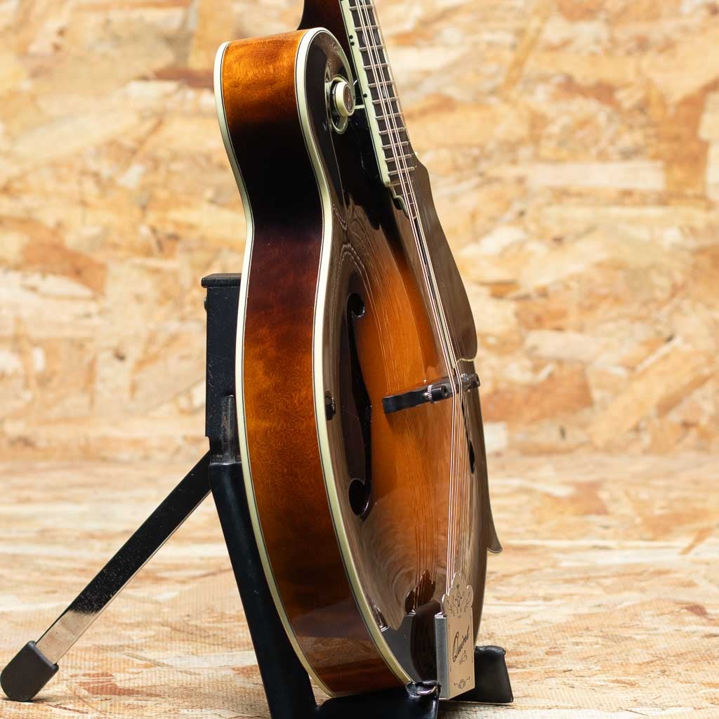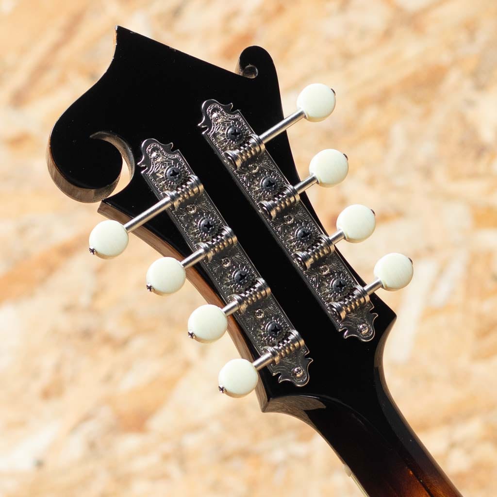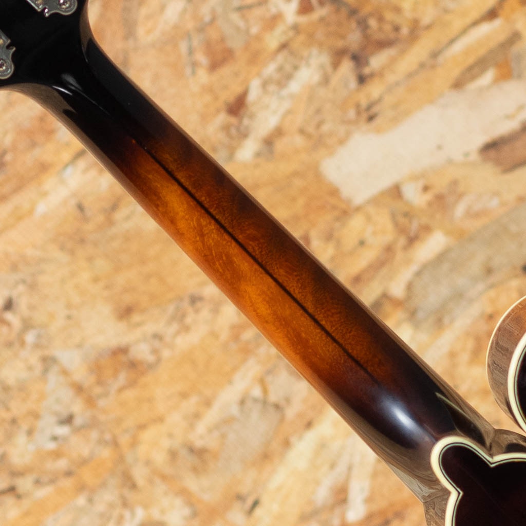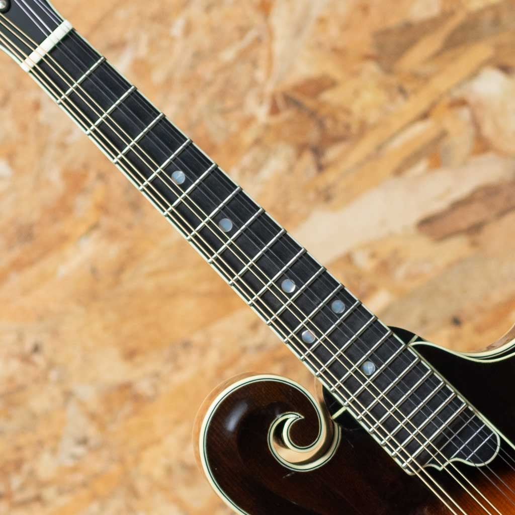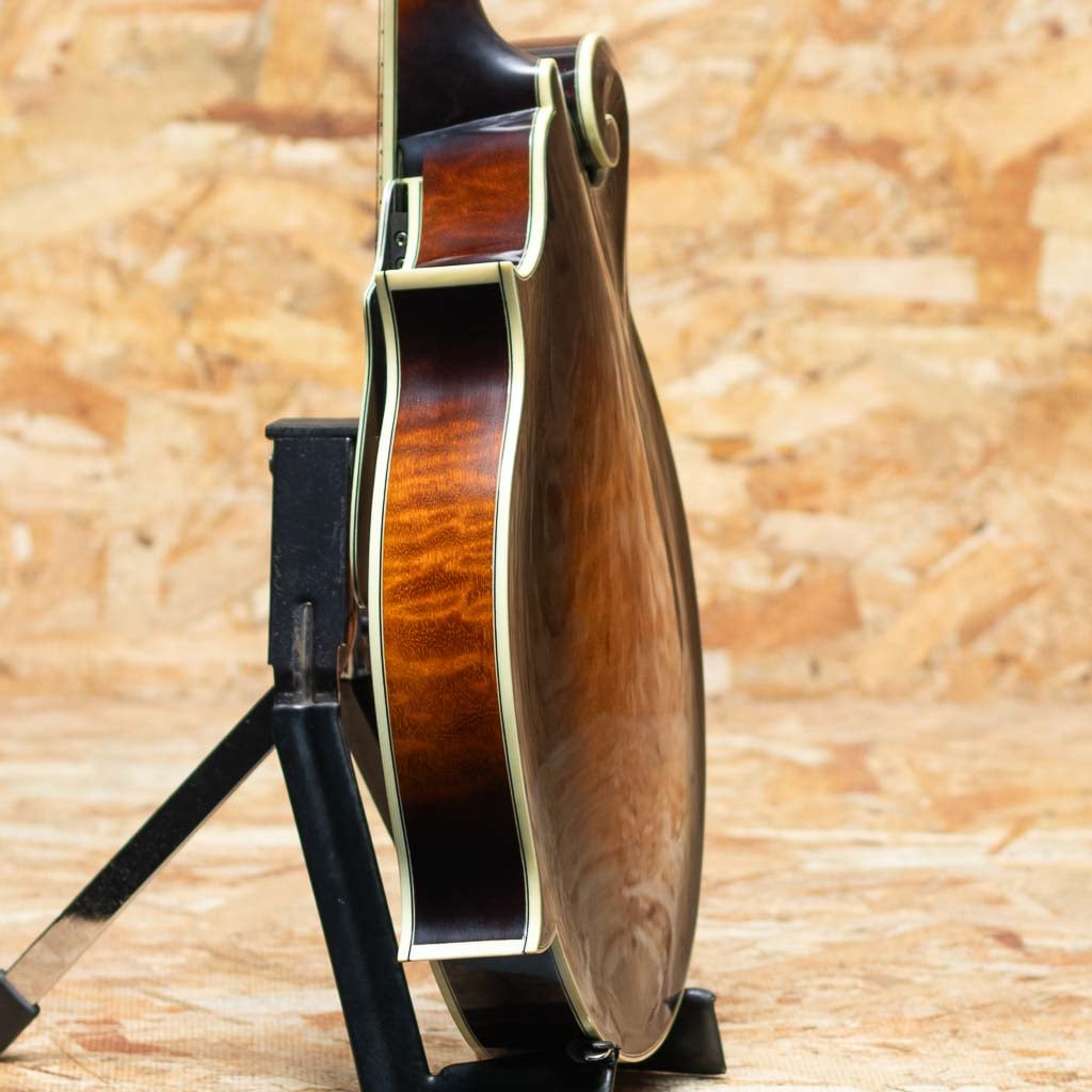 中国のトップルシアーMr.Qin Ji Duoによりハンドメイド製作されるQuint Mandolin。当器はQT-F5 2023年製USED品。プレミアムイタリアンスプルーストップ、プレミアムスイスタイガーメイプルバック、エボニー指板&ブリッジ、後藤ペグ、アイボロイドバインディング、塗装は現在ニトロセルロースラッカーフィニッシュに変更されていますが当個体は変更以前のフレンチポリッシュ仕上げです。手作業による削りだしの美しいアーチドトップ、Radius指板、ミディアムサイズのフレット、オリジナルのフローティングピックガードなど高い工作精度とセンスを感じさせてくれます。ソフトVシェイプネックにRadius指板、指板エンドのスクープ加工と操作性を高めた仕様で大変弾きやすく感じます。全体的に細かな使用キズは見られますが大きなダメージもなくプレイコンディションは良好です。艶感と引き締まった音像で柔らかで輪郭の整った発音、ボリューミーな鳴りで弾きごたえがありブルーグラスはもちろん多様なジャンルで使えるおすすめのフラマンです。グラスファーイバーケース付属