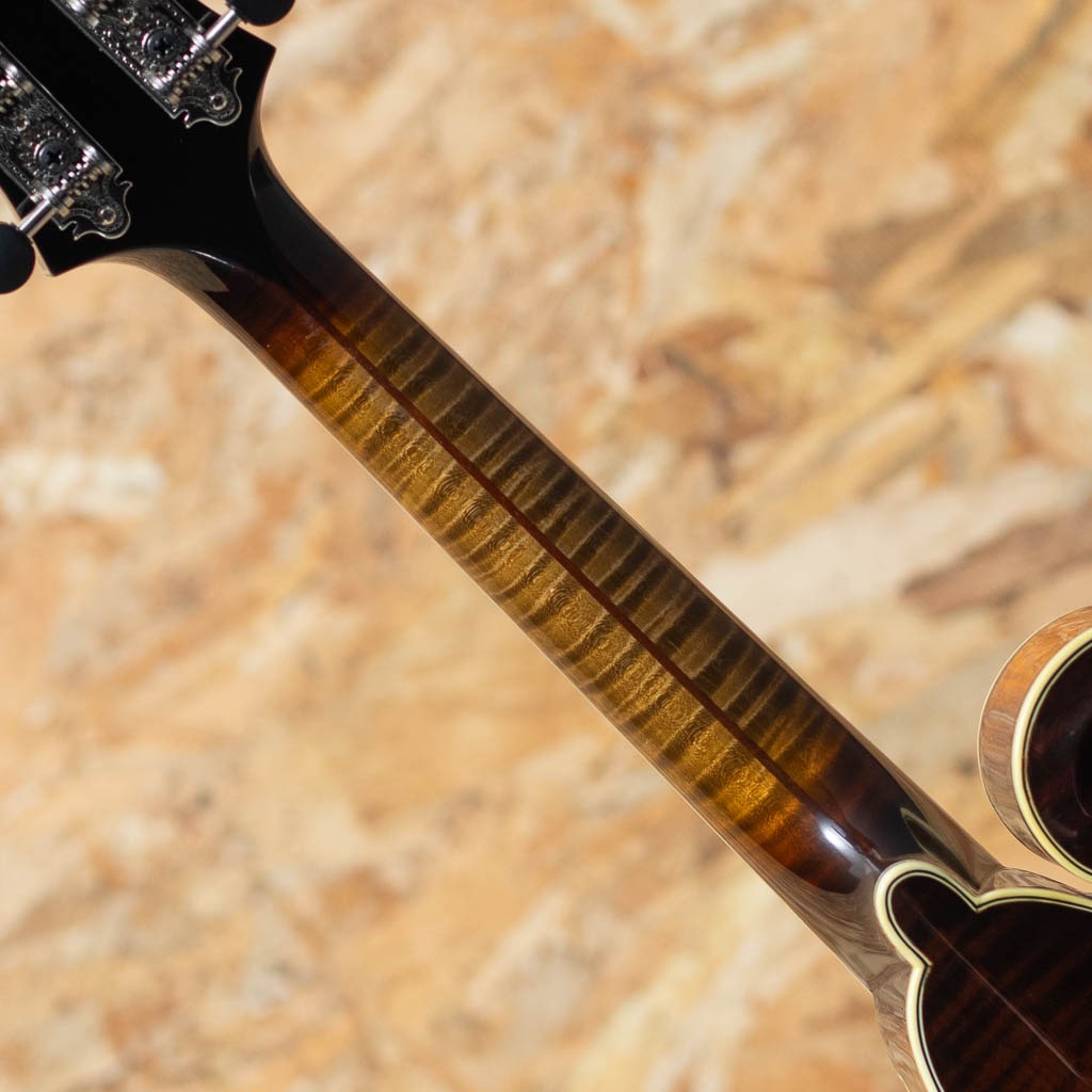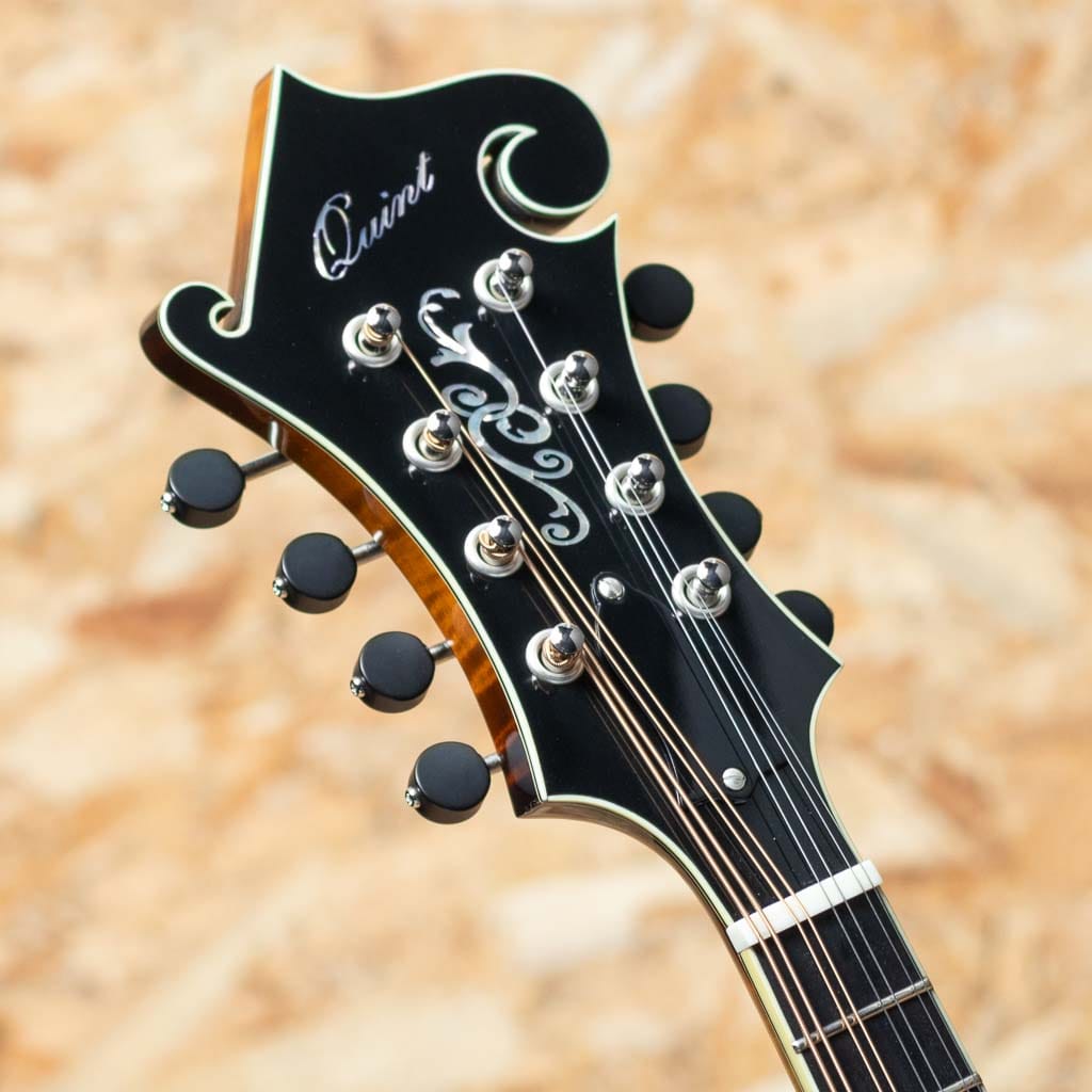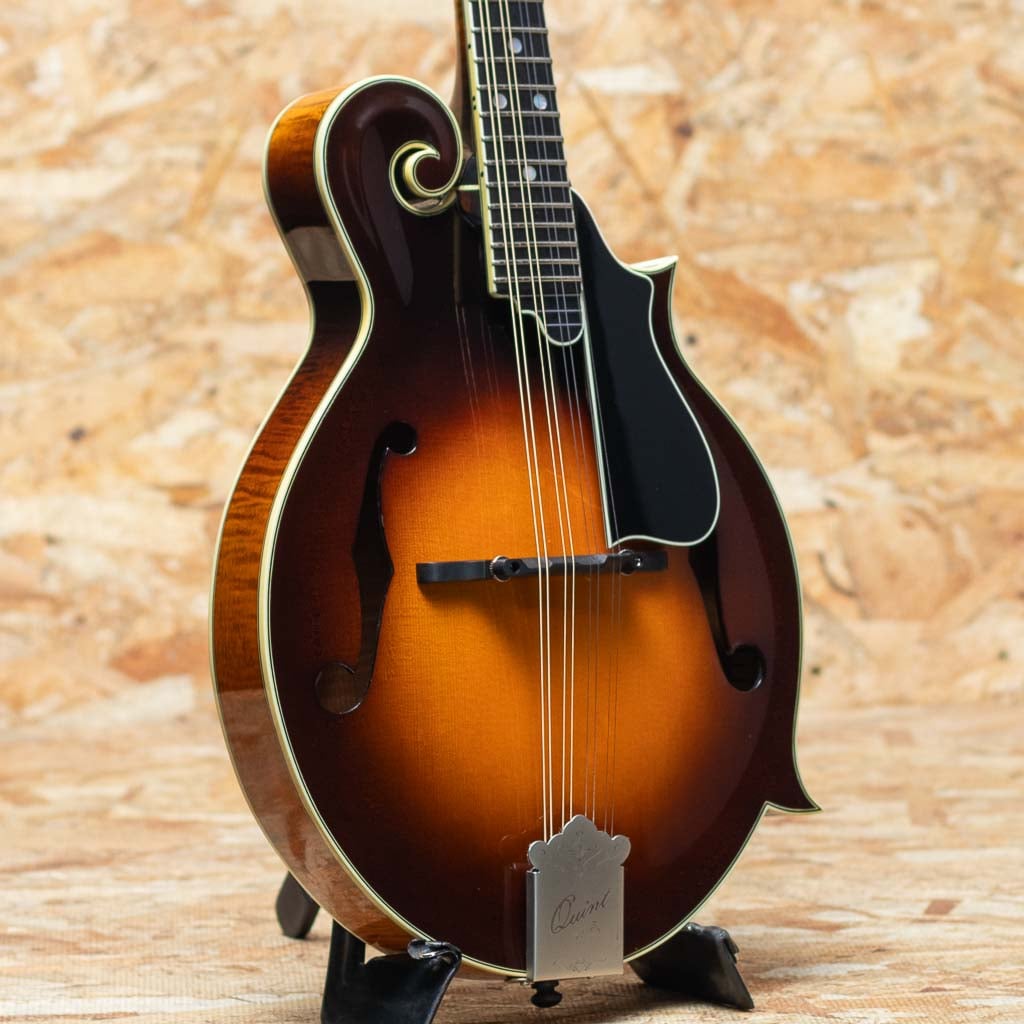 いくつかのメーカーで楽器製作を学び、その後North Field Mandolin立ち上げから製作に関わった後、2016年に独立する中国のMaster Luthier Qin Ji Duoが製作するQuint Mandolin。人気のF5モデルにトリファイド加工の施された材を使用したモデルが追加されました。トリファイドプレミアムイタリアンスプルーストップ、トリファイドプレミアムスイスタイガーメイプルバック、トリファイドタイガーメイプルネック、エボニー指板&ブリッジ、後藤ペグ、アイボロイドバインディング、セラックバーニッシュ仕上げです。Radius指板にミディアムフレット、指板エンドは短めで20fからスクープ加工が施されており抜群の操作性を誇ります。トリファイド加工をした材をボディーとネックに使用し、弾き込まれた個体の様なドライな音質となり、レスポンス感に優れ、美しい粒立ちの響きのするバージョンです。また大変手間のかかるセラックバーニッシュフィニッシュの為大変繊細ですが、その分ウッディーな鳴りに非常に貢献しています。ブルーグラスはもちろん多様なジャンルで使えるおすすめのフラマンです。グラスファイバーケース付属
