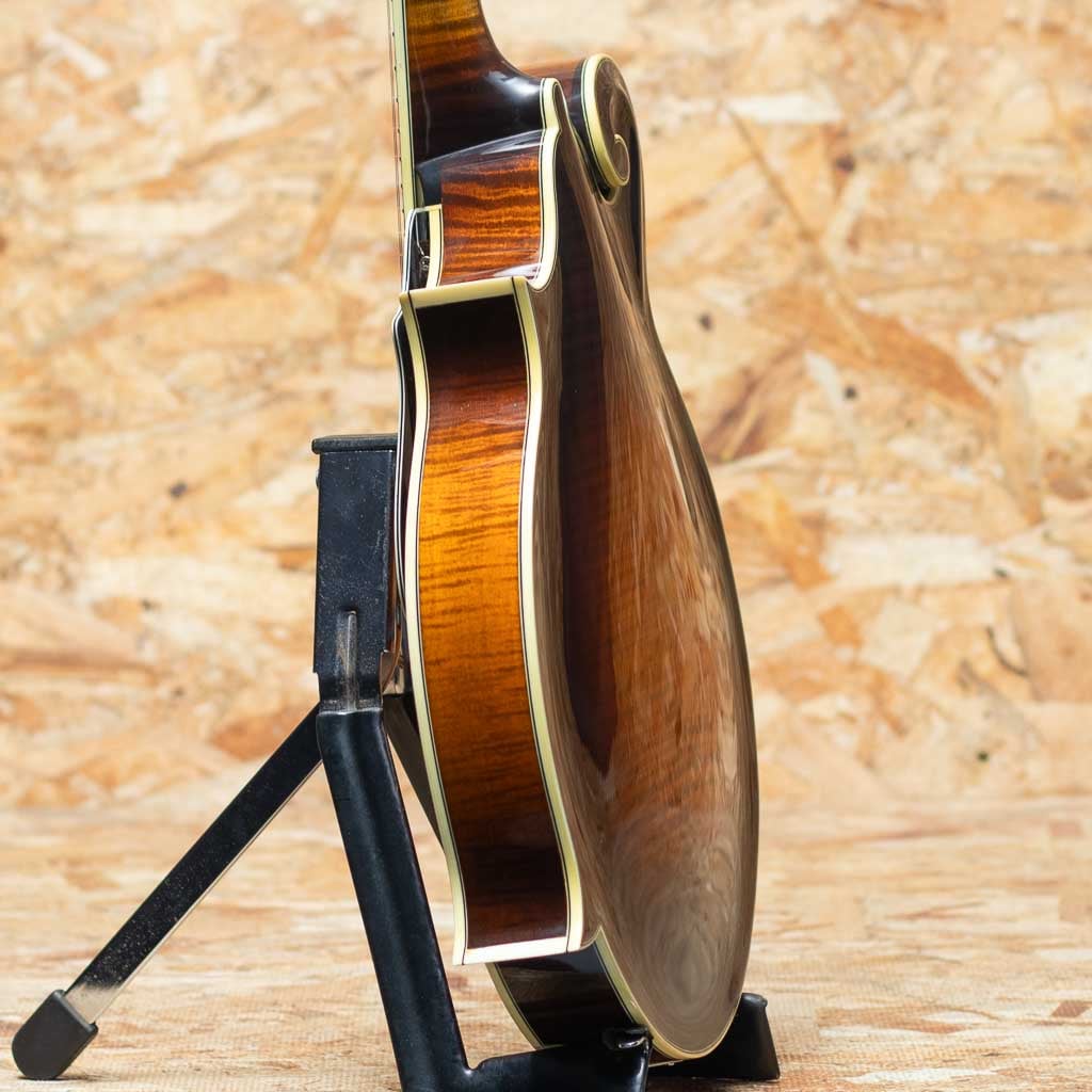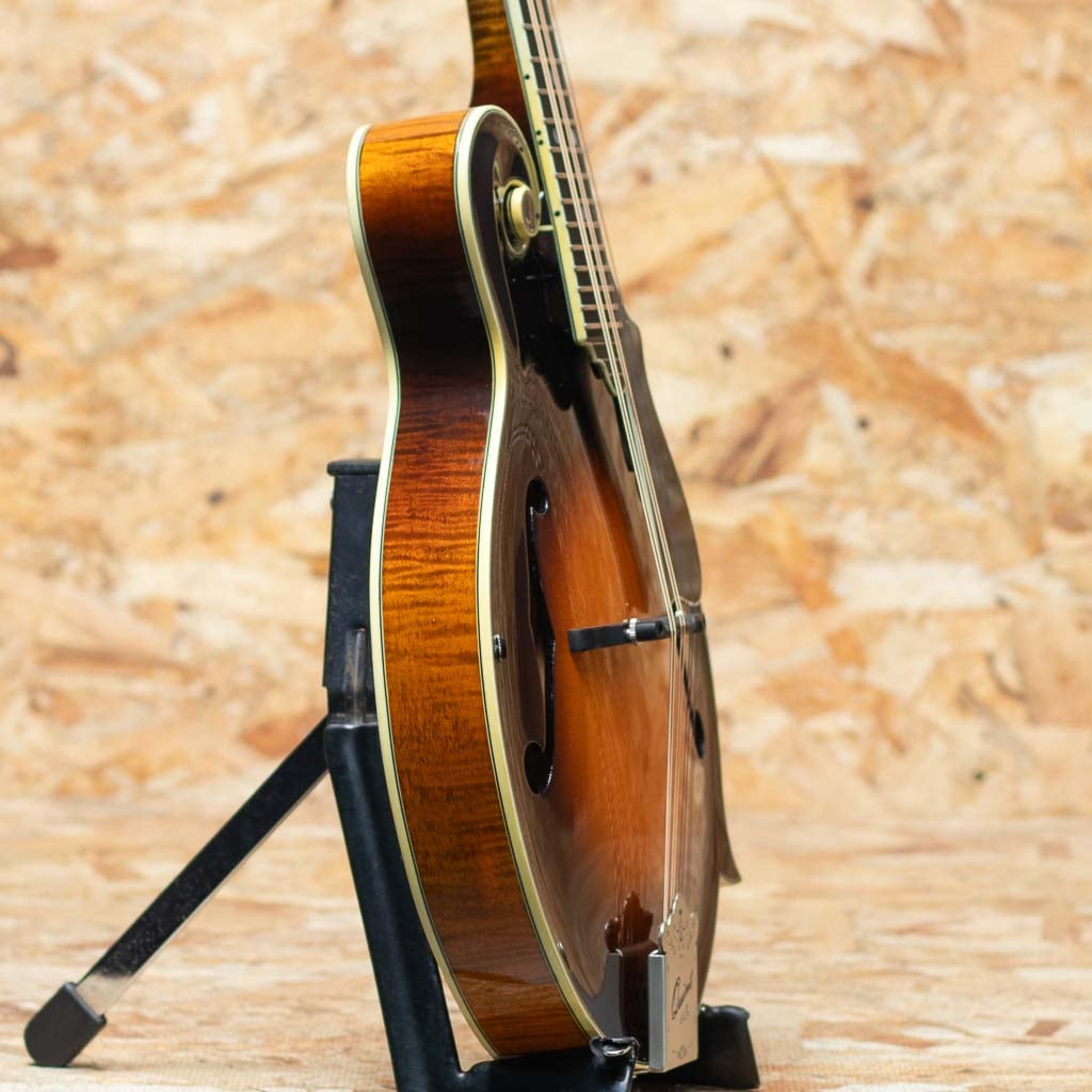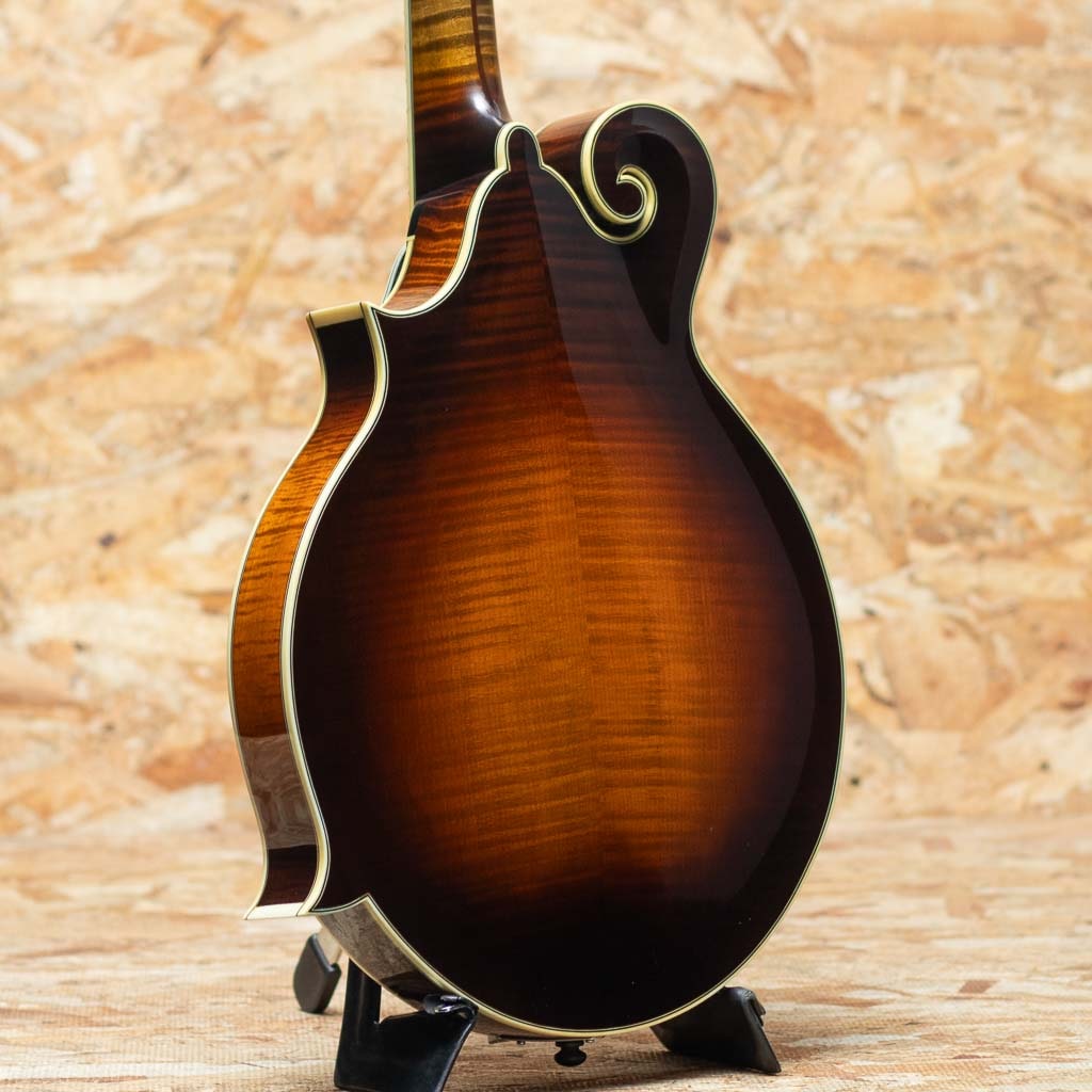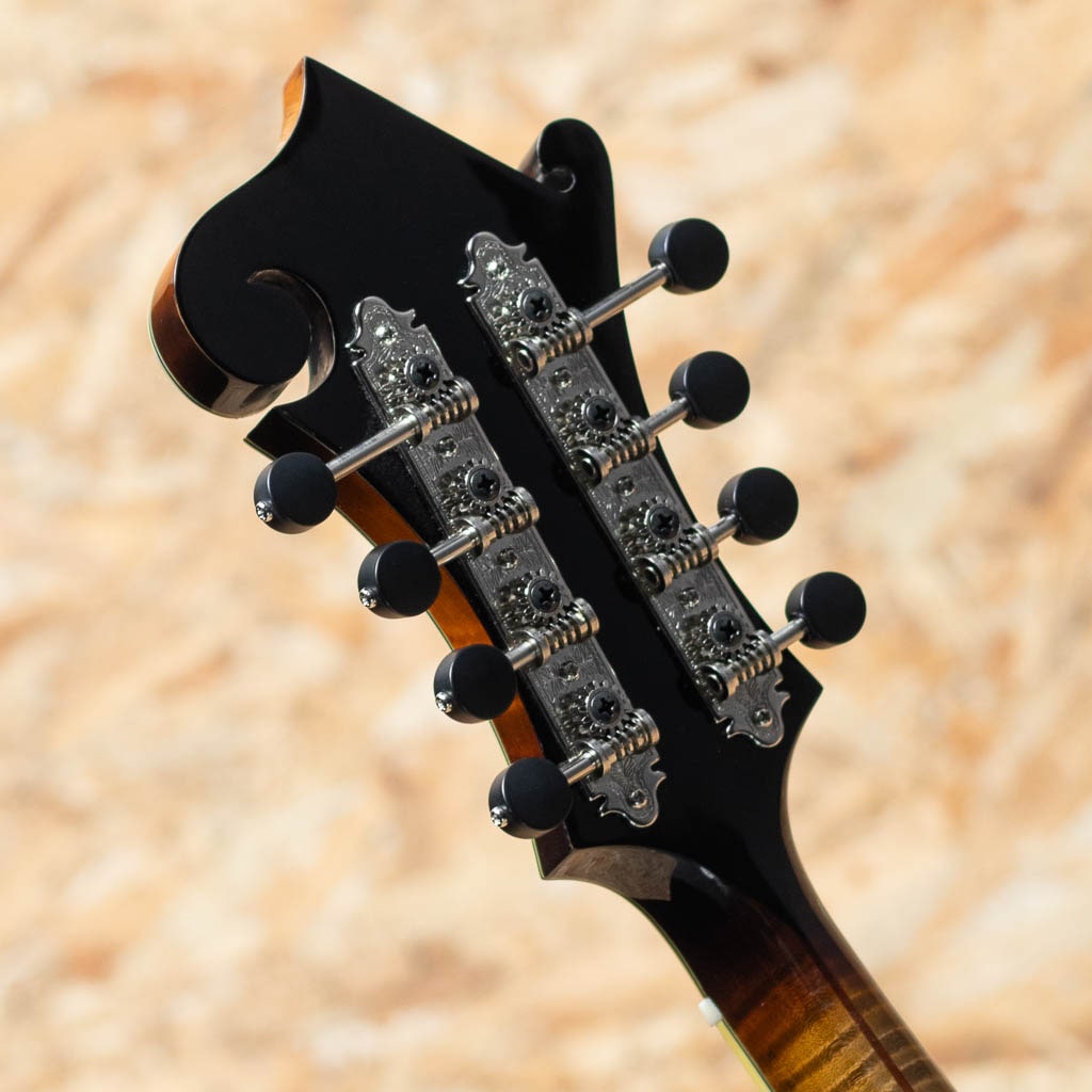 いくつかのメーカーで楽器製作を学び、その後North Field Mandolin立ち上げから製作に関わった後、2016年に独立する中国のMaster Luthier Qin Ji Duoが製作するQuint Mandolin。人気のF5モデルにトリファイド加工の施された材を使用したモデルが追加されました。トリファイドプレミアムイタリアンスプルーストップ、トリファイドプレミアムスイスタイガーメイプルバック、トリファイドタイガーメイプルネック、エボニー指板&ブリッジ、後藤ペグ、アイボロイドバインディング、セラックバーニッシュ仕上げです。Radius指板にミディアムフレット、指板エンドは短めで20fからスクープ加工が施されており抜群の操作性を誇ります。トリファイド加工をした材をボディーとネックに使用し、弾き込まれた個体の様なドライな音質となり、レスポンス感に優れ、美しい粒立ちの響きのするバージョンです。また大変手間のかかるセラックバーニッシュフィニッシュの為大変繊細ですが、その分ウッディーな鳴りに非常に貢献しています。ブルーグラスはもちろん多様なジャンルで使えるおすすめのフラマンです。グラスファイバーケース付属