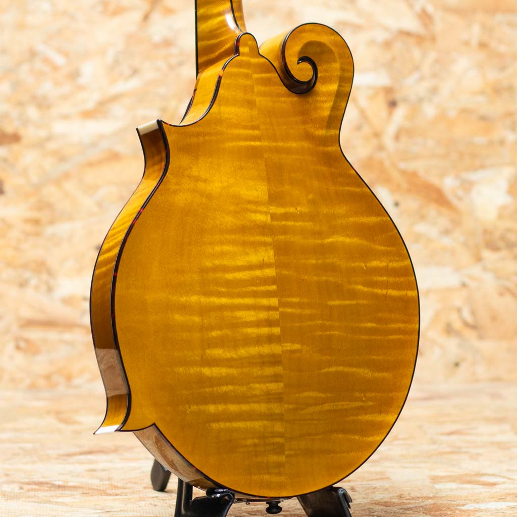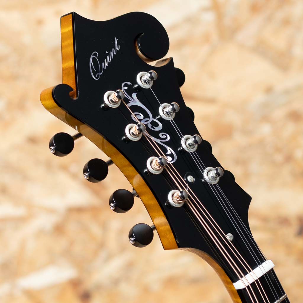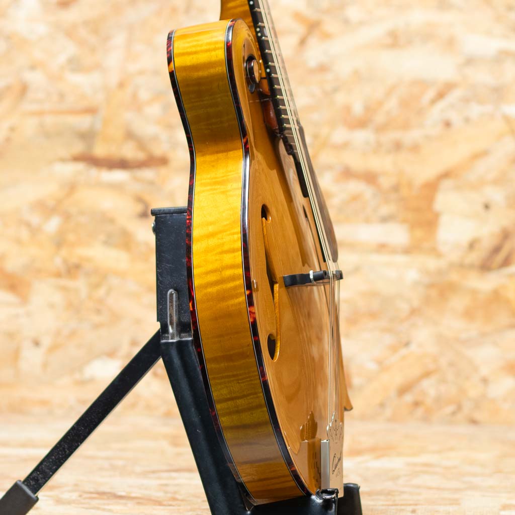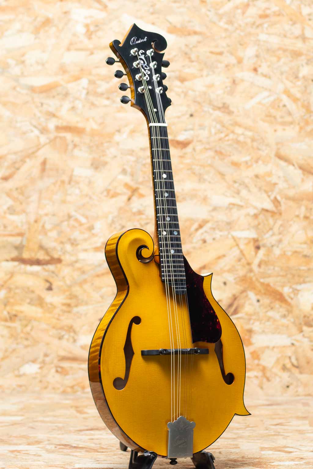 いくつかのメーカーで楽器製作を学び、その後North Field Mandolin立ち上げから製作に関わった後に独立する中国のMaster Luthier Qin Ji Duoが製作するQuint Mandolin。プレミアムイタリアンスプルーストップ、プレミアムスイスタイガーメイプルバック、エボニー指板&ブリッジ、後藤ペグ、アイボロイドバインディング、ニトロセルロースラッカーイェローナチュラルカラーフィニッシュです。手作業による削りだしの美しいアーチドトップ、Radius指板、ミディアムサイズのフレット、オリジナルのフローティングピックガードなど高い工作精度とセンスを感じさせてくれます。ソフトVシェイプネックにRadius指板、指板エンドのスクープ加工と操作性を高めた仕様で大変弾きやすく感じます。極薄のニトロセルロースラッカーフィニッシュの美しい艶感と引き締まった音像でブルーグラスはもちろん多様なジャンルで使えるおすすめのフラマンです。グラスファーイバーケース付属