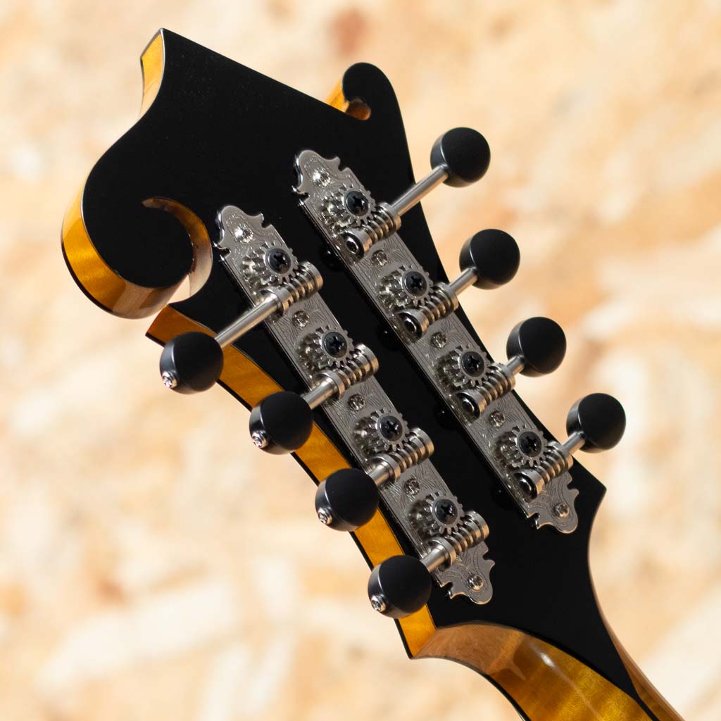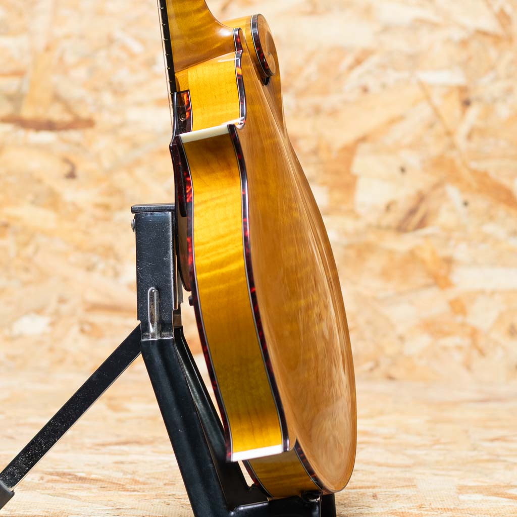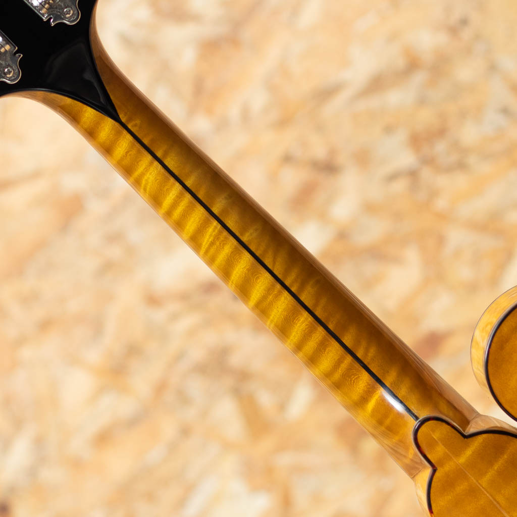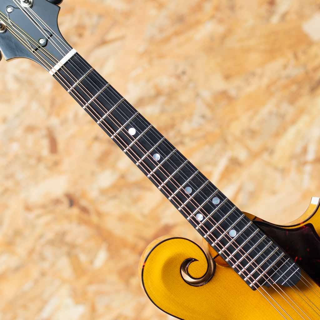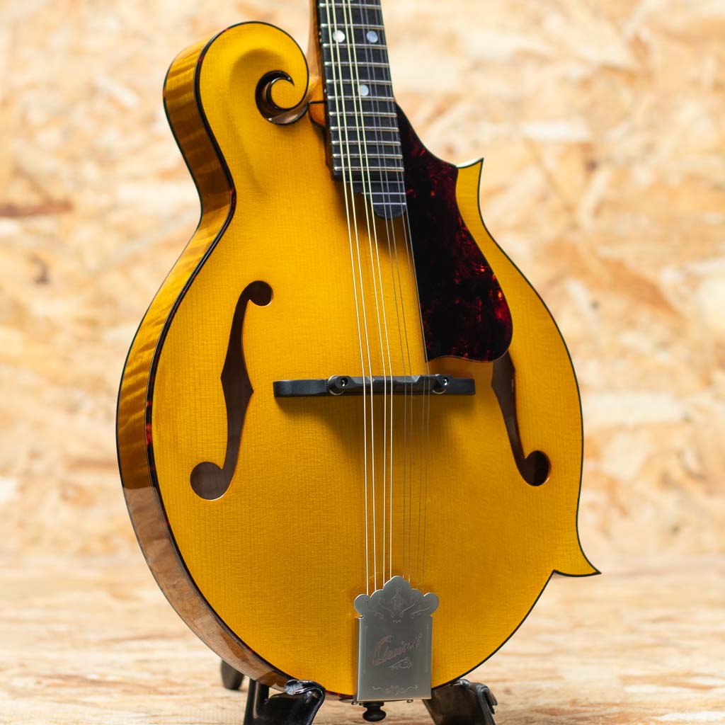 いくつかのメーカーで楽器製作を学び、その後North Field Mandolin立ち上げから製作に関わった後に独立する中国のMaster Luthier Qin Ji Duoが製作するQuint Mandolin。プレミアムイタリアンスプルーストップ、プレミアムスイスタイガーメイプルバック、エボニー指板&ブリッジ、後藤ペグ、アイボロイドバインディング、ニトロセルロースラッカーイェローナチュラルカラーフィニッシュです。手作業による削りだしの美しいアーチドトップ、Radius指板、ミディアムサイズのフレット、オリジナルのフローティングピックガードなど高い工作精度とセンスを感じさせてくれます。ソフトVシェイプネックにRadius指板、指板エンドのスクープ加工と操作性を高めた仕様で大変弾きやすく感じます。極薄のニトロセルロースラッカーフィニッシュの美しい艶感と引き締まった音像でブルーグラスはもちろん多様なジャンルで使えるおすすめのフラマンです。グラスファーイバーケース付属
