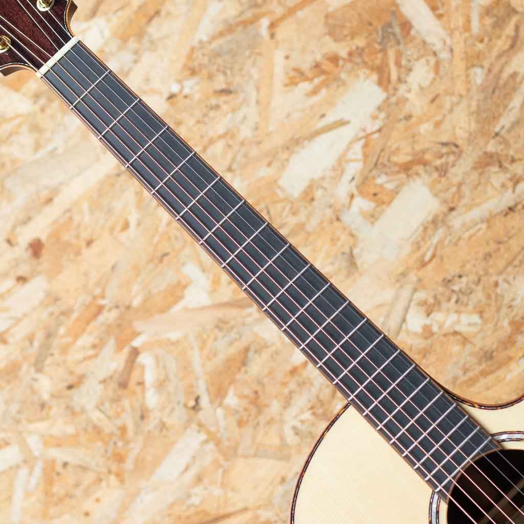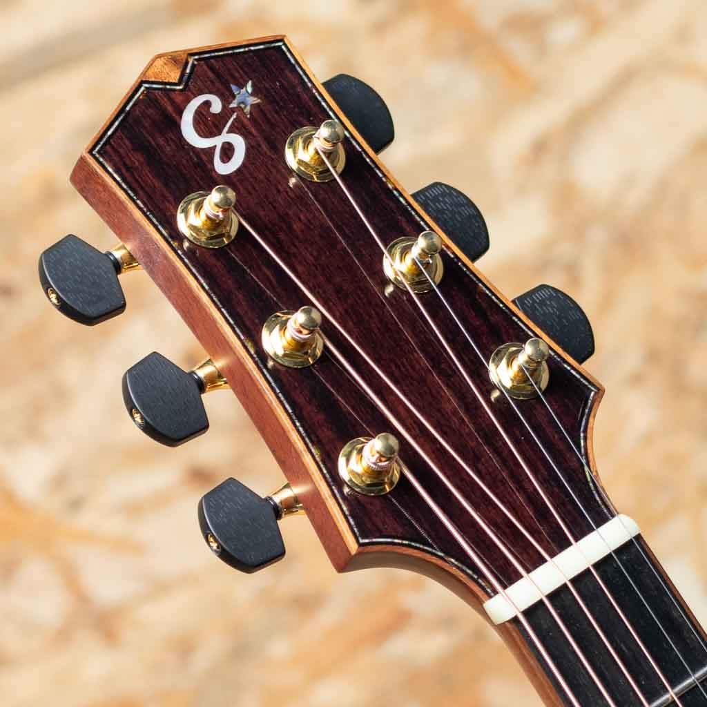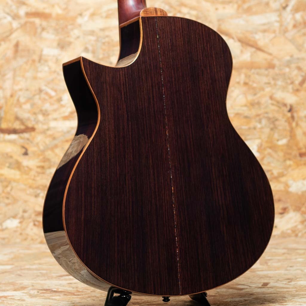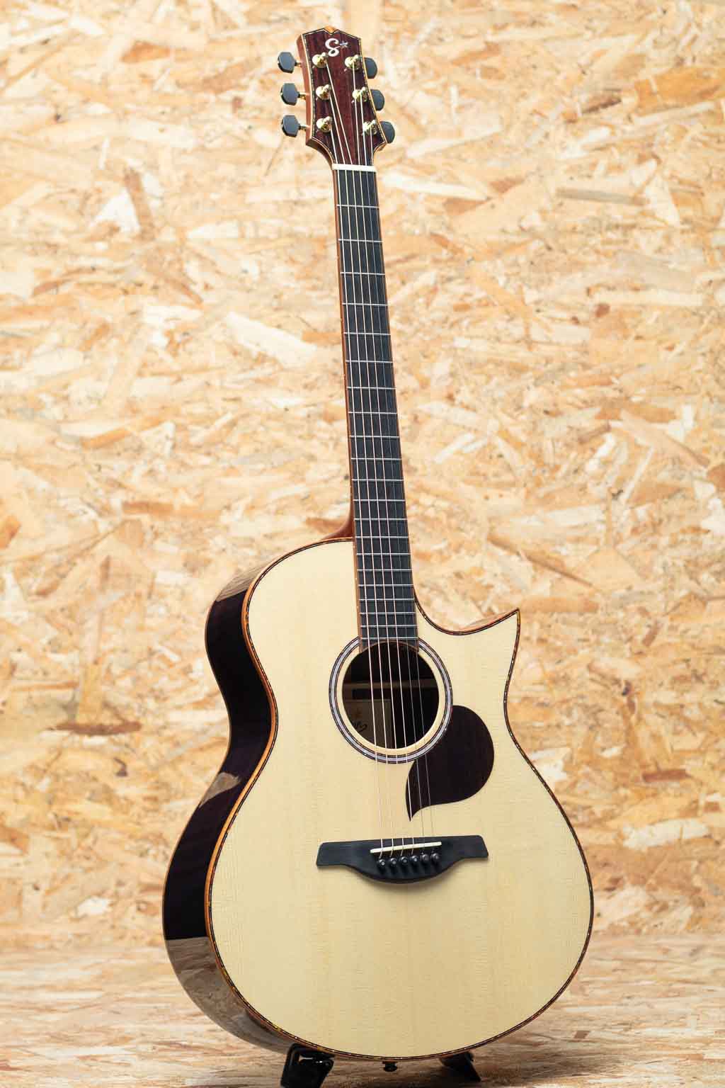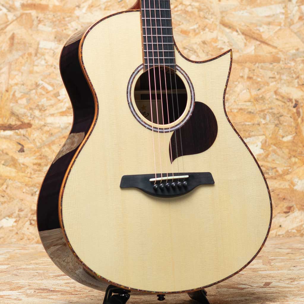 中国屈指の老舗アコースティックギター工場が展開するオリジナルブランド”Starsun Guitars"。同工場は、世界の一流大手ブランドのOEM生産を多数手がけており、規模・技術ともに高いクオリティを備えています。本器はその”Starsun Guitars”のフラッグシップモデル”R60”。高い人気を誇る"Ogino Guitars"荻野裕嗣氏が技術向上のため指導に赴き、また本モデルの監修・プロダクトデザインを担っています。デザインは、"SUGITA KENJI"の代表機種"Carrera"のデザインでも知られる"グラフィックデザイナー"藤尾しんじ氏が担当。幾度となく工場側とすり合わせし、製品化が実現されました。”R60”は、Ogino GuitarsのOMCモデルをサイズトレースしており、同様のボディシェイプと胴厚を採用。マテリアルの選定、材の厚み、ブレイシングなど、細部にわたって荻野氏によって設計されています。スイスムーンスプルーストップ、インディアンローズウッドサイド&バック、マホガニー&ローズウッドの5ピースネック、エボニー指板&ブリッジ、オリジナルXブレーシング。アバロン、M.O.P.、べっ甲セル、コア材を繊細に組み合わせた装飾も巧みです。国内入荷分は、荻野氏自らの手によってナット、サドル、ネックの具合など、プレイアビリティにかかわる部分の最終セットアップが施されております。しっかりとボトムエンドまで響くサウンド。タッチレスポンスもしっかりと反応してくれ、フィンガータッチでもしっかりと響いてくれます。ソロスタイルへのチャレンジモデルにも最適な本器”R60”。エンドピン部は12mm加工にエンドピンガ装着されており、PUインストールもしやすく設計されています。荻野氏のこだわりが随所に光るコストパフォーマンスの高いハイクオリティギターです。是非お手元でご体感ください。