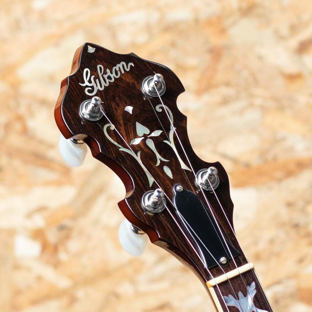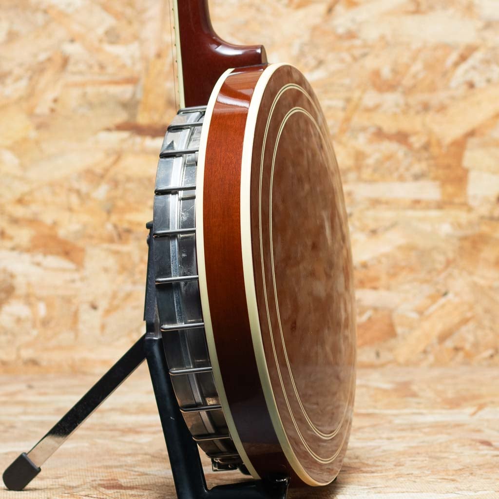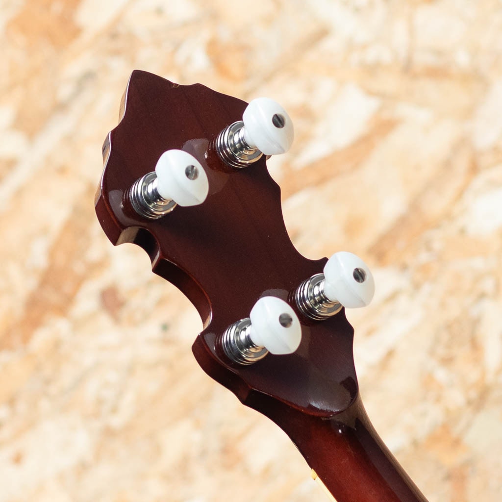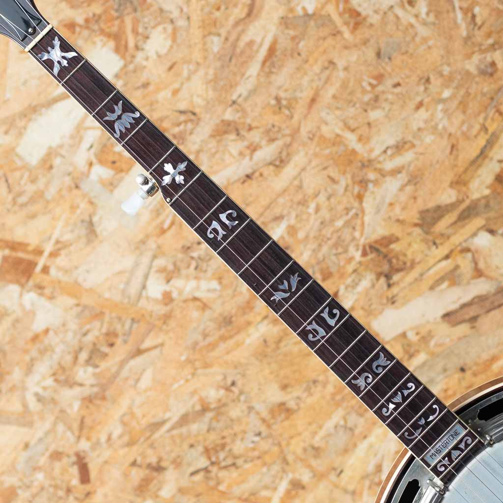 Don RenoはRed Smileyとの共演、バンジョーではシングル・ストリング奏法やジャズの影響を受けた独自の演奏スタイルを確立。フラットピッキングギターでは、ドック・ワトソン、クラレンス・ホワイトにも大きな影響を与えたと言われています。当器は”RB-3 Reno Style Inlay”Custom品 1990年製USED品。バンジョー弾きに知られる 'Greg Rich Era' と呼ばれるGreg Richが在籍していた1988-1993年にあたる人気の年代になります。マホガニーネック&リゾネーター、3ply メイプルリム、Gibson刻印入り20ホールオリジナルフラットヘッドトーンリング、ローズウッド指板にReno Style Flying Eagleインレイ、1ピースフランジ、ニッケルハードウェアー、7.9.10Fにスパイク。テールピースは近年のPrestへ交換済。ニッケルパーツ特有のくすやリゾネーター部の細かなキズなど見られます。軽やかなレスポンス感と柔らかなトーンで転がるような軽快さを楽しめます。現在ではGibson Banjoの生産もなくUSED品もなかなか出ません。定番のStyle-3、カスタムのフライングイーグルインレイがスタイリッシュです。しかもGreg Rich Era期の人気の年代です。お探しの方は是非お早めにご検討下さい。オリジナルハードケース付属