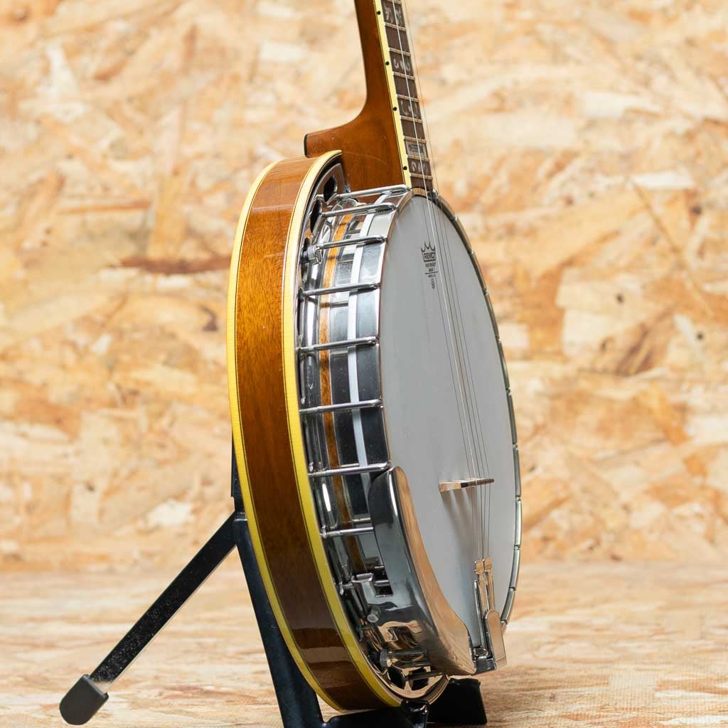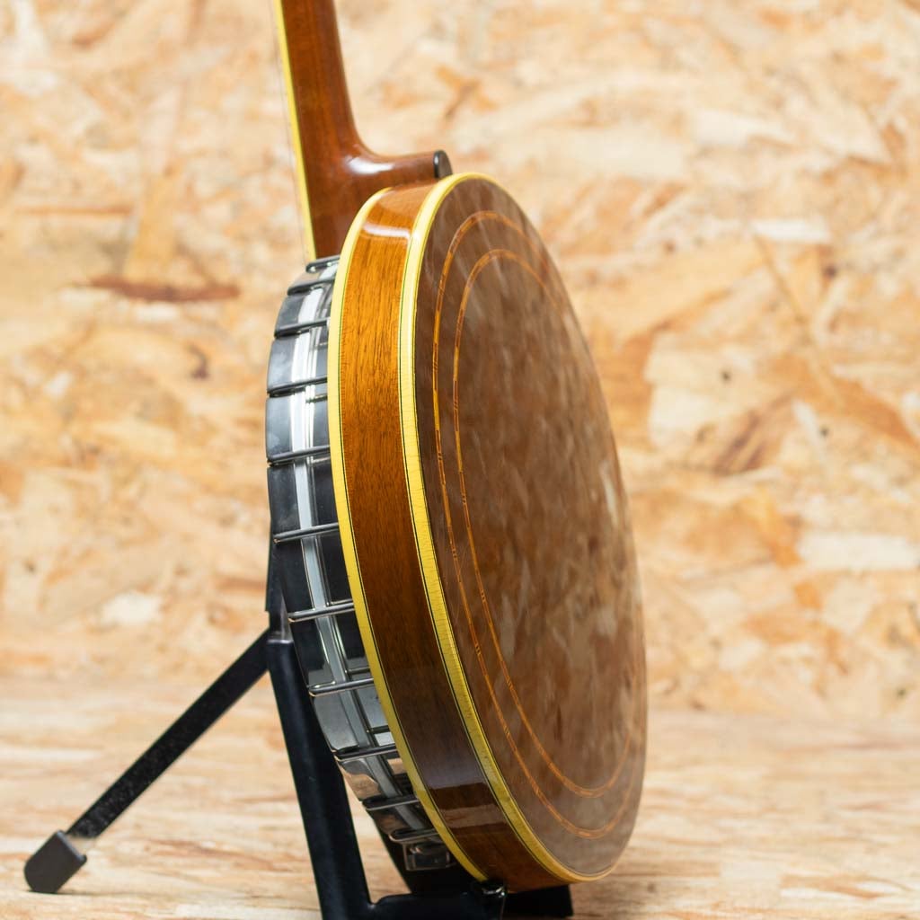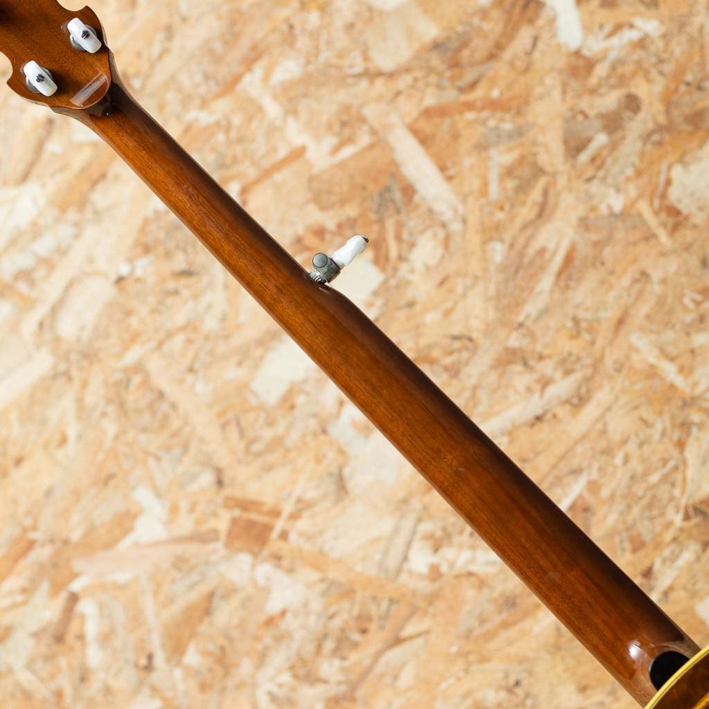 1991年、Gibsonは往年の名機”RB-4”を復刻しました。当器は”RB-4 Flying Eagle" 1997年製USED品。ウオルナットネック、ウオルナットリゾネーター、3plyメイプルリム、Gibson刻印入り20ホールオリジナルフラットヘッドトーンリング、ローズウッド指板にフライングイーグルインレイ、1ピースフランジ、オリジナルプレストテールピース、ニッケルハードウェアー、7.9.10Fにスパイク。2.3弦ペグにはキースチューナーを装着したフルコンプリート仕様。リゾネーターには2本のリングを木象嵌で装飾しているのも渋い一本です。ネックコンディション良好で演奏性も抜群です。ニッケルパーツ特有のくすみやリゾネーターの細かなキズ、リゾネーターバインディングにウェザーチェックなどの使用感も見られ、程よく経年感が見られますが30年近く経過してる事を考えるときれいな保管状態です。ウオルナットリゾネーターらしくブライトでキレよくレスポンシブに反応し、粒立ちのよい抜群のドライブ感を体感できるモデルです。2.3弦のオリジナルペグを保管しているのも嬉しいところです。お探しの方は是非お早めにご検討下さい。オリジナルハードケース付属