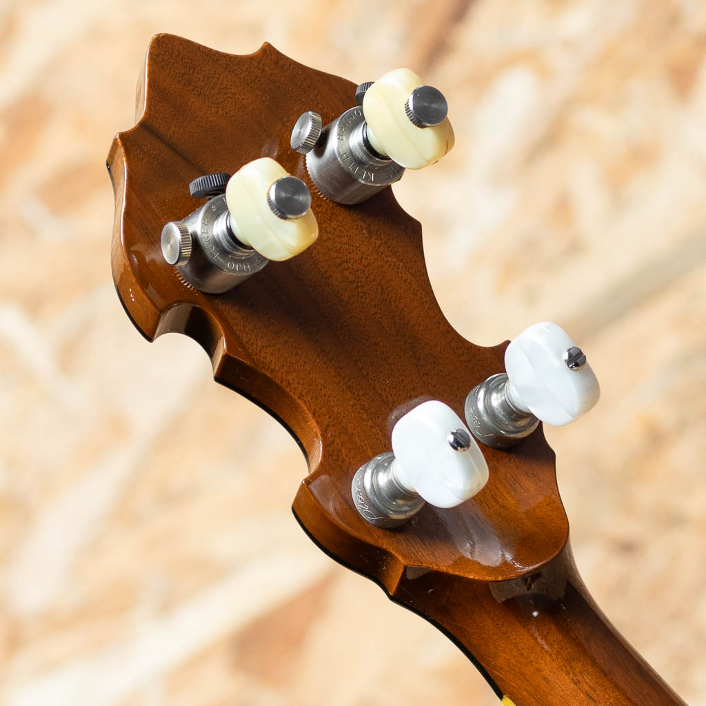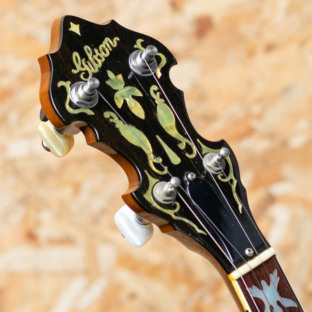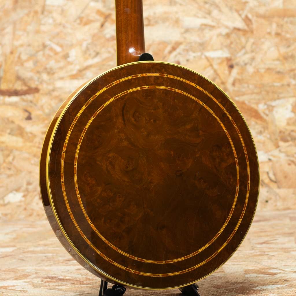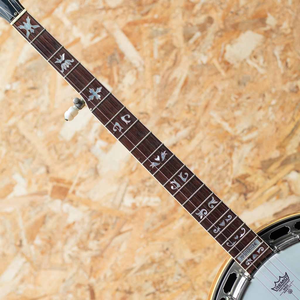 1991年、Gibsonは往年の名機”RB-4”を復刻しました。当器は”RB-4 Flying Eagle" 1997年製USED品。ウオルナットネック、ウオルナットリゾネーター、3plyメイプルリム、Gibson刻印入り20ホールオリジナルフラットヘッドトーンリング、ローズウッド指板にフライングイーグルインレイ、1ピースフランジ、オリジナルプレストテールピース、ニッケルハードウェアー、7.9.10Fにスパイク。2.3弦ペグにはキースチューナーを装着したフルコンプリート仕様。リゾネーターには2本のリングを木象嵌で装飾しているのも渋い一本です。ネックコンディション良好で演奏性も抜群です。ニッケルパーツ特有のくすみやリゾネーターの細かなキズ、リゾネーターバインディングにウェザーチェックなどの使用感も見られ、程よく経年感が見られますが30年近く経過してる事を考えるときれいな保管状態です。ウオルナットリゾネーターらしくブライトでキレよくレスポンシブに反応し、粒立ちのよい抜群のドライブ感を体感できるモデルです。2.3弦のオリジナルペグを保管しているのも嬉しいところです。お探しの方は是非お早めにご検討下さい。オリジナルハードケース付属