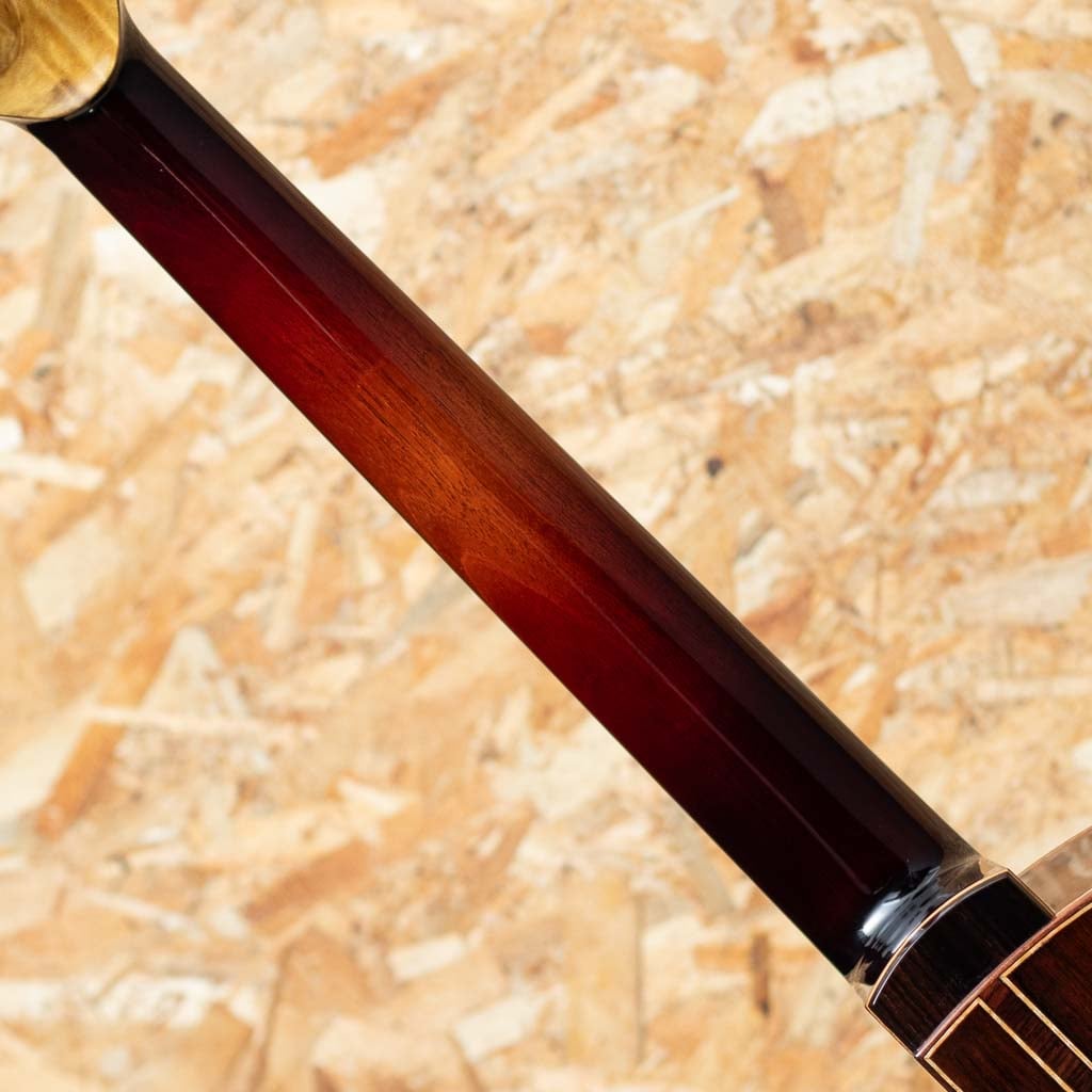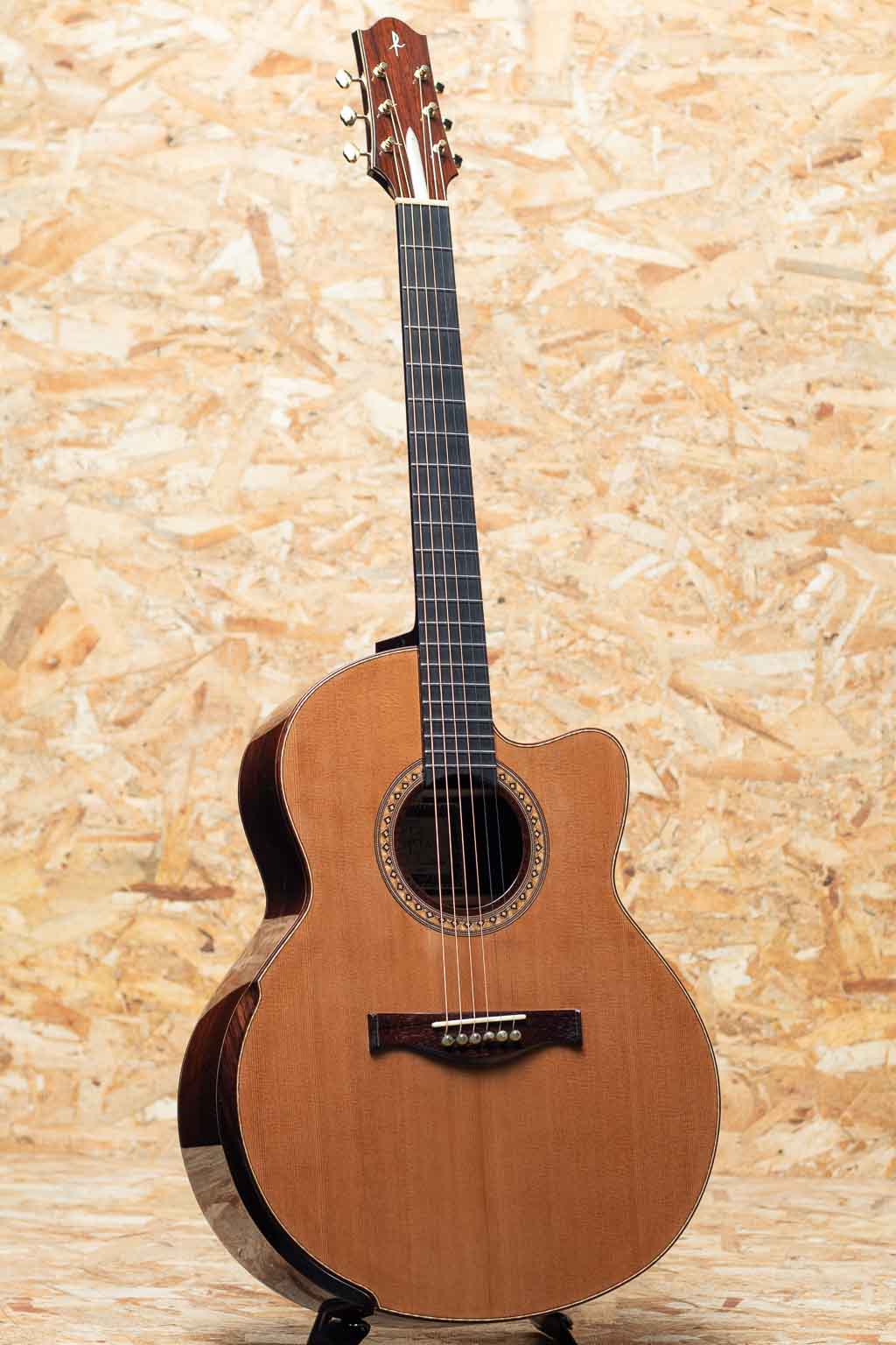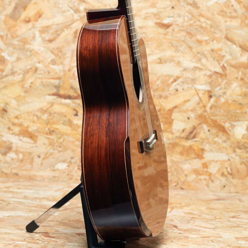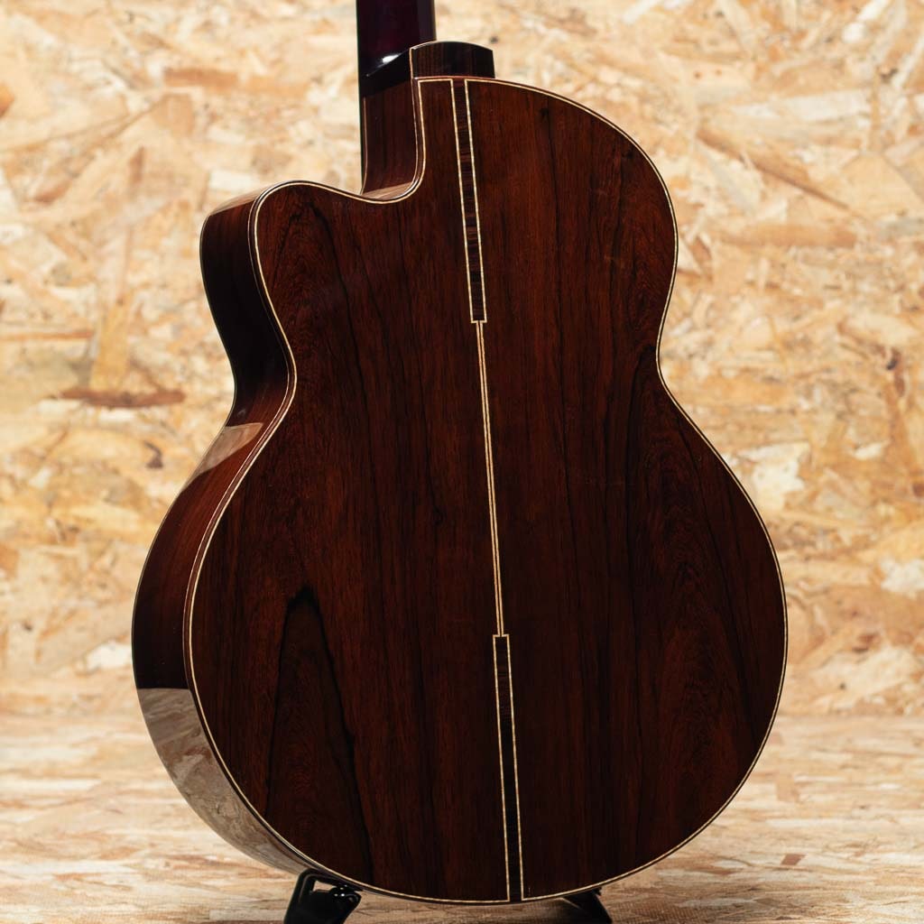 本器はシダートップ、マダガスカルローズウッド・サイド&バックを採用した16インチのオリジナル・スモールジャンボモデル。ホンジュラスマホガニーネック、エボニー指板、マダガスカルローズウッドブリッジ、ローズウッドバインディング、オリジナルモザイクロゼッタ、マダガスカルローズウッドヘッドプレート、Gotoh SX510ペグを装備し、ベネチアンカッタウェイとアームレスト(コンター)加工も備えた実用性の高い仕様です。ヘッド裏の突板にはローレルバールウッド、ブリッジピンには水牛角、ロッドカバーには牛骨を用いるなど、随所に素材へのこだわりと個性が感じられます。