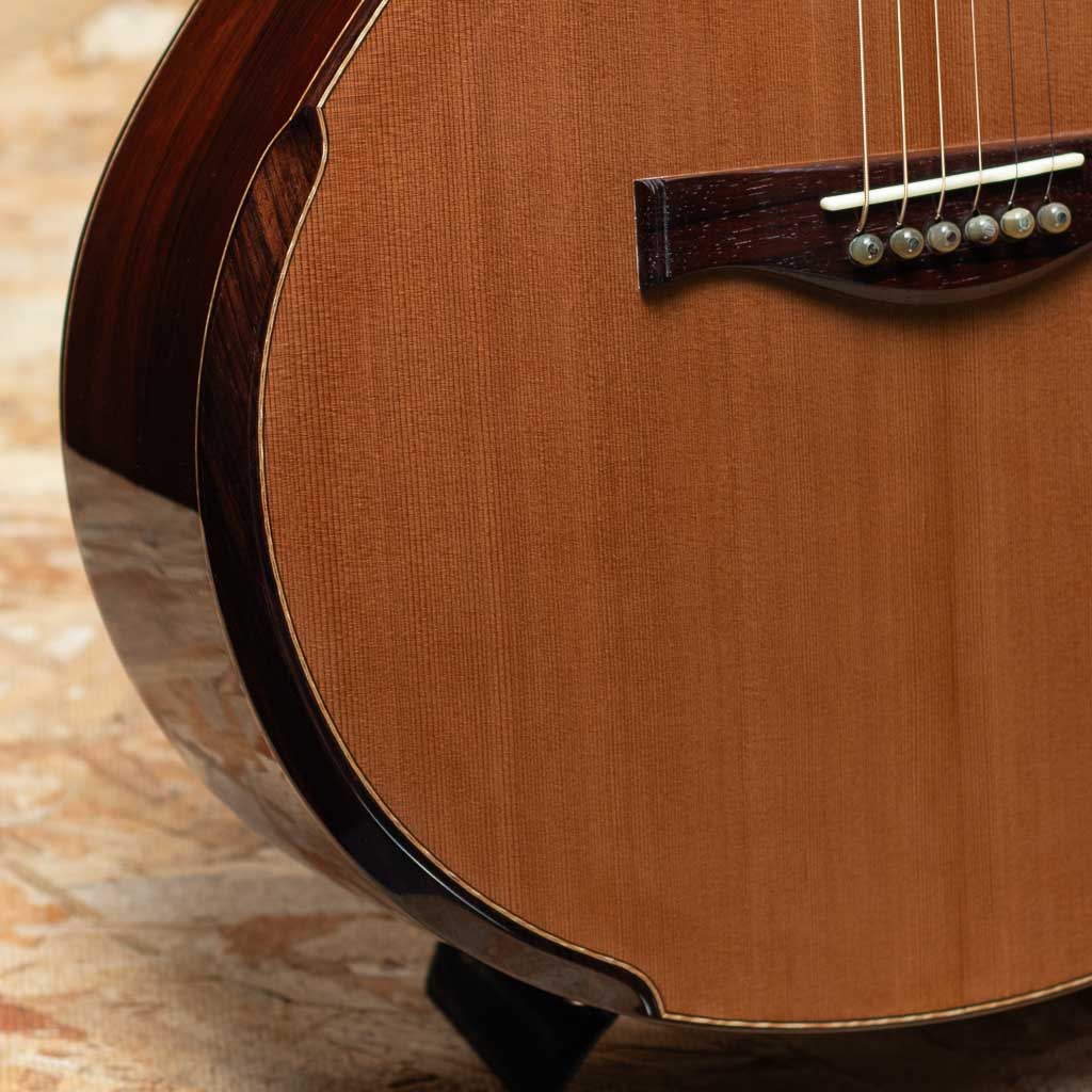 トップには独自設計のダブルXブレーシングを採用。全帯域が調和し、シダーらしい柔らかく包み込むような響きと奥行きある余韻を心地よく響かせます。身体に伝わる振動量も大きく、ひとたび爪弾けば“良いギター”であることを自然に実感させてくれる響き。装飾はあくまでシンプルながら、随所に遊び心と造形的センスを感じさせる、製作家の美意識が宿った一本です。