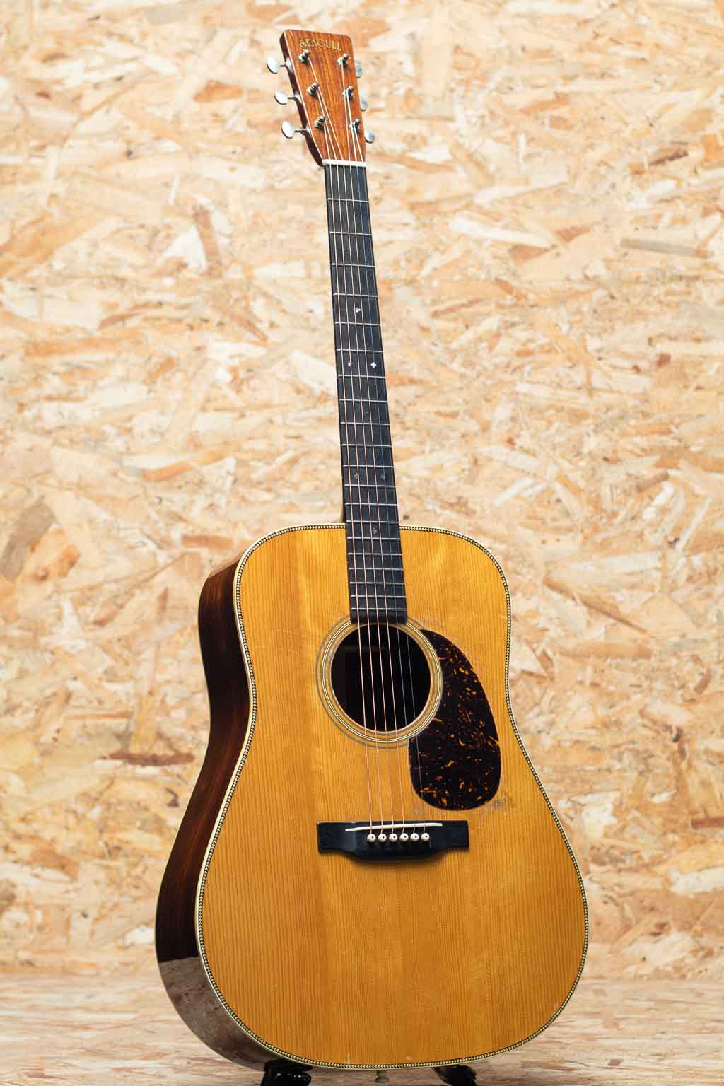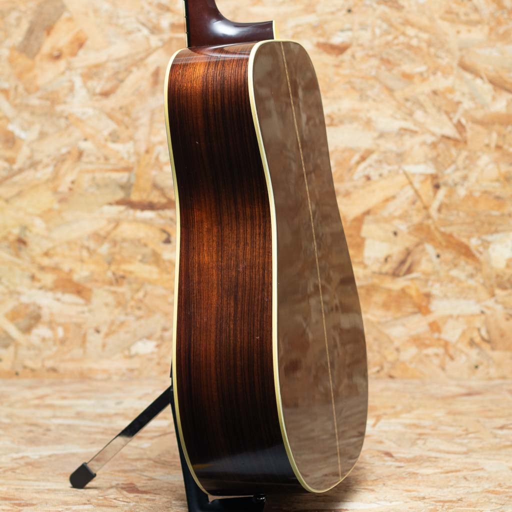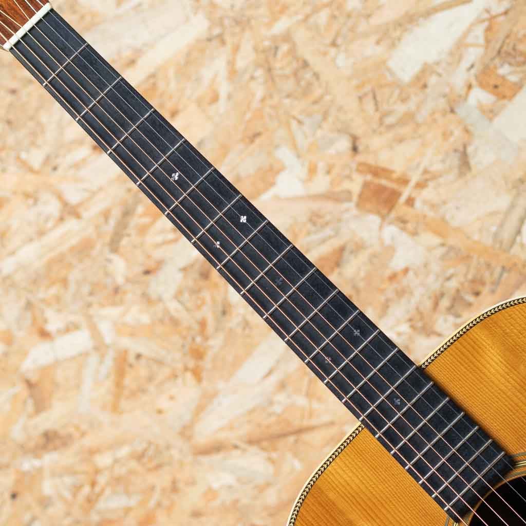 国内有数のベテランルシアー、エム・シオザキ弦楽器工房の塩崎雅亮氏が率いるシーガルギター。氏がもっとも得意とするプリウォーマーチンスタイルを元に製作され、新品のコンディションとプレイアビリティを持ちつつ、ヴィンテージさながらサウンドとルックスを備えた"Aged Series"。本器は"SD-60 1940 Aged TA/IR/A03"USED品。トリファイド加工が施されたアディロンダックスプルースをトップとブレーシングに採用、サイド&バックにはインディアンローズウッドを使用。ワンピースマホガニーネック、エボニー指板&ブリッジ、ロングサドル、 Waverly#4076レリックオープンバックペグ、ダイアモンドスクエア指板インレイ、セルロイド流し込みべっ甲柄ピックガード、ヘリンボーントリム、アイボロイドバインディング、ジグザグバックストリップ、トップ構造は軽快でありながらディープ&シリアスな音色をもたらすリアシフトスキャロップブレイシングとなっており、他に類を見ないクオリティで1940年仕様を再現。ヴィンテージのサウンドを再現する為、サウンドのコアとなるトップ材とブレイシング材にトリファイド加工が施され、また実際のヴィンテージ材に極めて近い材質感のものが使用されています。設計・ボイシングももちろんヴィンテージ同様の構造を採用。サウンドの要であるトップとバック、ブレイシングの加工作業は塩崎氏自らが手がけております。エイジド加工のレベルは最大の03。長年弾き込まれたかの様な弾き傷や磨耗傷、塗装の剥がれも見られ、使用感と塗装チェッキング・艶加減がリアルな仕上がりです。また、指板エッジやブリッジエッジも弾き込まれて磨耗したかの様な質感に仕上げられています。サウンド、ルックスともに異次元のクオリティ。USED品ですが使用によるキズは特に見られず、ネックの状態含めプレイコンディションも良好です。オールドマーチンをお好きな方にももちろん、全ての方にお勧めしたい1本。オリジナルハードケース付属です。