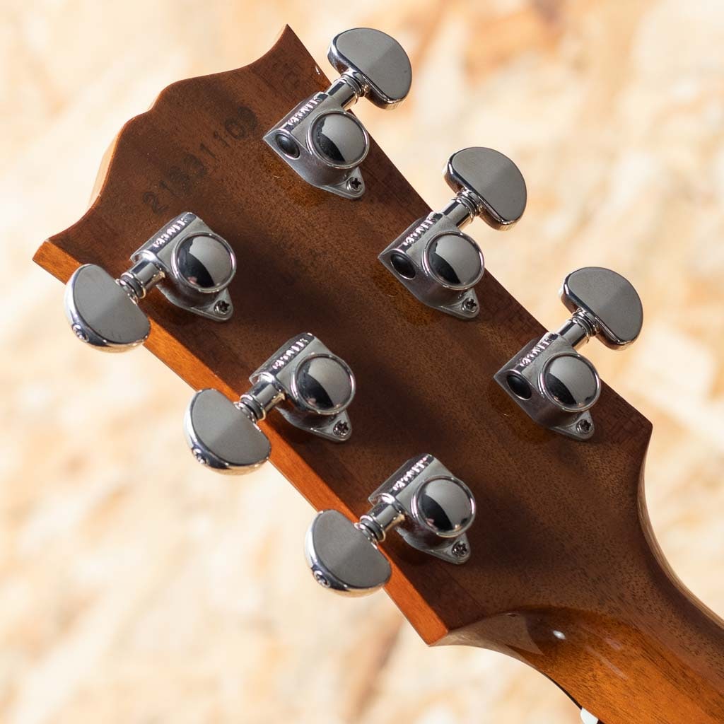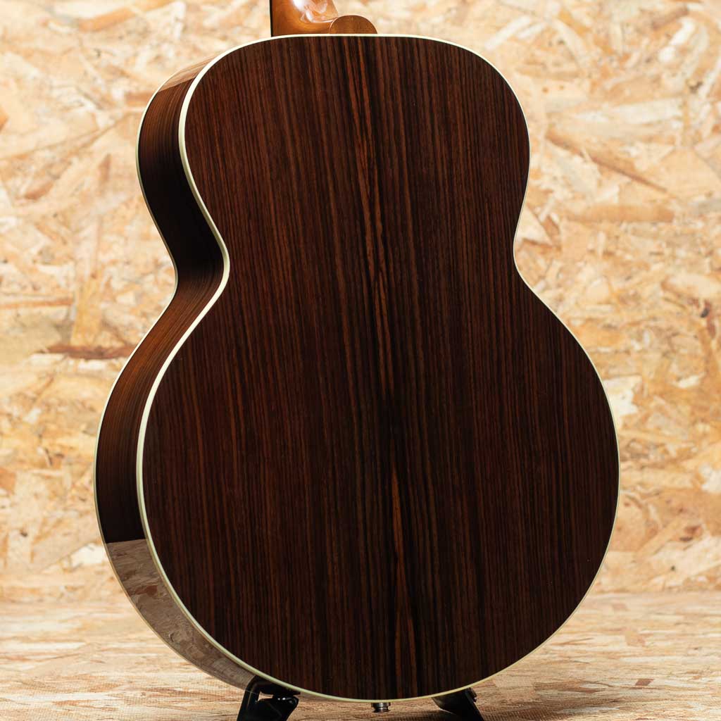キング・オブ・フラット・トップ・ギターと称されるJ-200。ボブディランをはじめカントリーブルーグラスのミュージシャンから愛され続けている名器のひとつです。本器はJ200を基に装飾をシンプルに、使用木材を変更し手に入れやすい価格を実現したシリーズの"スタジオ"モデル。スプルーストップ、ローズウッドサイドバック、マホガニーネック、ウォルナットフィンガーボード&ムスタッシュブリッジ、グローバーペグ、アンティークナチュラルフィニッシュ。J-200に比べ見た目の派手さを抑えながらもMOPクラウンフィンガーボードインレイ、クラウンヘッドインレイなど要所要所でトレードマークも残しJ-200の風格を残しています。落ち着いた雰囲気と上品さを兼ね備えた印象です。ボディサイズはやや薄型のスーパージャンボボディの為ボリュームは申し分なく、ローズウッド材による倍音豊かなサウンドながら抱え込みやすい実用的なモデルです。カルロスPUが取り付けされており、アンダーサドル+コンデンサーマイクの組み合わせにより生音をマイク録りしたようなナチュラルなサウンドをアウトプット出来ます。トップにピックによる薄い演奏傷やヘッド先端の打痕、ネックヒールに鋭利で小さなスクラッチ傷、エンドジャック周辺にストラップによる塗装の荒れがあるものの、全体的にはまだまだ綺麗な状態といえるでしょう。ネックコンディションも良好です。実戦仕様なギブソンジャンボをお探しの方には打ってつけの一本です。オリジナルハードケースが付属いたします。