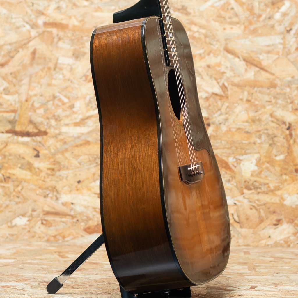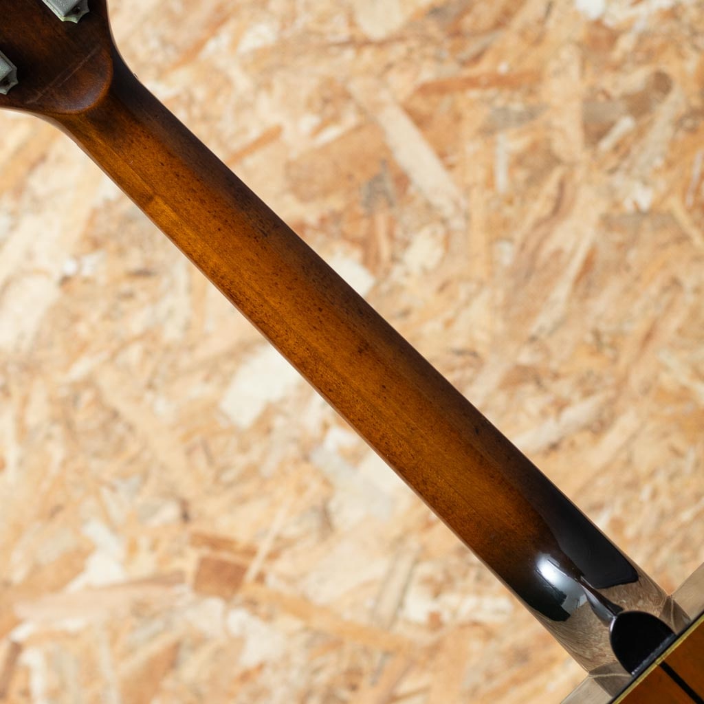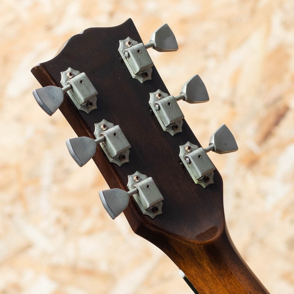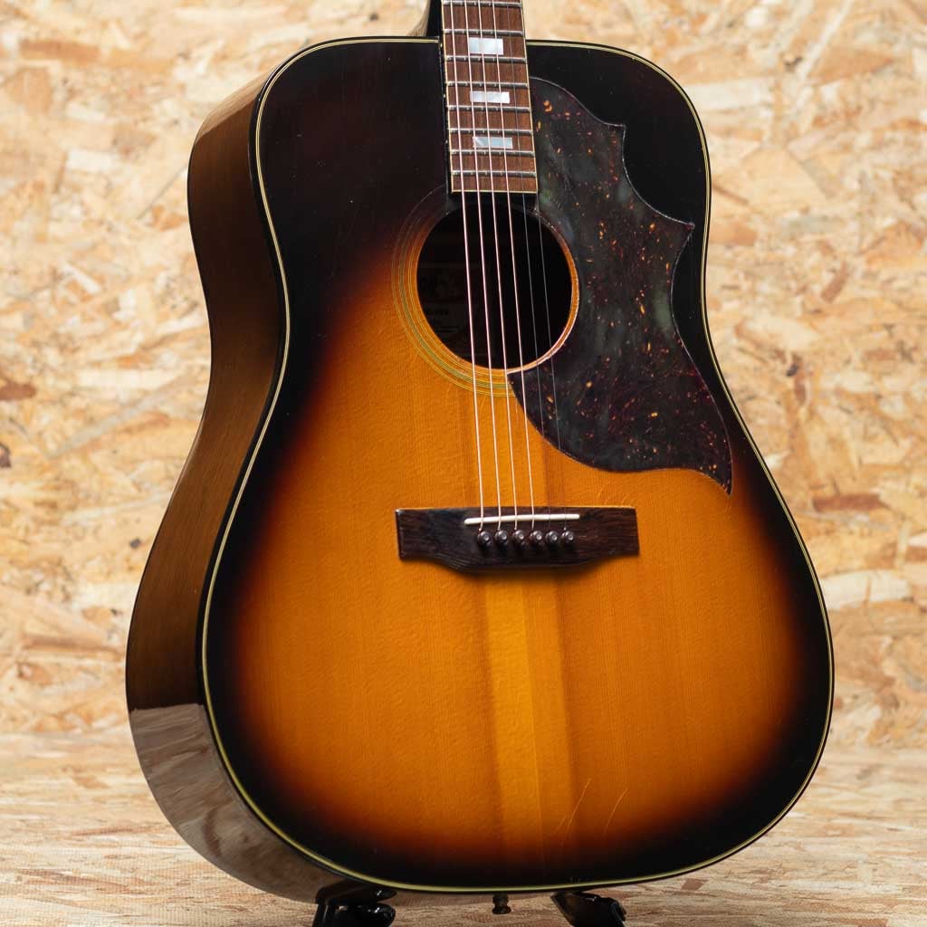 スクエアショルダー、ラージヘッドが特徴的な70年代ギブソン。こちらは60年代で言うところのカントリー&ウェスタンの後継とも言える”SJ DELUXE”1974-75年製。スプルーストップ、マホガニーサイド&バック、ボリュートつきマホガニー3ピースネック、ローズウッド指板&ブリッジ、指板にはブロックインレイ、内部はこの時期に見られるダブルXブレーシング。ラウンドショルダー期と異なりタイトで歯切れのよいサウンド。ルックス同様の無骨で力強い鳴りが特徴です。指板サイド1弦側からサウンドホール下にかけてクラック補修痕がございますが、裏から補強が当てられております。ネックグリップ6弦側に小さな打痕がある他、所々当て傷や擦り傷はございますが約50年の経過を考えるとキズや打痕の類は比較的少なめと言えるでしょう。経年感のあるドライな音質が楽しめる一本です。オリジナルハードケース付属
