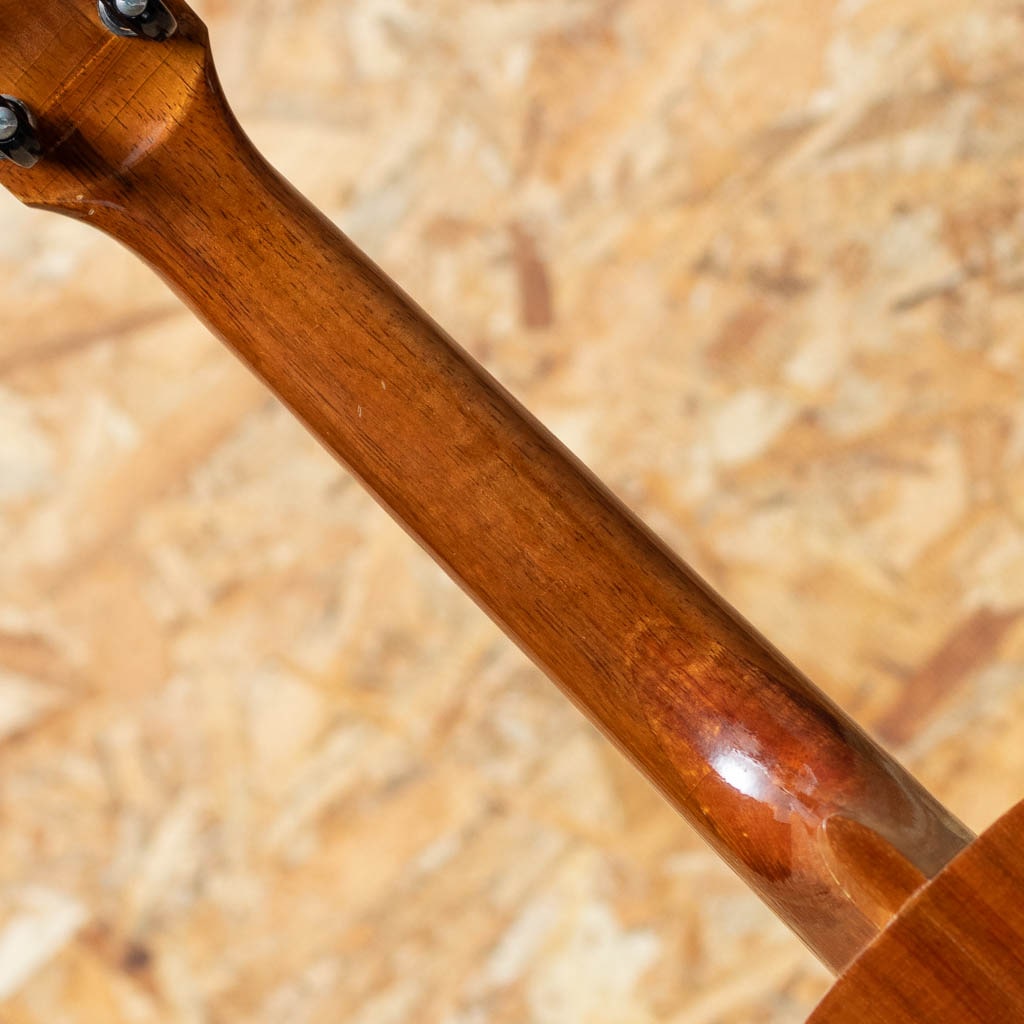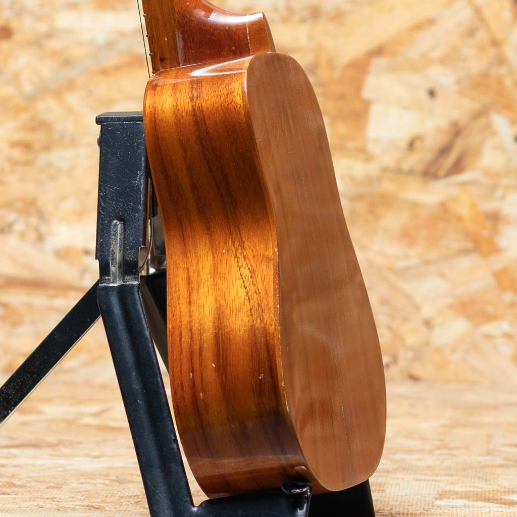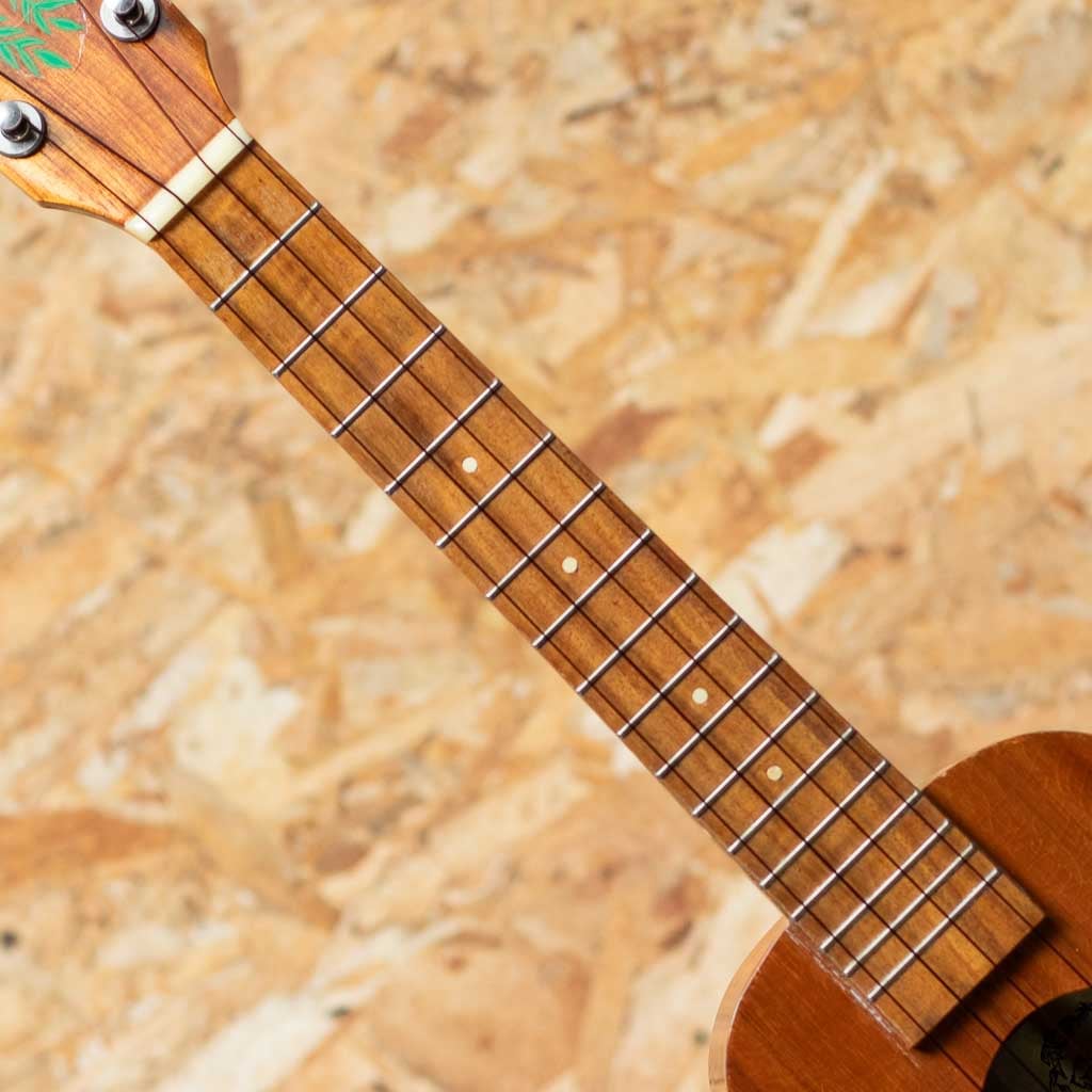 1986年創立のウクレレブランド”セニーザ”。ハワイのオワフ島にて、トーマス&キャサリン夫婦二人で製作されておりましたが、2000年代後半より惜しくも生産を終了してしまいました。現在は中古市場でも希少となっております。夫のトーマス・セニーザは“Valley Made Ukuleles”(ヴァリー・メイド・ウクレレ)の製作者ジェロマ氏の叔父に当たる存在で、代々ウクレレ作りの伝統を受け継いでいる血筋を持っており、製作されるウクレレも味わいのある伝統のハワイアンウクレレそのもの。本器はハワイアンコアボディのソプラノシェイプをベーシックに少し長めの380mmスケールで製作されたロングネック仕様のUSED品です。しっかりとしたボリュームに甘く温かみのある音色。ハワイアンミュージックがよく似合う1本です。部分的にウェザーチェックや僅かに塗装の剥離、トップセンターシーム&指板横にクラック補修があるほか、小キズなどの使用感がございますが、ヘッド突板にはデカールロゴが珍しく綺麗な状態で残っております。ハワイ製の通なウクレレ”セニーザ”。流通も少なく貴重な1本です。チップボードケース付属。
