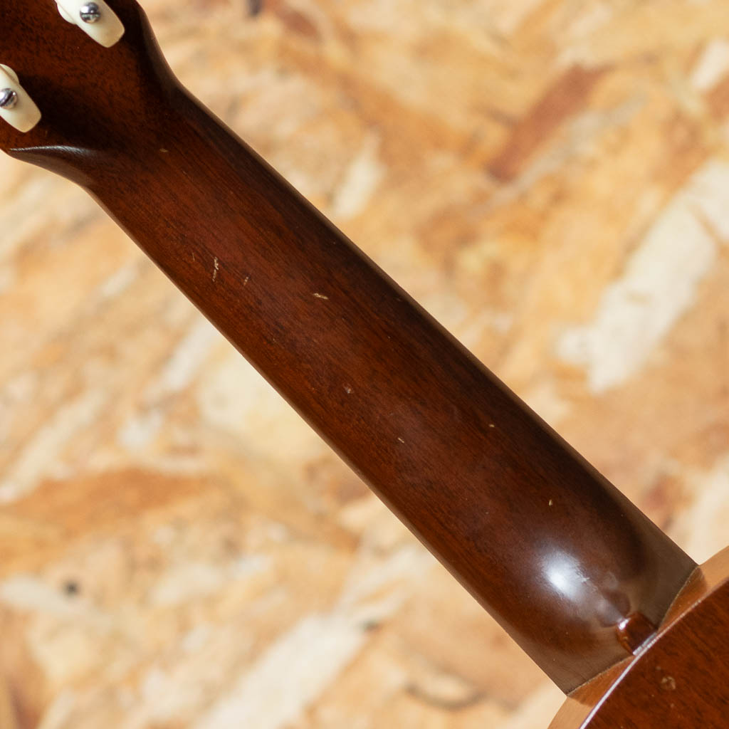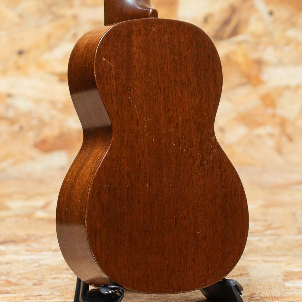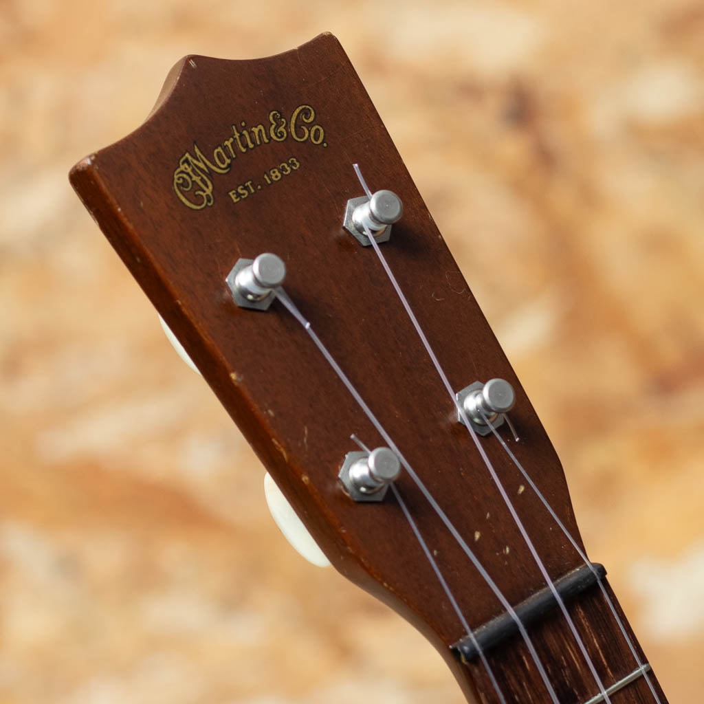 ギターブランドとしてはもちろん有名ですが、100年を超えるウクレレ生産の歴史も持っており、現代までも続く老舗ブランド”MARTIN”。本器はStyle-0のヴィンテージ品。1921年の発売から1994年の廃盤まで(1977以降は特注生産のみ)、スタンダードモデルとして長期に渡り愛されていたモデルです。ワンピースマホガニー材ボディ、ワンピースマホガニーネック、ハカランダ指板、マホガニーブリッジ、エボニーナット&サドル、フリクションペグ、アイボロイド指板ドット、Tフレット、ヘッドのロゴデカール。各部の仕様から本器は50年代のものと思われます。サウンドホール周辺に演奏に伴う弾き傷がある他、全体的に打痕や細かな傷が散見されますが木部の割れなどは無く、ネックコンディションは良好。マーチンのソプラノらしく味わいがあり、軽快で大音量。ヴィンテージのウクレレに興味のある方へ最初の1本としておすすめです。ケースの付属はございません。