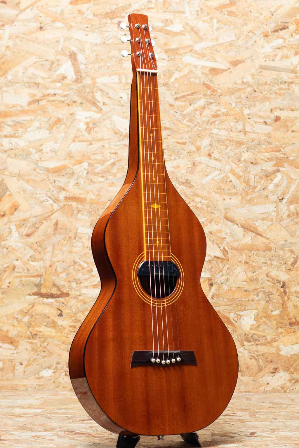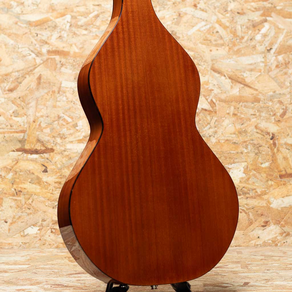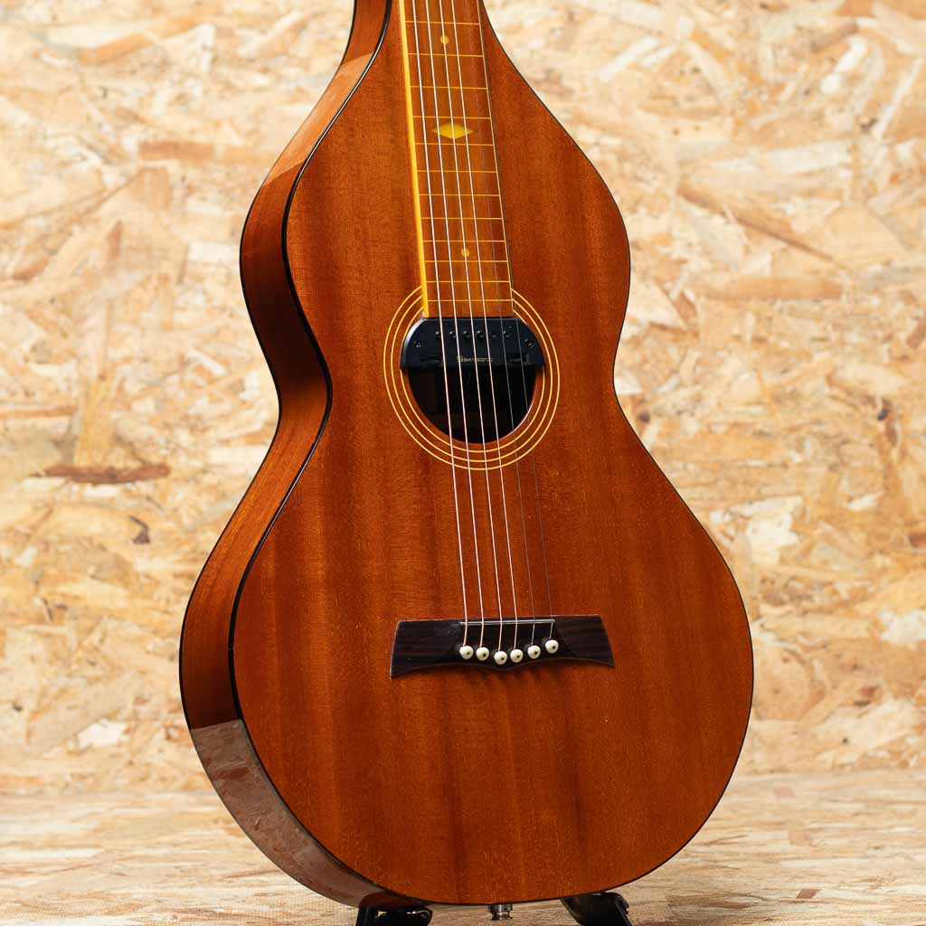 2000年代製 R&Bell Style-2 Acoustic Lap Steel Guitar USED品。純国産のワイゼンボーンモデルです。膝上に置いてのスライドギターでハワイアンやブルース、カントリーなどで見る事の多いギターです。オールマホガニーでネックはオリジナルワイゼンボーン同様のホロウネック仕様。小さなキズなどはございますがまずまずきれいな外観を保ったコンディション良好な状態と言えるでしょう。Skysonicのマグネット+コンデンサーのP.Uを搭載した即戦力な状態です。近年のルーツミュージック回帰でにわかに注目されるアコースティックラップスチールギター。独特の浮遊感とゆるい空気感を表現します。ガンガン弾くも良し、要所でアクセントに導入も良しの使えるギターです。オリジナルハードケース付属