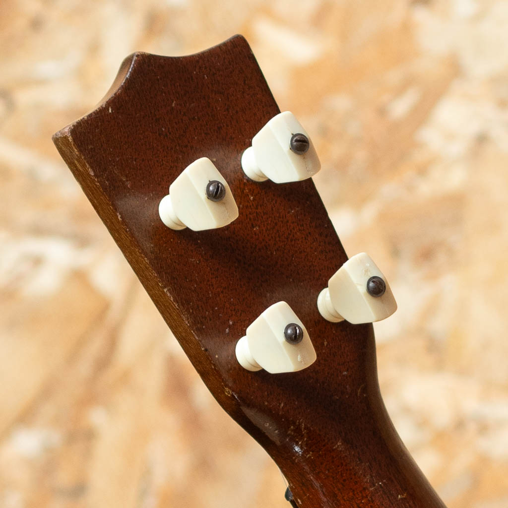 1916年から1966年まで生産されたとされる”Style-2”。ボディトップとバックにバインディングの施された、ワンランク上の装飾を持つソプラノモデル。オールマホガニーボディ、マホガニーネック、ローズウッド指板、マホガニーブリッジ、エボニーナット&サドル、アイボロイド指板ドットインレイ、キーストーンフリクションペグ、ヘッド表のロゴデカール。各仕様から1940年代後半から1950年代前半のものと思われます。全体的にウェザーチェックが見られる他、小傷や打痕はございますが木部の割れなどは無く、年代を考慮すればきれいな状態です。時代を感じるレトロなサウンド。ソプラノサイズとは思えない程の豊かな音量もあり、甘み、深みのバランスも良く、気持ちよく弾ける1本です。ケースの付属はございません。