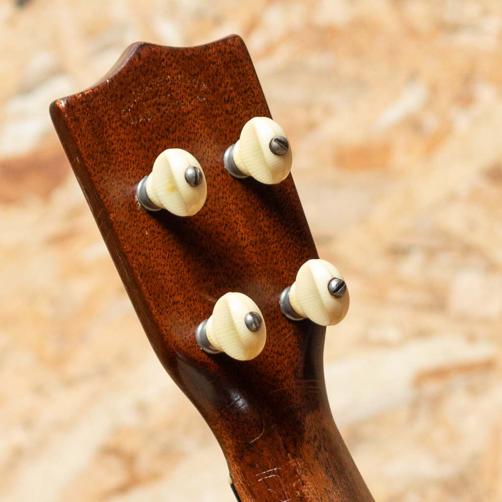 ギターブランドとしてはもちろん有名ですが、100年を超えるウクレレ生産の歴史も持っており、現代までも続く老舗ブランド”MARTIN”。本器はヴィンテージ市場でも人気の高い”Style-3M”。1918年の発売開始から目まぐるしい仕様の変遷を遂げてきた個性的な機種です。ヘッドのバックスタンプロゴ、指板センターライン、ダイヤモンドペアインレイ、ボディボトムオーナメント、オリジナルペグなどの仕様から1927~29年頃のものと思われます。オールマホガニーボディ、マホガニーネック、エボニー指板、マホガニーブリッジ、フリクションペグ。ソプラノボディサイズですがボリュームも大きく、マーチンソプラノならではの艶やかで軽快なトーンにヴィンテージ品ならではの枯れた抜けの良いマホガニーサウンドを堪能頂けます。表板はリフィニッシュが行われており、サイド・バック、ネックにはオーバースプレーが行われております。表面は比較的きれいな外観でサイド・バックは相応の傷や打痕などが見られ、ネックは木部が剥げた上からオーバースプレーが施されています。人気の高い”Style-3”。ハードケースが付属します。修理履歴やその他詳細もお気軽にお問い合わせ下さい。