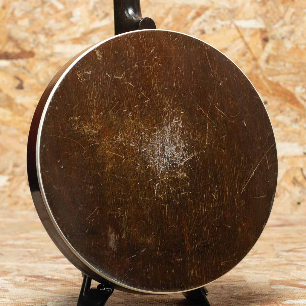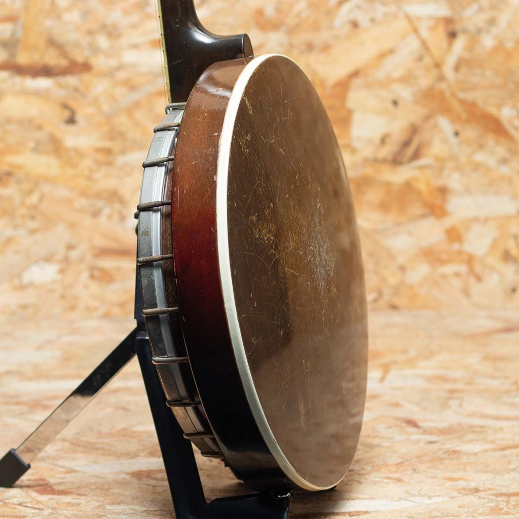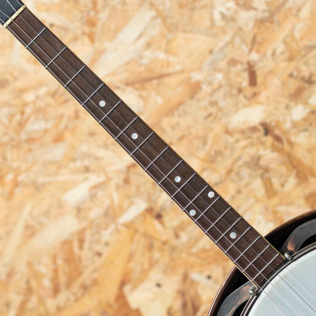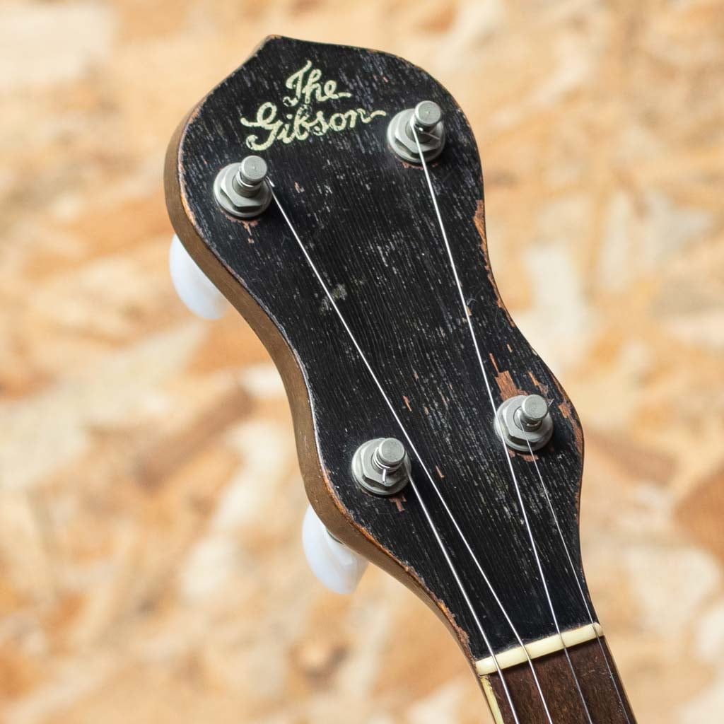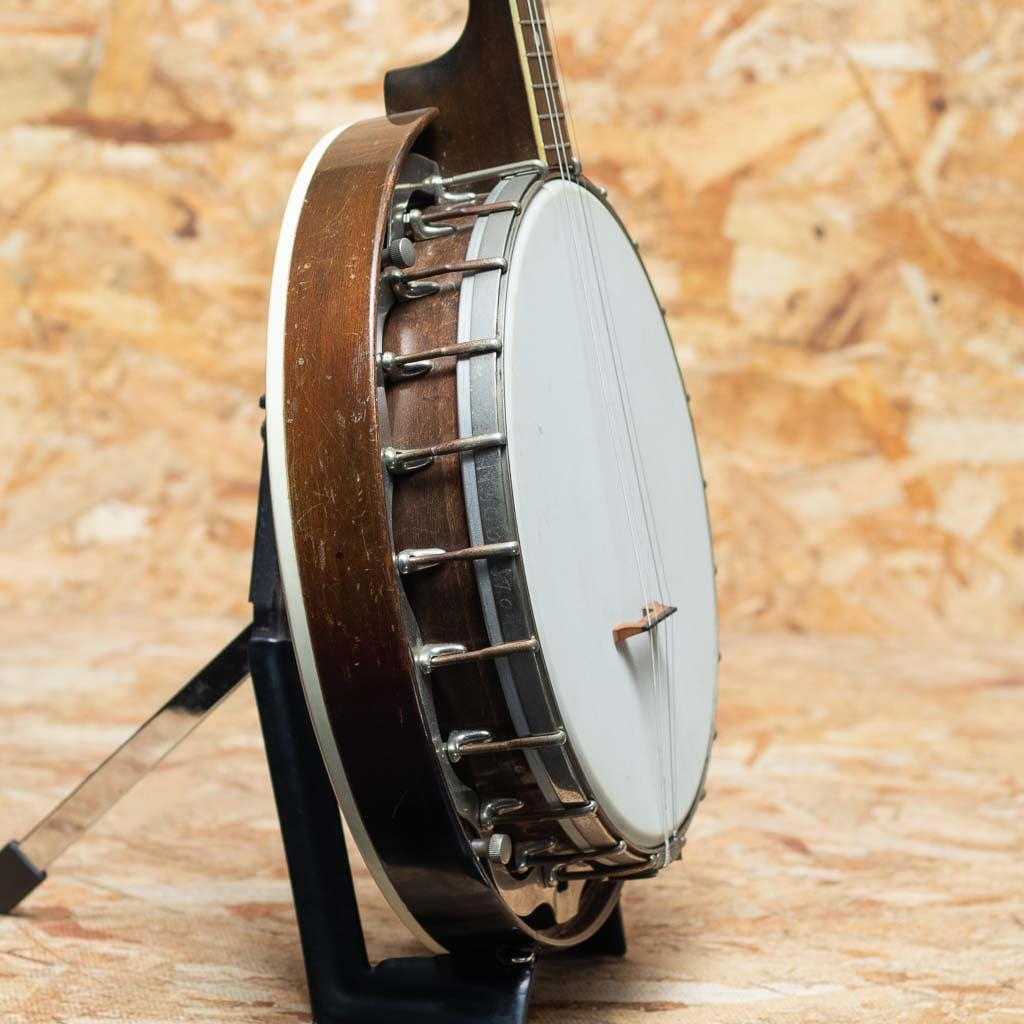 Gibson TB-2 テナーバンジョー 1926年製 ビンテージ品。10.5インチのメイプル製リムにサーペンタインスタイルフランジを搭載したモデル。サーペンタインスタイルフランジは25年と26年のみに見られるレアな仕様です。メイプルネック、チューブラートーンリング、22ブラケット、シングルコーディネーターロッド、ウオルナットリゾネーター。ヘッドには”The Gibson”のスクリプトロゴが入っている同年代あたりのTB-1のネックに交換されています。指板インレイはドットでペグは交換されています。テールピースの爪が一本折れていますが他の爪はしっかり残っており使用に問題はありません。ディキシージャズやジャグバンドなどオールドミュージックにはかかせないテナーバンジョー。パンパンと張りのある大音量で小気味よいリズムを演出するアイテムです。チップボードケース付属