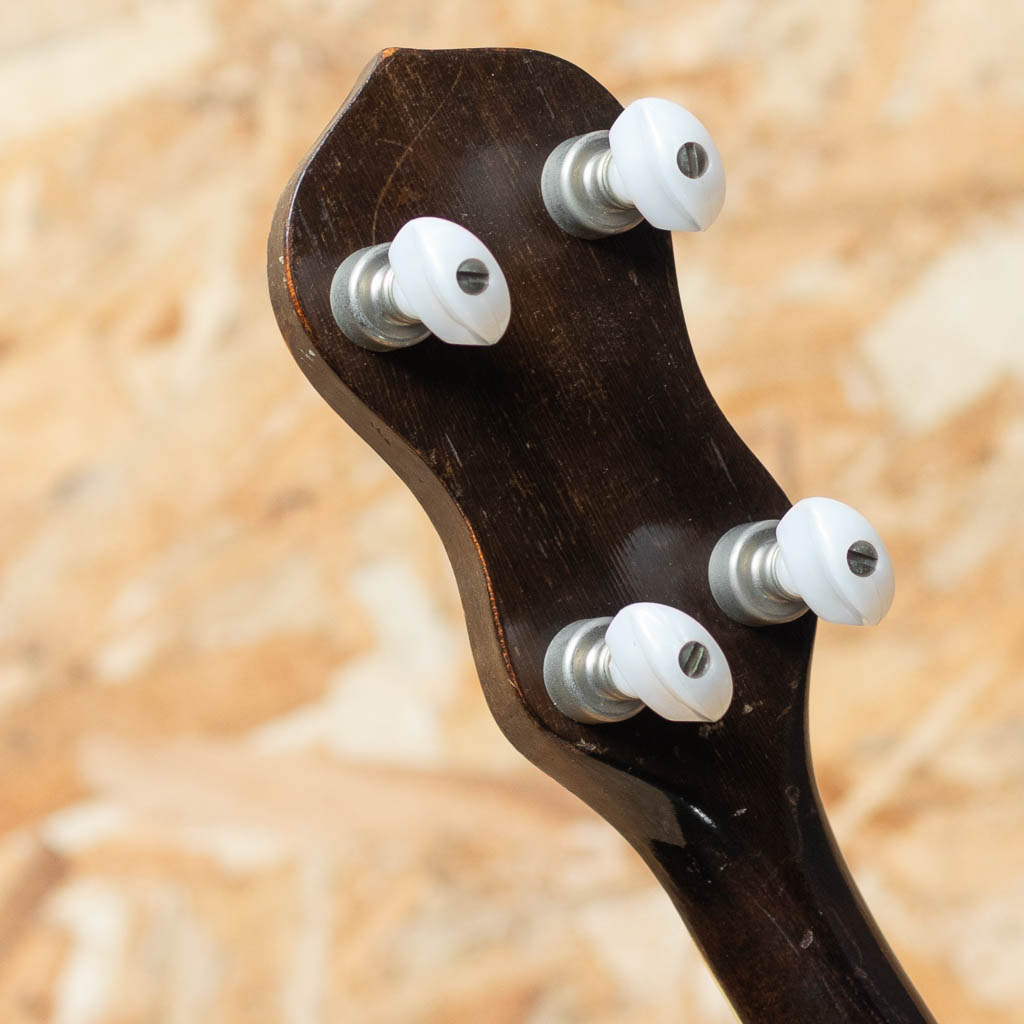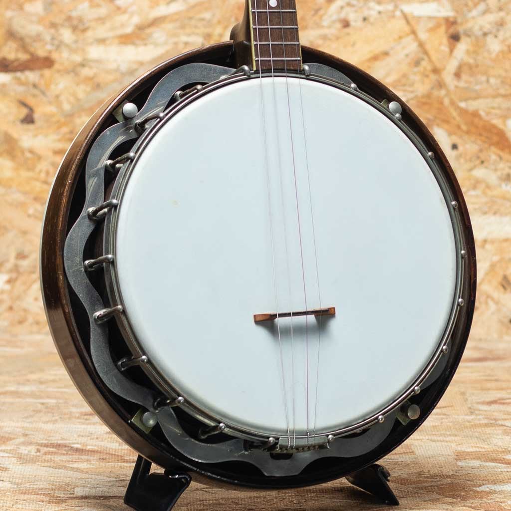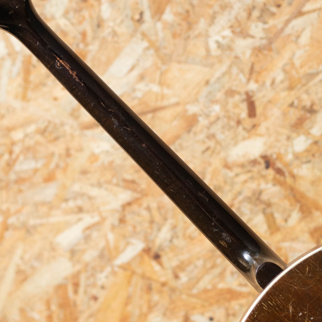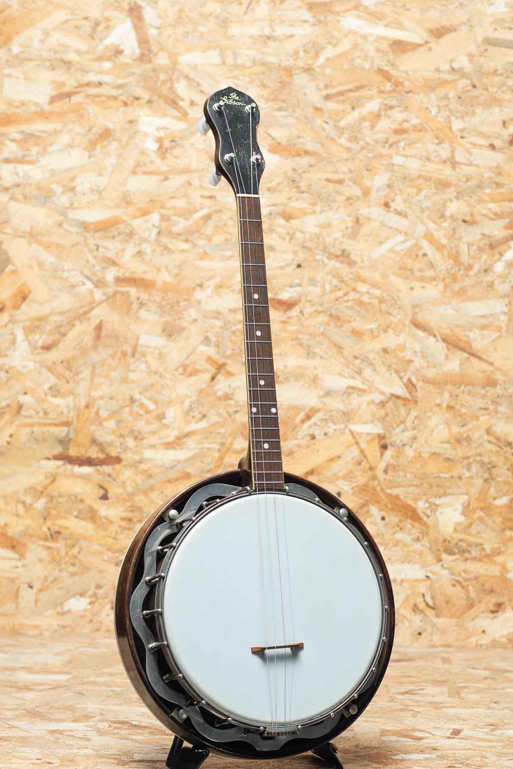 Gibson TB-2 テナーバンジョー 1926年製 ビンテージ品。10.5インチのメイプル製リムにサーペンタインスタイルフランジを搭載したモデル。サーペンタインスタイルフランジは25年と26年のみに見られるレアな仕様です。メイプルネック、チューブラートーンリング、22ブラケット、シングルコーディネーターロッド、ウオルナットリゾネーター。ヘッドには”The Gibson”のスクリプトロゴが入っている同年代あたりのTB-1のネックに交換されています。指板インレイはドットでペグは交換されています。テールピースの爪が一本折れていますが他の爪はしっかり残っており使用に問題はありません。ディキシージャズやジャグバンドなどオールドミュージックにはかかせないテナーバンジョー。パンパンと張りのある大音量で小気味よいリズムを演出するアイテムです。チップボードケース付属