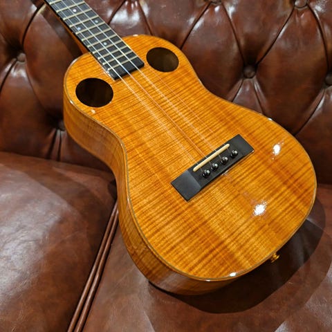 アメリカ・サンタクルーズ在住のベテランルシアーTony Graziano(トニーグラジアーノ)。本器は抜群に美しい杢目を持ったハワイアンコアボディのテナーモデル。マホガニーネック、エボニー指板&ブリッジ、ハワイアンコアバインディング、ブリッジピンタイプの弦止め、グローバーゴールドペグ。非常にきめ細かなトラ杢の出た色味の淡いフィギャードハワイアンコアを贅沢に使用。甘み、深みがありながらも安定が良く、ブライトさとウォーミーさを併せ持ったようなサウンド。トップ両サイド上部のダブルホールが搭載され、奥行きと広がりを兼ね備えた響きをお楽しみいただけます。ネックヒールにはゴールドのストラップピンが取り付けされている他、パッシブのコンタクトマイクが搭載されていますので、ライブや収録でも即戦力。弾き易いセットアップでソロウクレレなどに最適なウクレレです。使用に伴うスクラッチ傷などの軽微な使用感はあるものの、目立つような打痕や大きなダメージなどは見受けられません。現在生産数及び流通も少なく、国内でも数本の販売が見受けられる程度。希少な1本です。汎用ハードケース付き。