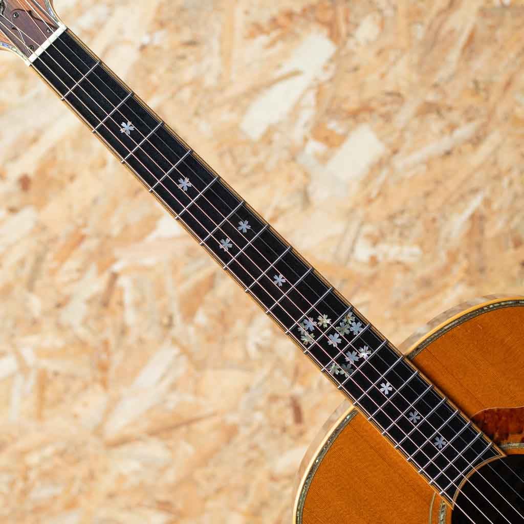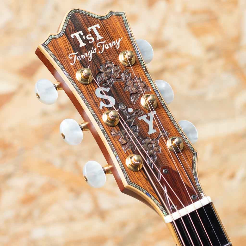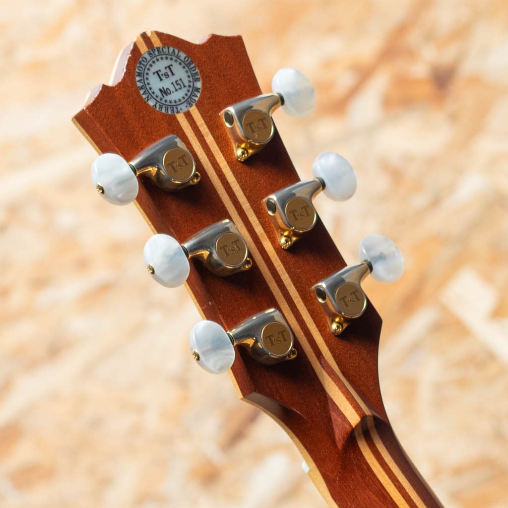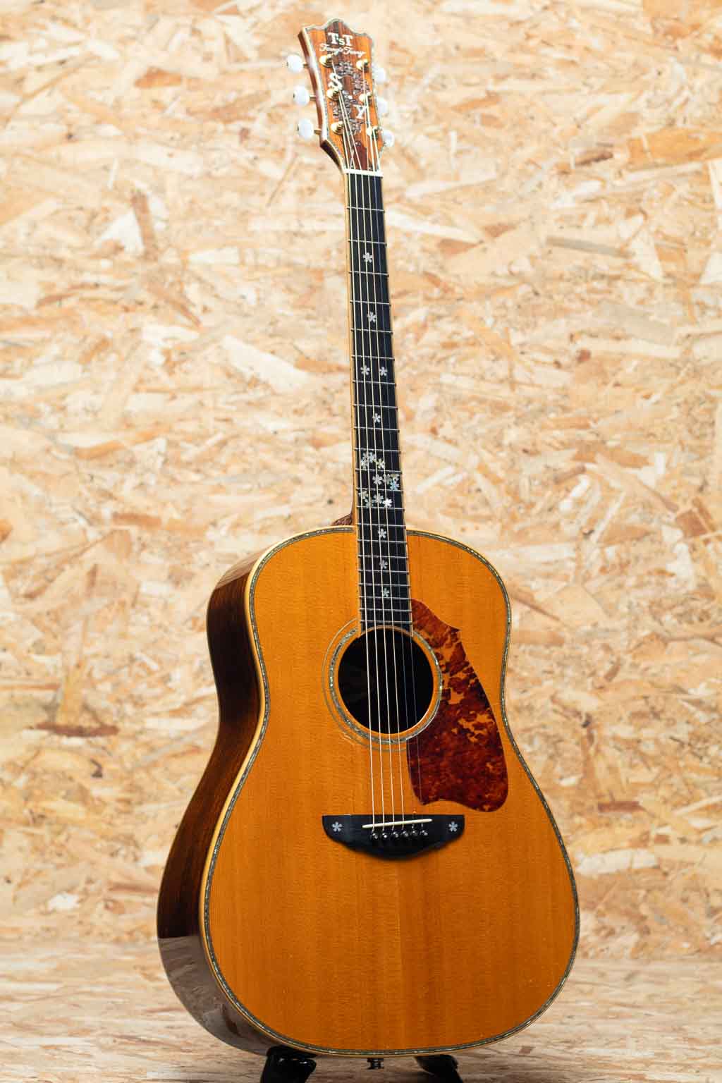 数々の楽器を手がけてきた国内屈指のギターデザイナー、テリー中本氏が1990年に立ち上げた"テリーズ・テリー"。国内外のトップアーティストらをも唸らせる完成度の高さ、独自のサウンドキャラクターは世界トップクラス。日本が誇るジャパニーズブランドです。本器はホンジュラスローズウッドをS&Bに採用したカスタムモデル”TJ-100”。1998年製USED品。目の詰まった極上のスプルーストップ、ホンジュラスローズウッドサイド&バック、マホガニー&メイプル積層ネック、エボニー指板&ブリッジ、ボディトップ&バックアバロンインレイ、アバロンロゼッタ、ハカランダ天神板、ゴトー510ゴールドペグ、本べっ甲ピックガード、メイプルバインディング、ボディ内セラック塗装、ノンスキャロップド・Xブレイシング。ヘッド天板には桜の彫刻とファーストオーナー様のイニシャルのインレイ、指板&ブリッジの桜インレイ、ネックヒールには唐草彫刻が施されており、なんとも絢爛で華美な佇まいです。どこまでも太く伸びやかな基音に煌びやかな音色の調和が心地よく響き渡る一本。使用に伴う擦り傷・小傷や打痕、トップには割れの補修がございますがネックコンディションは良好で演奏性もグッド。HIGHLANDER iP-2ピックアップが内蔵されており、ライブや収録でも即戦力。また、インナーラベルにはファーストオーナー様のお名前とテリー中本氏の手書きサインが施されております。ぜひご検討くださいませ。オリジナルハードケース付属。