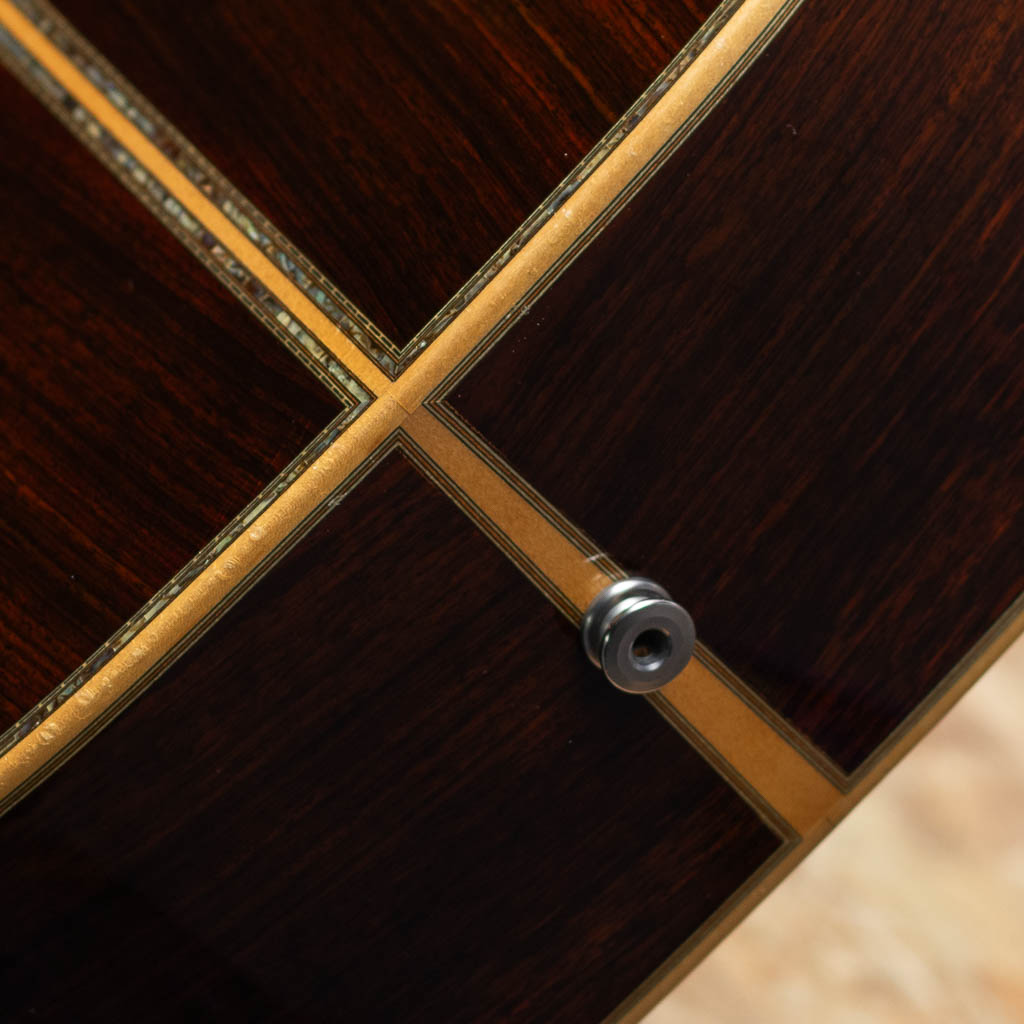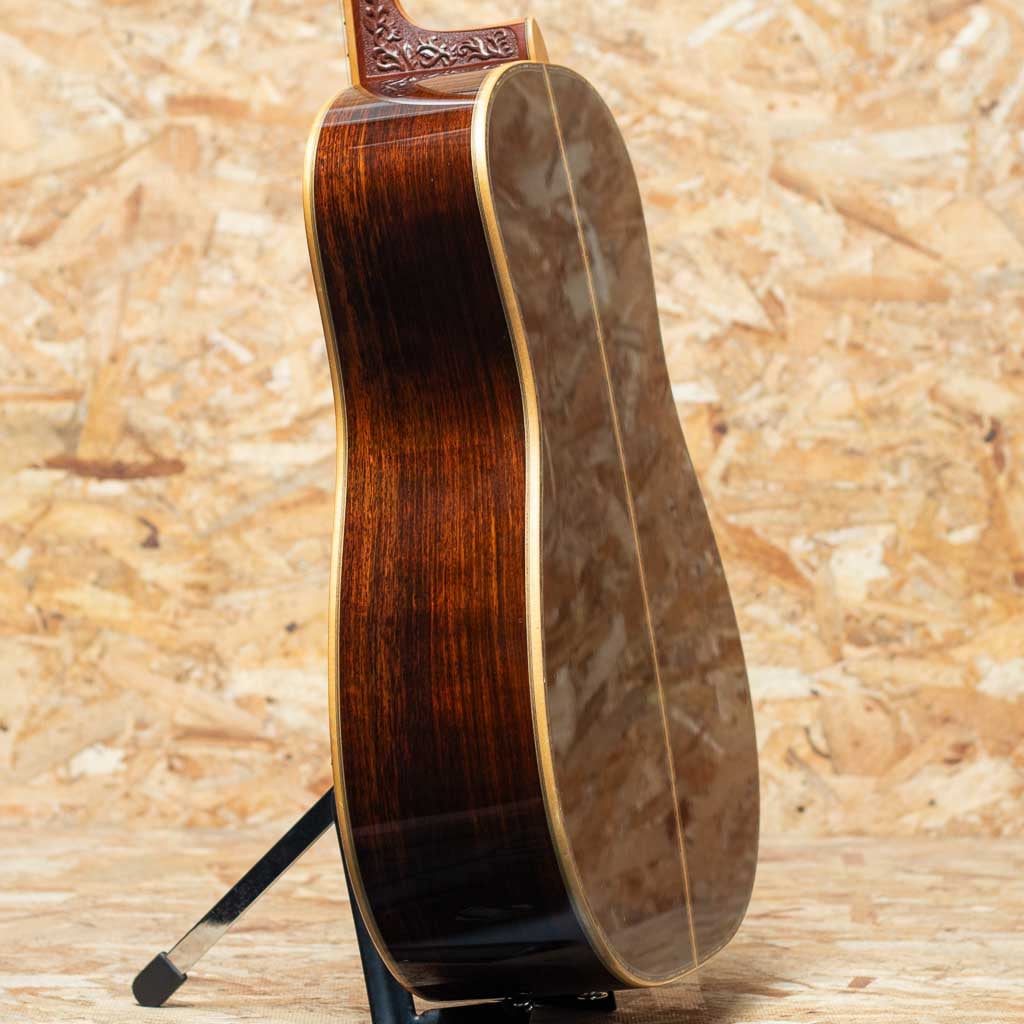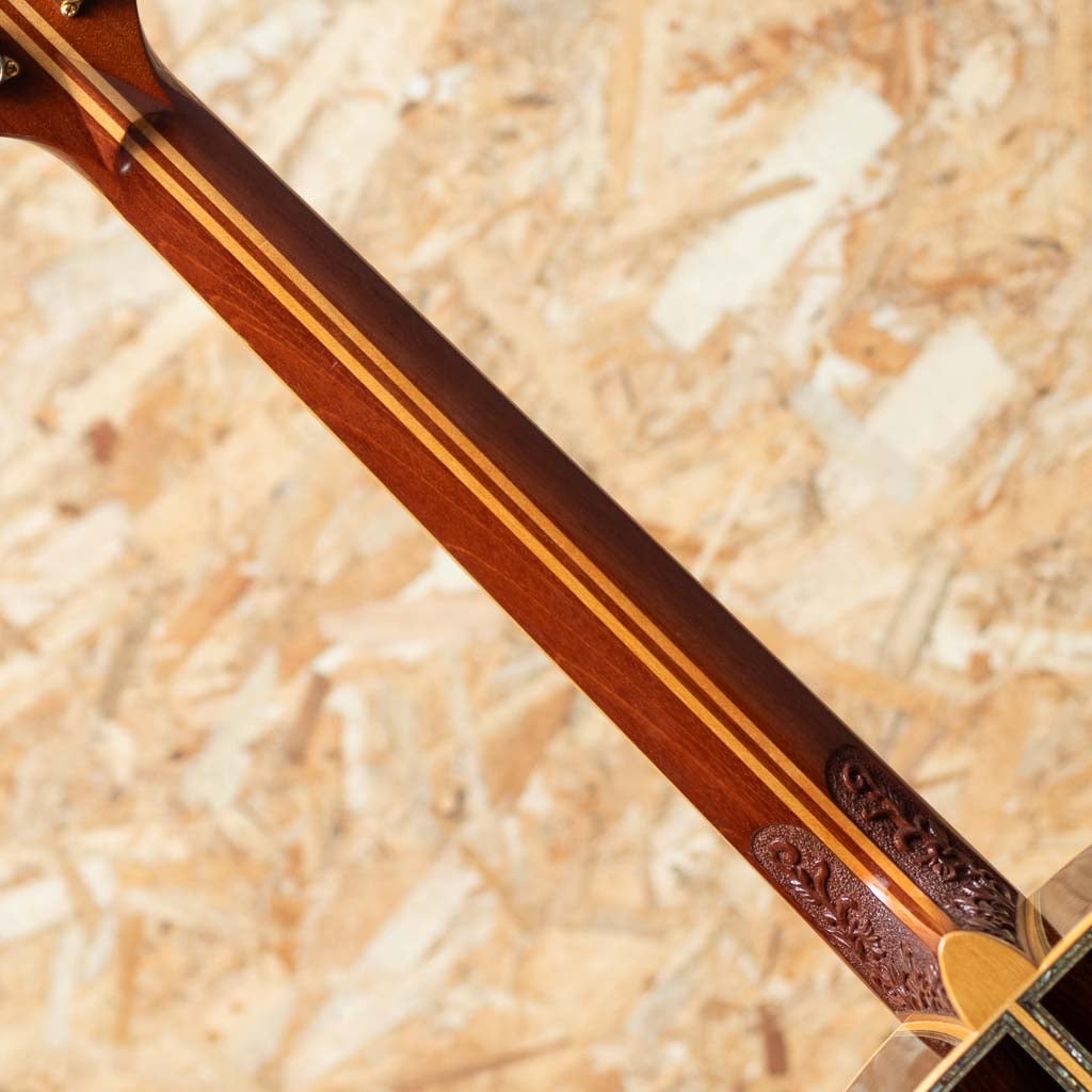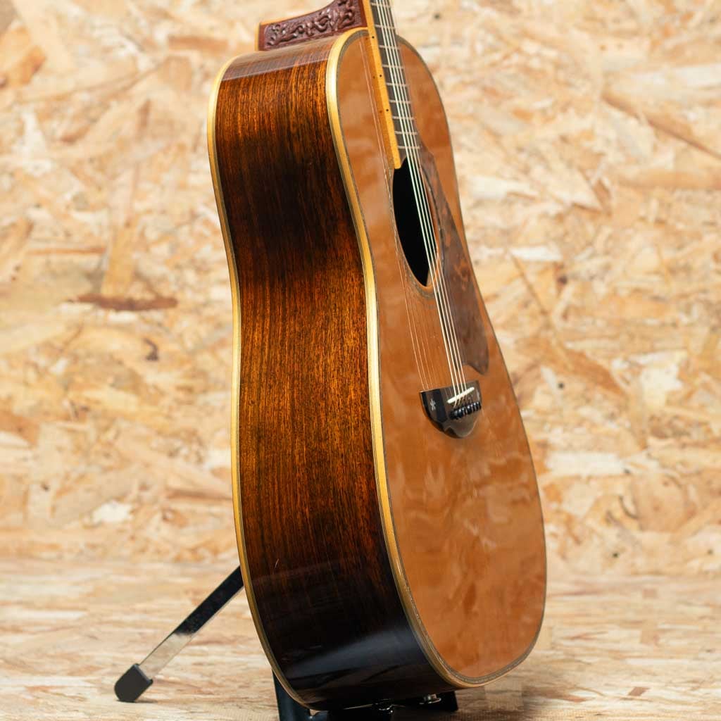 数々の楽器を手がけてきた国内屈指のギターデザイナー、テリー中本氏が1990年に立ち上げた"テリーズ・テリー"。国内外のトップアーティストらをも唸らせる完成度の高さ、独自のサウンドキャラクターは世界トップクラス。日本が誇るジャパニーズブランドです。本器はホンジュラスローズウッドをS&Bに採用したカスタムモデル”TJ-100”。1998年製USED品。目の詰まった極上のスプルーストップ、ホンジュラスローズウッドサイド&バック、マホガニー&メイプル積層ネック、エボニー指板&ブリッジ、ボディトップ&バックアバロンインレイ、アバロンロゼッタ、ハカランダ天神板、ゴトー510ゴールドペグ、本べっ甲ピックガード、メイプルバインディング、ボディ内セラック塗装、ノンスキャロップド・Xブレイシング。ヘッド天板には桜の彫刻とファーストオーナー様のイニシャルのインレイ、指板&ブリッジの桜インレイ、ネックヒールには唐草彫刻が施されており、なんとも絢爛で華美な佇まいです。どこまでも太く伸びやかな基音に煌びやかな音色の調和が心地よく響き渡る一本。使用に伴う擦り傷・小傷や打痕、トップには割れの補修がございますがネックコンディションは良好で演奏性もグッド。HIGHLANDER iP-2ピックアップが内蔵されており、ライブや収録でも即戦力。また、インナーラベルにはファーストオーナー様のお名前とテリー中本氏の手書きサインが施されております。ぜひご検討くださいませ。オリジナルハードケース付属。
