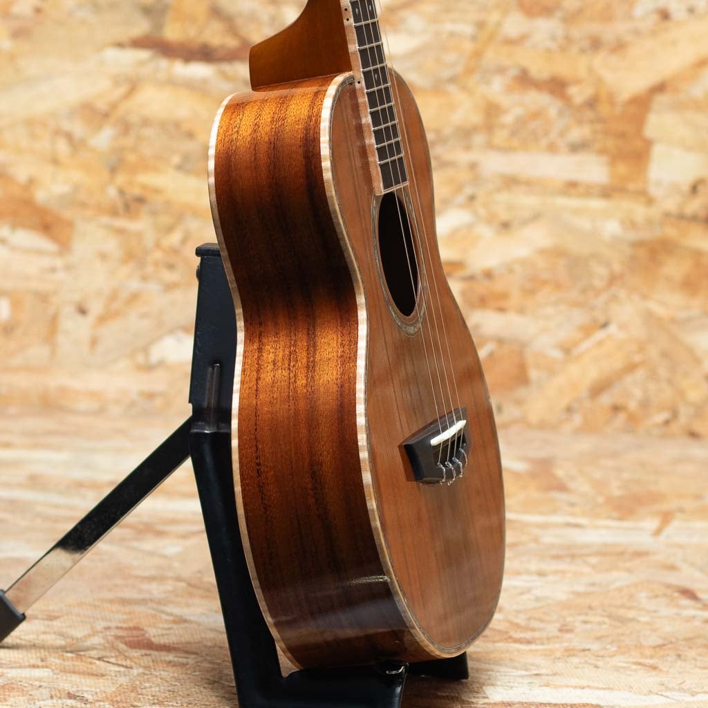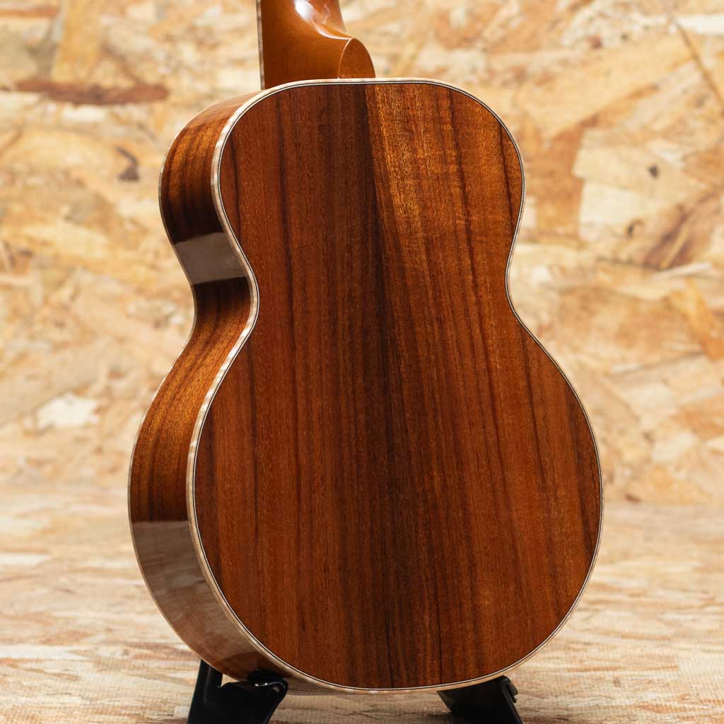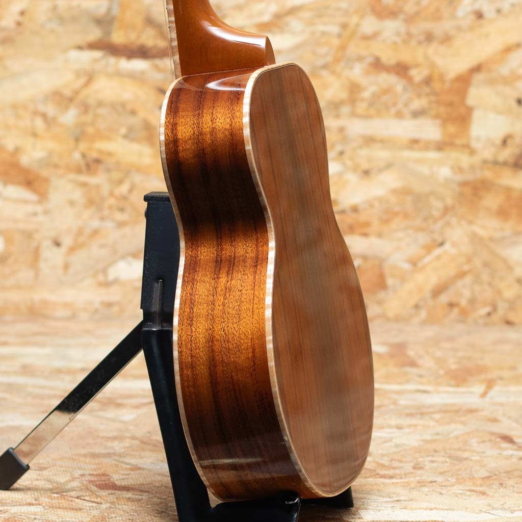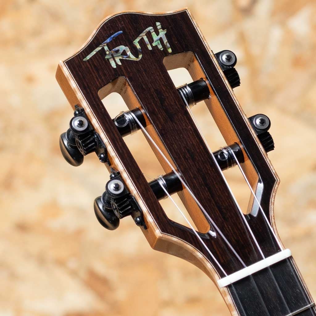 愛知県弥富市にて”福原紀文”氏と”小野寺忠史”氏により手掛けられる”TRUTHウクレレ”。IWAO氏や富永寛之氏、KYAS氏、HOOK氏などを始め数々のプレイヤーが愛用しています。本器はハワイアンコア材ボディのテナーモデルのカスタム品。スロテッドヘッド、メイプルバインディング、ボディトップのアバロントリムと高級感のあるルックスになっています。オリジナルのシェイプで深みが強く、太さ、甘さがあり、存在感のある音色です。ゆるいストラミングでも雰囲気のある優しい音色が得られ、様々なジャンルに柔軟に対応してくれます。プレイヤー向きな1本と言えるでしょう。上質なテナーウクレレをお探しの方にオススメの1本。
