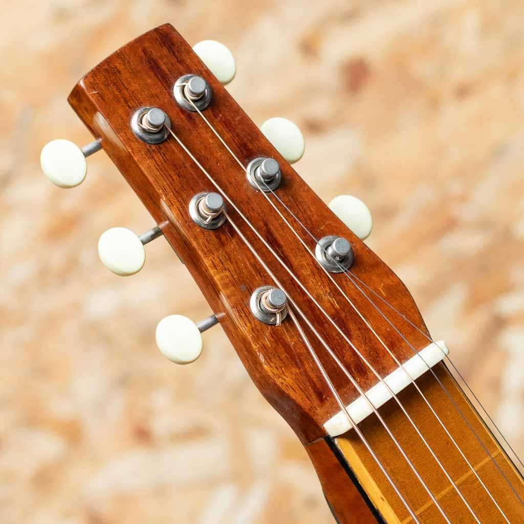 ハワイアン・スライドギターの代名詞ともいえる Weissenborn。その独特な構造と甘く伸びやかなトーンは、現在でも多くのスライドプレイヤーを魅了し続けています。こちらは1920年代に製作された”Style-2”。オリジナル個体として貴重な一本です。ボディには美しい木目のハワイアンコア材を使用。トップからサイド、バックに至るまで全面にコアが用いられ、経年により深みを増したゴールデンブラウンの風格あるルックスが目を引きます。Style-2はシンプルながらも上品なロープ柄のロゼッタデザインが施され、ボディーバインディング、指板エッジにも装飾が見られるモデルです。ネックとボディが一体となったホロウネック構造はWeissenborn最大の特徴。共鳴体としてのネックが豊かなサスティンと空気感のあるトーンを生み出します。スライド奏法においては、柔らかく包み込むような倍音と立ち上がりの良い中高域が絶妙にバランスしており、非常に優れたサウンドを誇ります。サイドのボディーエンド付近に2箇所のクラック補修歴、ペグはクルーソンスタイルへ交換、ブリッジ下トップセンターシームクラック補修跡、全体に薄いオーバースプレーが施されています。Fishman Rare Earth Mic Blendを搭載しており、ライブでのそのエアー感ある響きを再現します。年代を考慮すると良好なコンディションをキープしており、演奏性、鳴りともに申し分ありません。1920年代のオリジナル Weissenbornは現存数も少なく市場でもなかなか出会うことが少なくなりつつあるコレクタブルな逸品です。ビンテージスライドの魅力を存分に味わいたい方におすすめいたします。汎用Gigbag付属