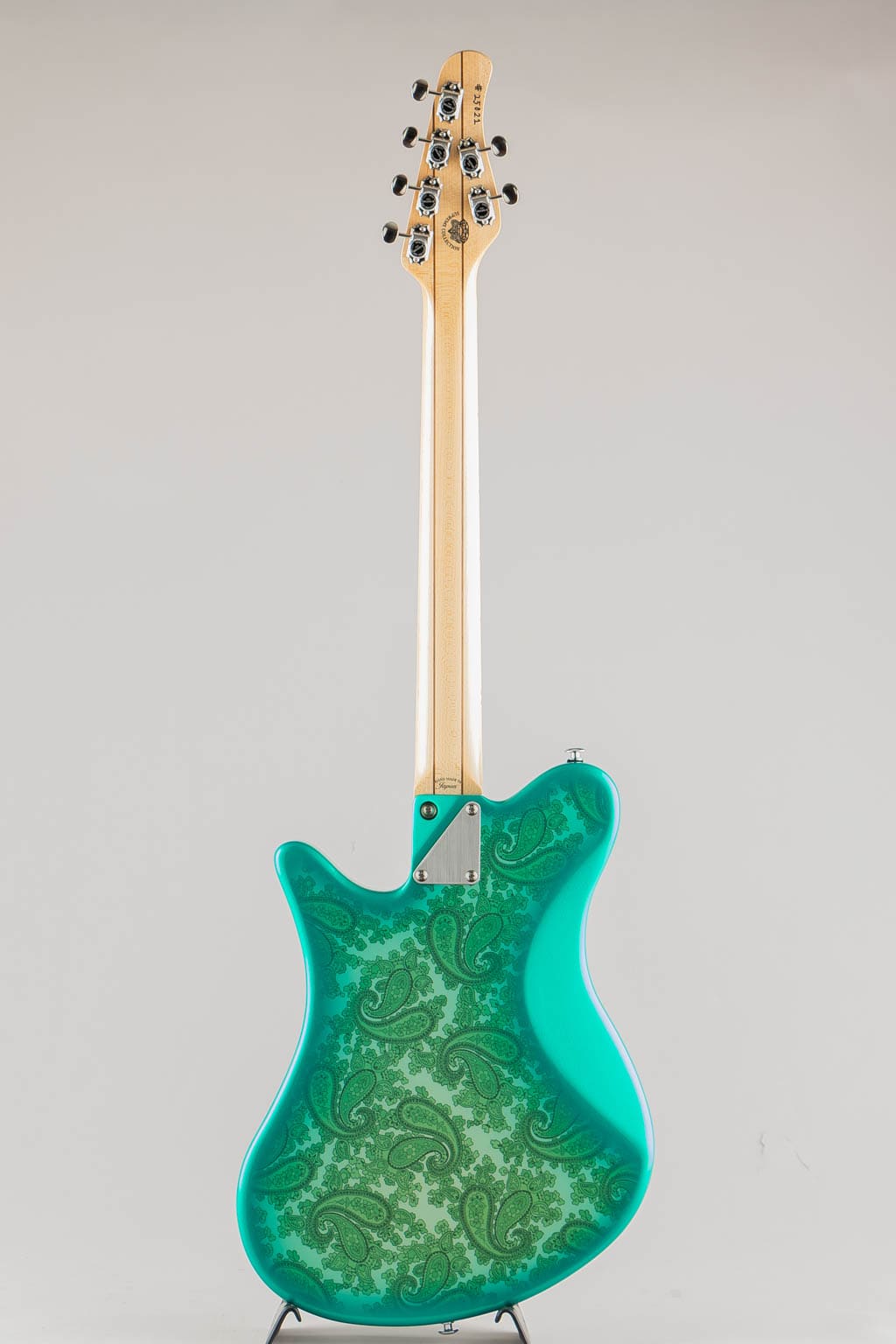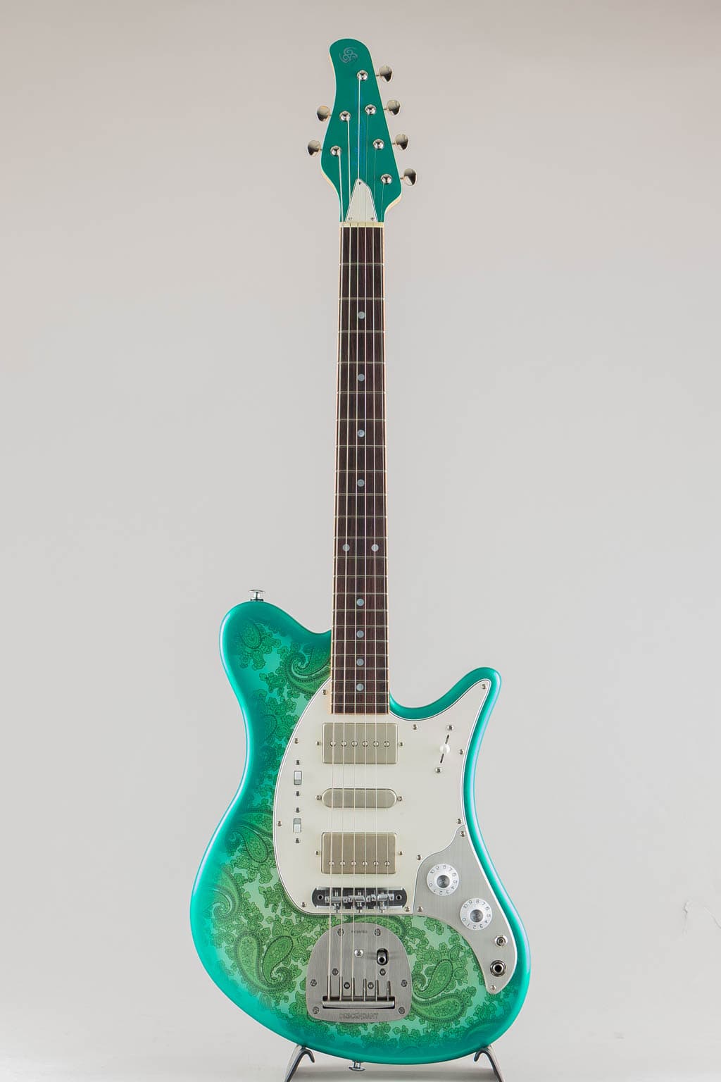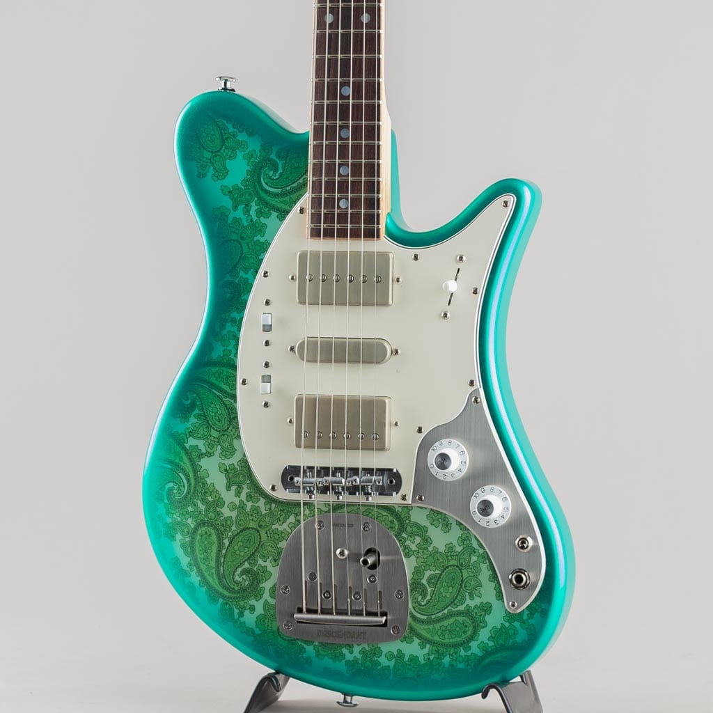 今回入荷しました1本はインパクトのあるグリーンペイズリーとネックボディともにラッカー塗装を採用したオーダーモデルでございます。ピックアップは国産ハンドメイドピックアップブランド"Euphoreal"製で統一。リアにはCustom Humbucker、センターにCustom SC、フロントはCustom P-90のSSHコンビネーションとなっております。一風変わったコントロールはフロント/リアの切り替えを基本とし、センターピックアップ用のスイッチを別途搭載。これにより7通りのサウンドバリエーションを選択可能としております。