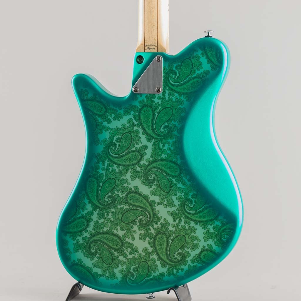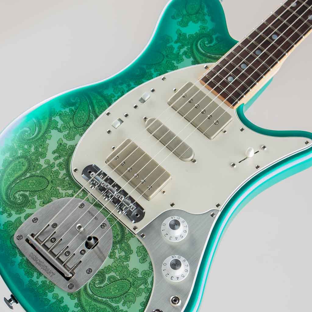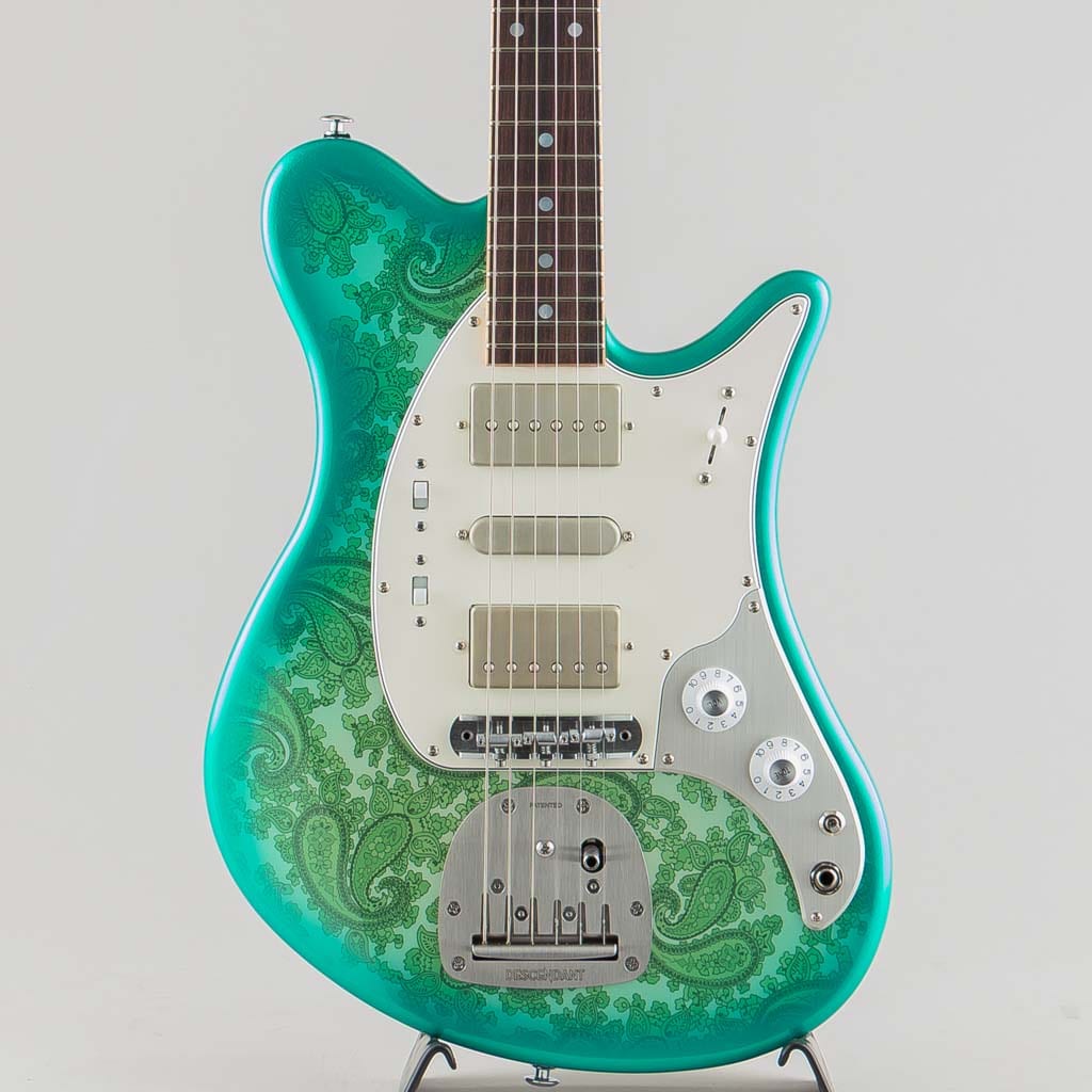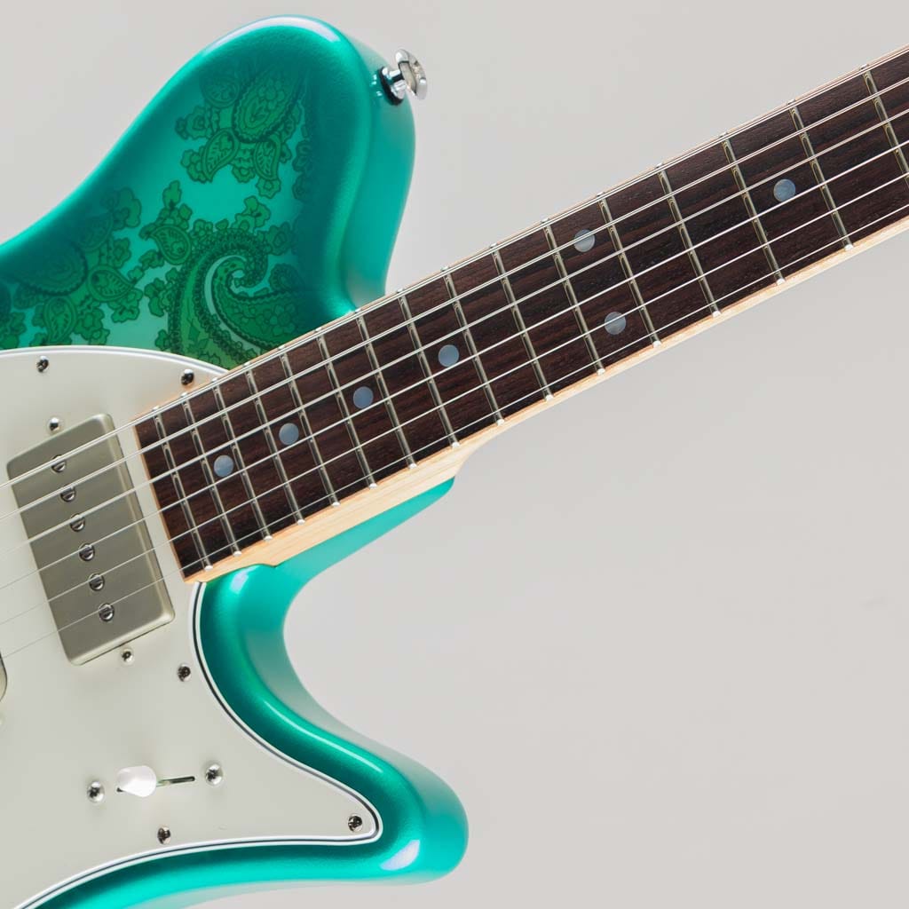 今回入荷しました1本はインパクトのあるグリーンペイズリーとネックボディともにラッカー塗装を採用したオーダーモデルでございます。ピックアップは国産ハンドメイドピックアップブランド"Euphoreal"製で統一。リアにはCustom Humbucker、センターにCustom SC、フロントはCustom P-90のSSHコンビネーションとなっております。一風変わったコントロールはフロント/リアの切り替えを基本とし、センターピックアップ用のスイッチを別途搭載。これにより7通りのサウンドバリエーションを選択可能としております。