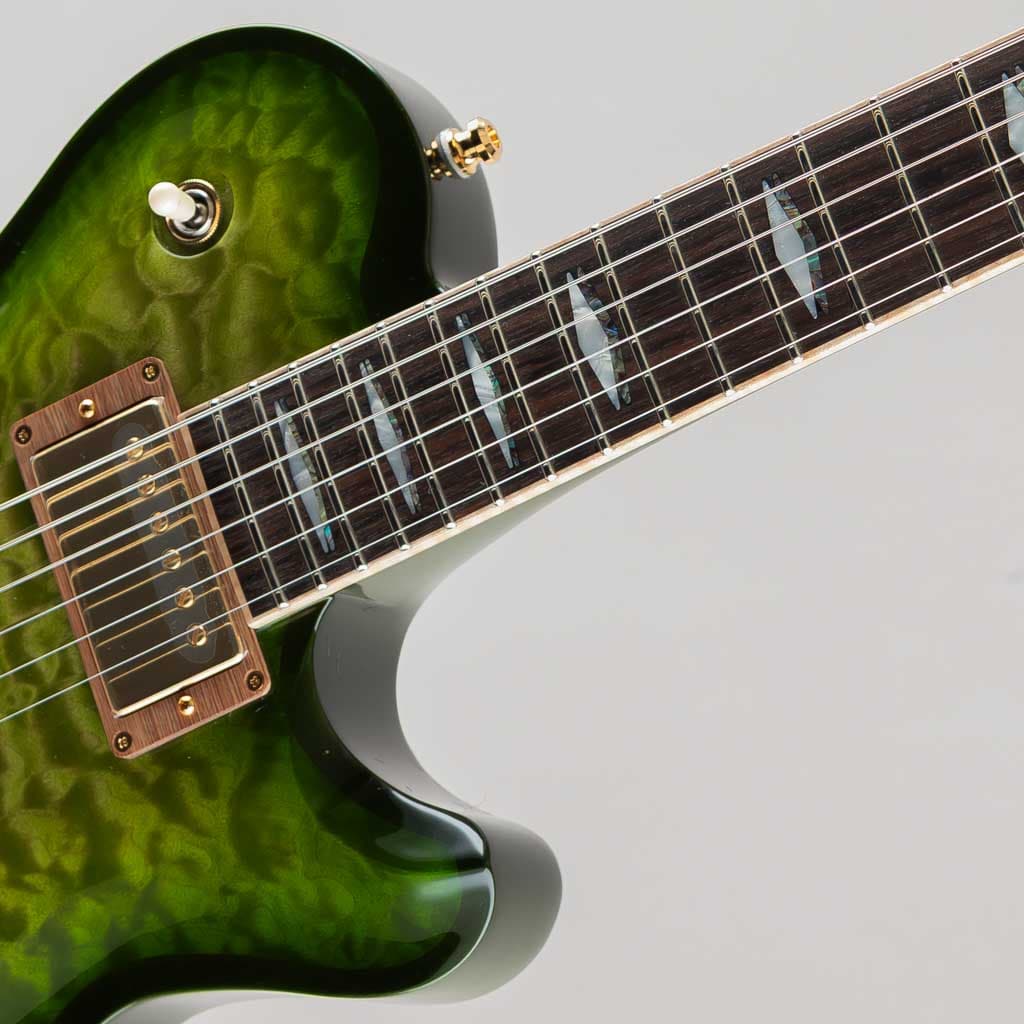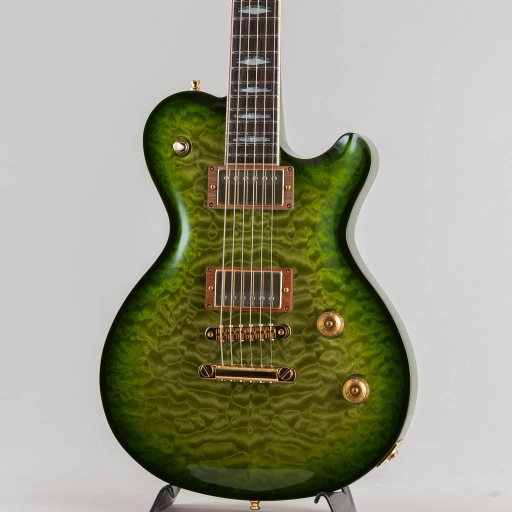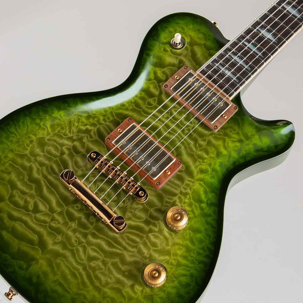 セットネックモデルのフラグシップであるExpert FLAME(EFL)をベースに細部にまでこだわったMVFL200QM。カラーは国産ならではの意を込めて緑茶バーストと名付けました。見るものを魅了する鮮やかな5Aグレードのキルトメイプルとホンジュラスマホガニーボディ。ボディトップは通常の貼り合わせとは異なり、バック材を中抜きしトップ材を落とし込む入れ子構造を採用。過去Virtuosoシリーズにのみ行われた技法を特別にリクエストいたしました。設置面積が広く、よりタイトにより鳴りを活かした職人の技術が垣間見えます。ネックは剛性も考慮したマホガニー&パープルハートの5ピースネックにローズウッド指板。サイドバインディングにはこちらも杢の美しい5Aグレードのフレイムメイプルを使用。今回の木材は全て現地で選定し数多くある銘木からハンドセレクトさせていただきました。